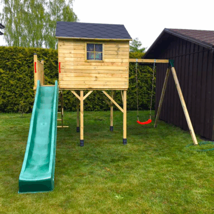 Original price was: €899.00.€799.00Current price is: €799.00.Medinis vaikų žaidimų namelis “Koriukas” su dvigubomis sūpynėmis