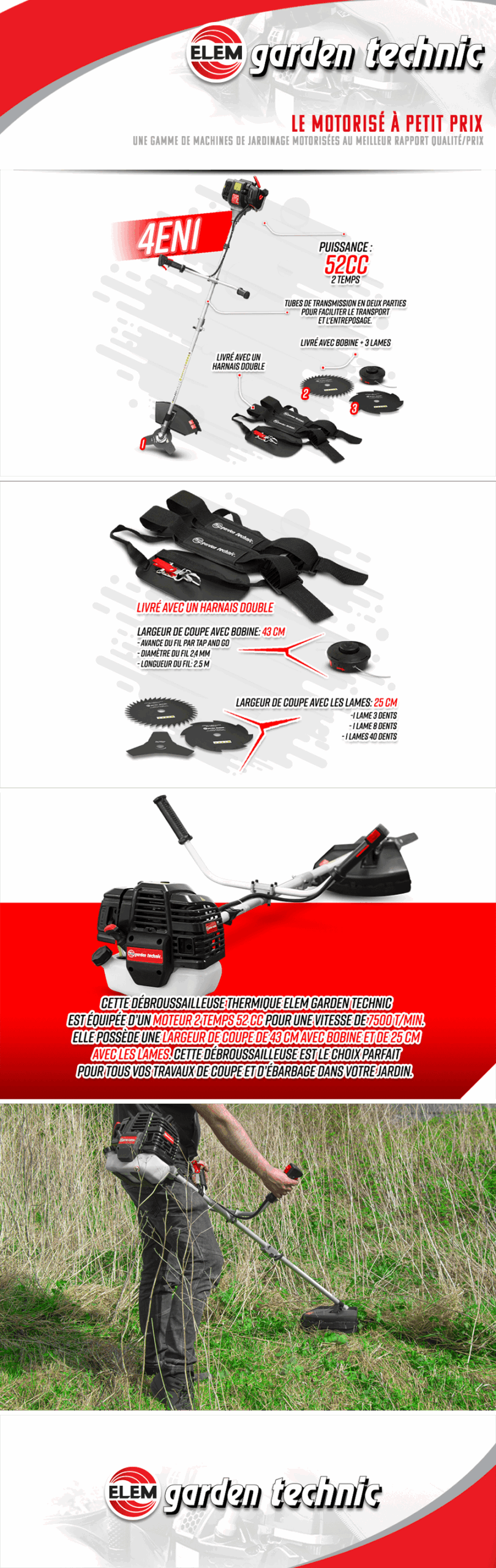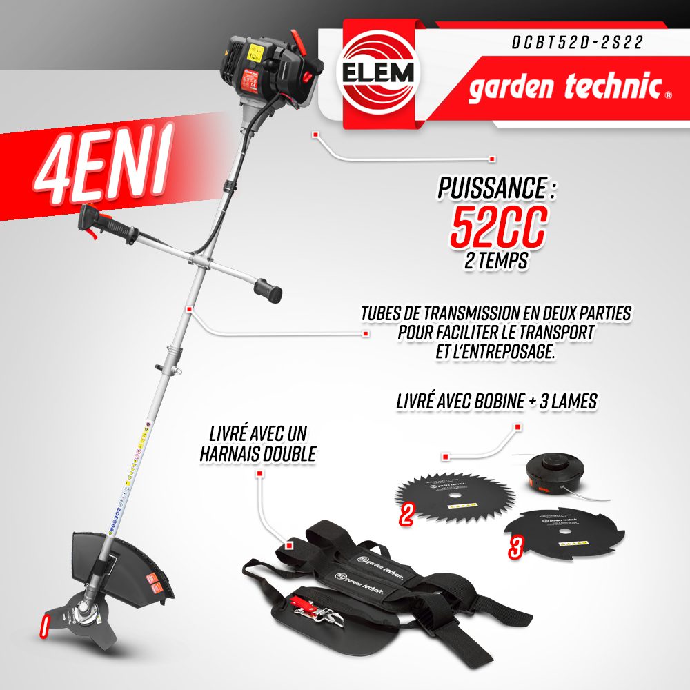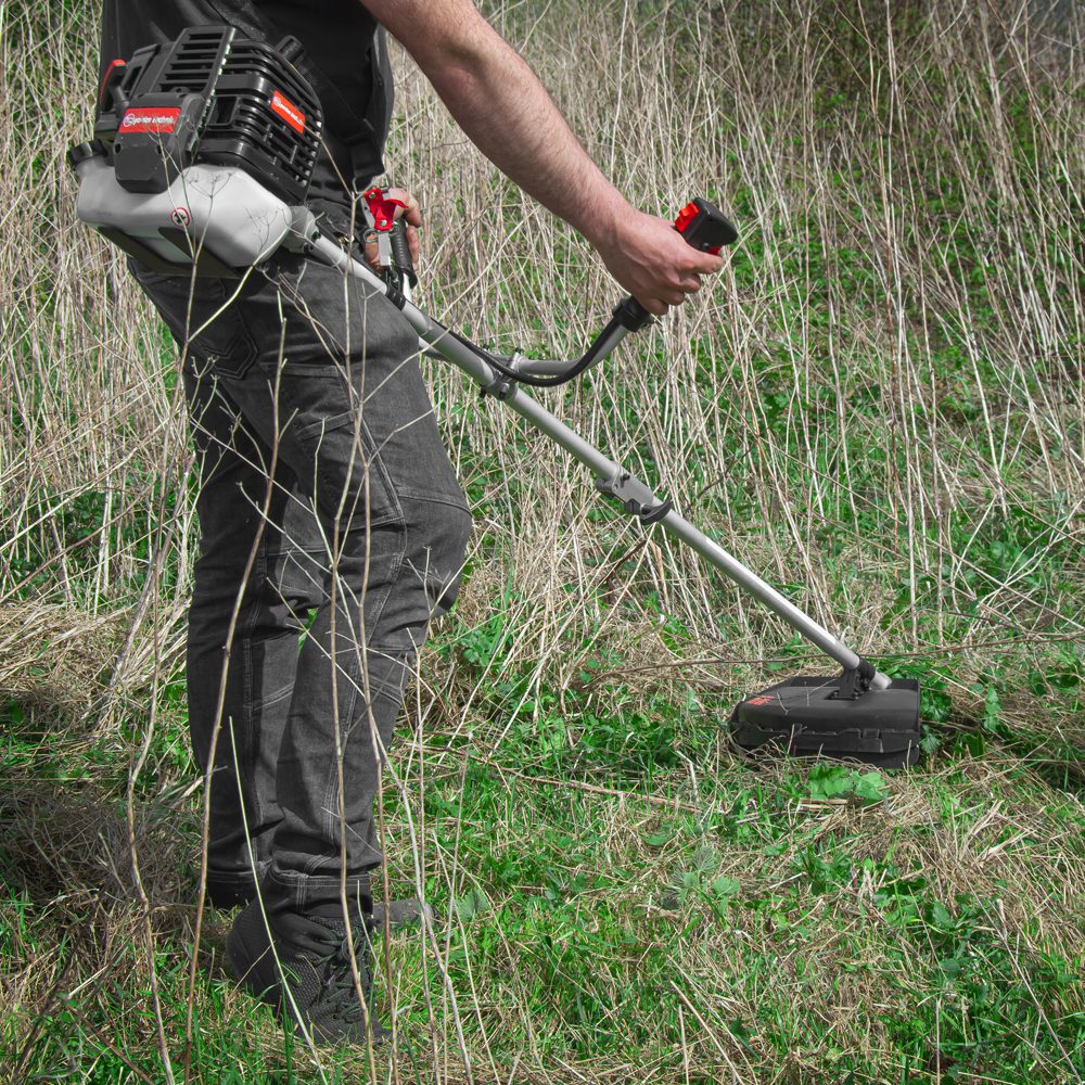 Šią žoliapjovę-krūmapjovę varo 2 taktų 52 CC variklis, kurio sūkių dažnis 7500 aps/min. Jos pjovimo plotis 43 cm su rite ir 25 cm su peiliais. Ji yra puikus pasirinkimas visiems jūsų sodo pjovimo ir genėjimo darbams.