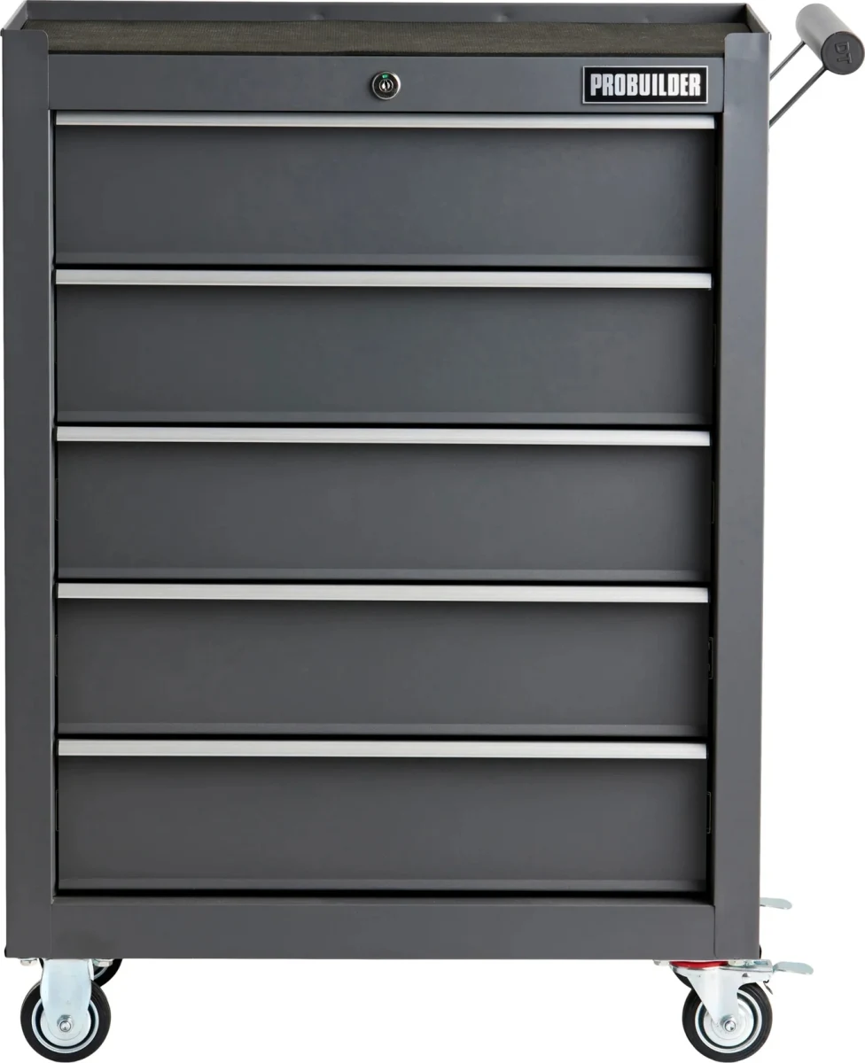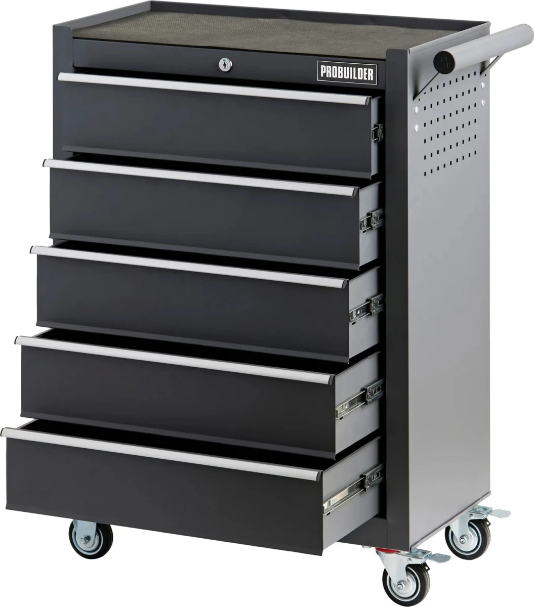 “Probuilder“ dirbtuvių vežimėlis yra efektyvus sprendimas įrankiams laikyti ir transportuoti dirbtuvėse. Penki erdvūs, užrakinami stalčiai ir tvirta plieninė konstrukcija suteikia vežimėliui saugumo, funkcionalumo ir mobilumo derinį. Kiekvienas stalčius aprūpintas neslystančiais EVA kilimėliais, kad įrankiai būtų stabilūs, o viršutinis darbinis paviršius su EVA kilimėliu suteikia papildomos vietos smulkiems darbams.