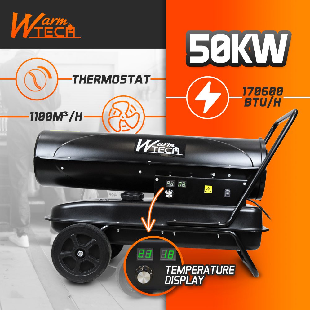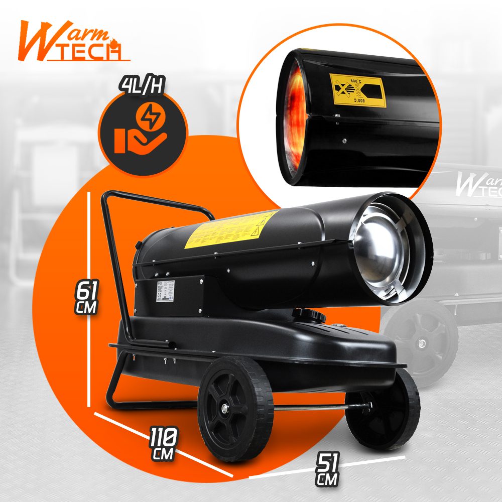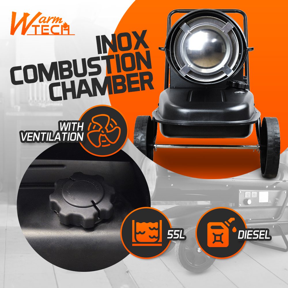 Profesionalus dyzelinis šildytuvas, skirtas didelių patalpų ir atviresnių erdvių šildymui. Galinga konstrukcija su ratukais ir transportavimo rankena užtikrina mobilumą, o talpus 55 litrų bakas leidžia dirbti ilgą laiką be papildymo. Nerūdijančio plieno degimo kamera su ventiliacija užtikrina efektyvų ir saugų darbą, o termostatas su ekranu leidžia tiksliai nustatyti bei kontroliuoti temperatūrą.