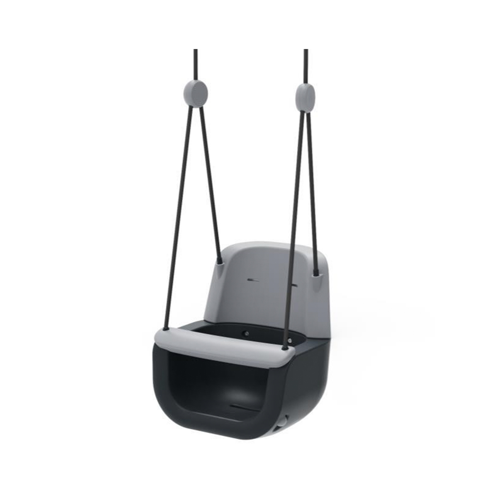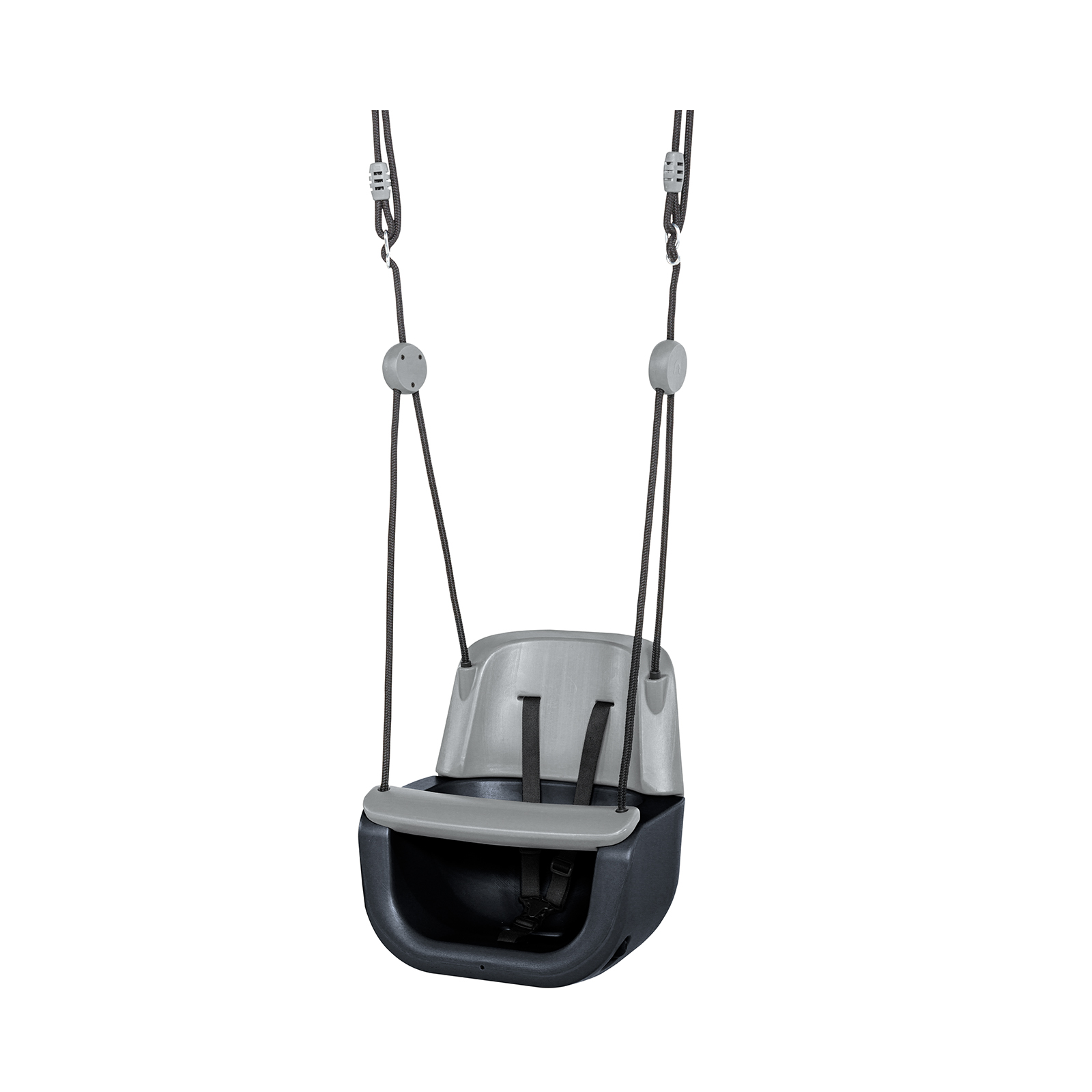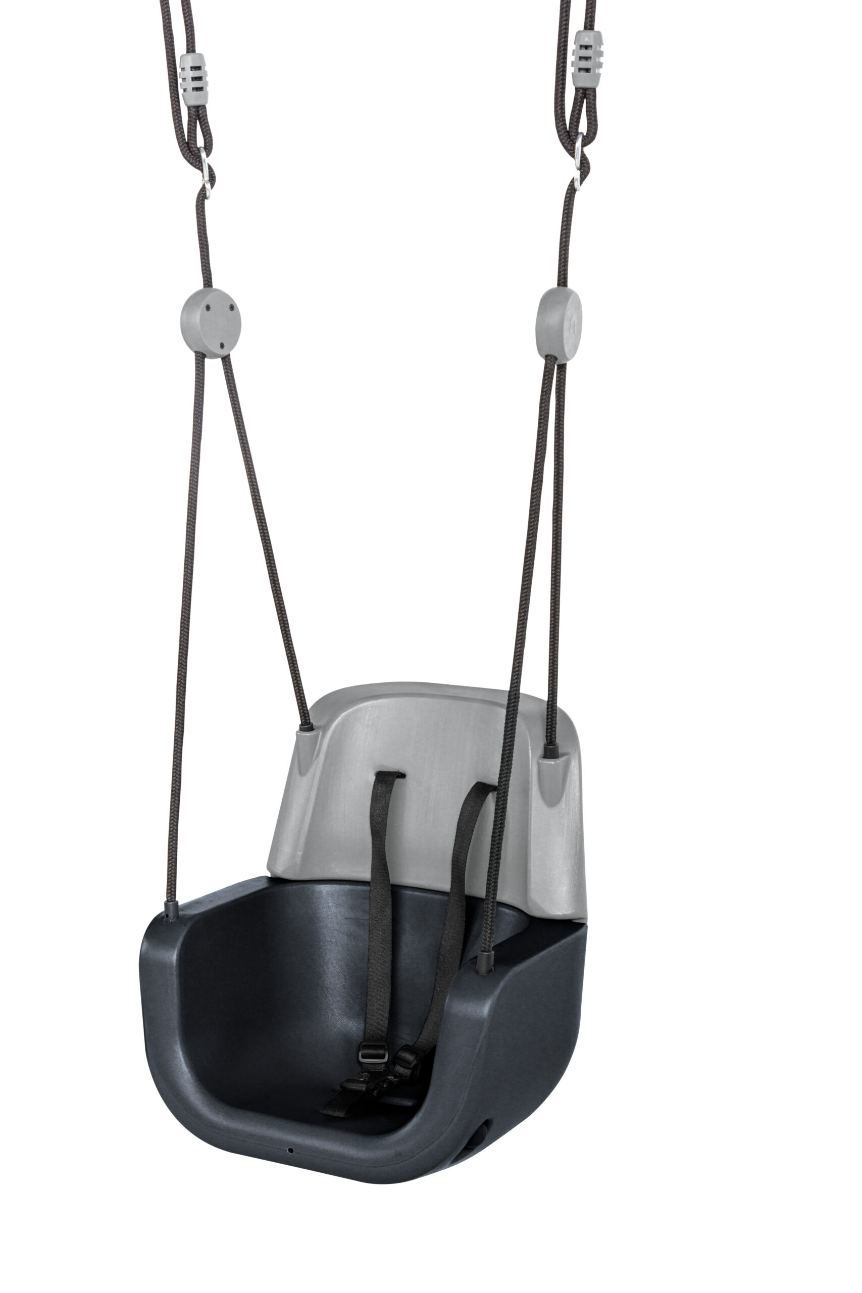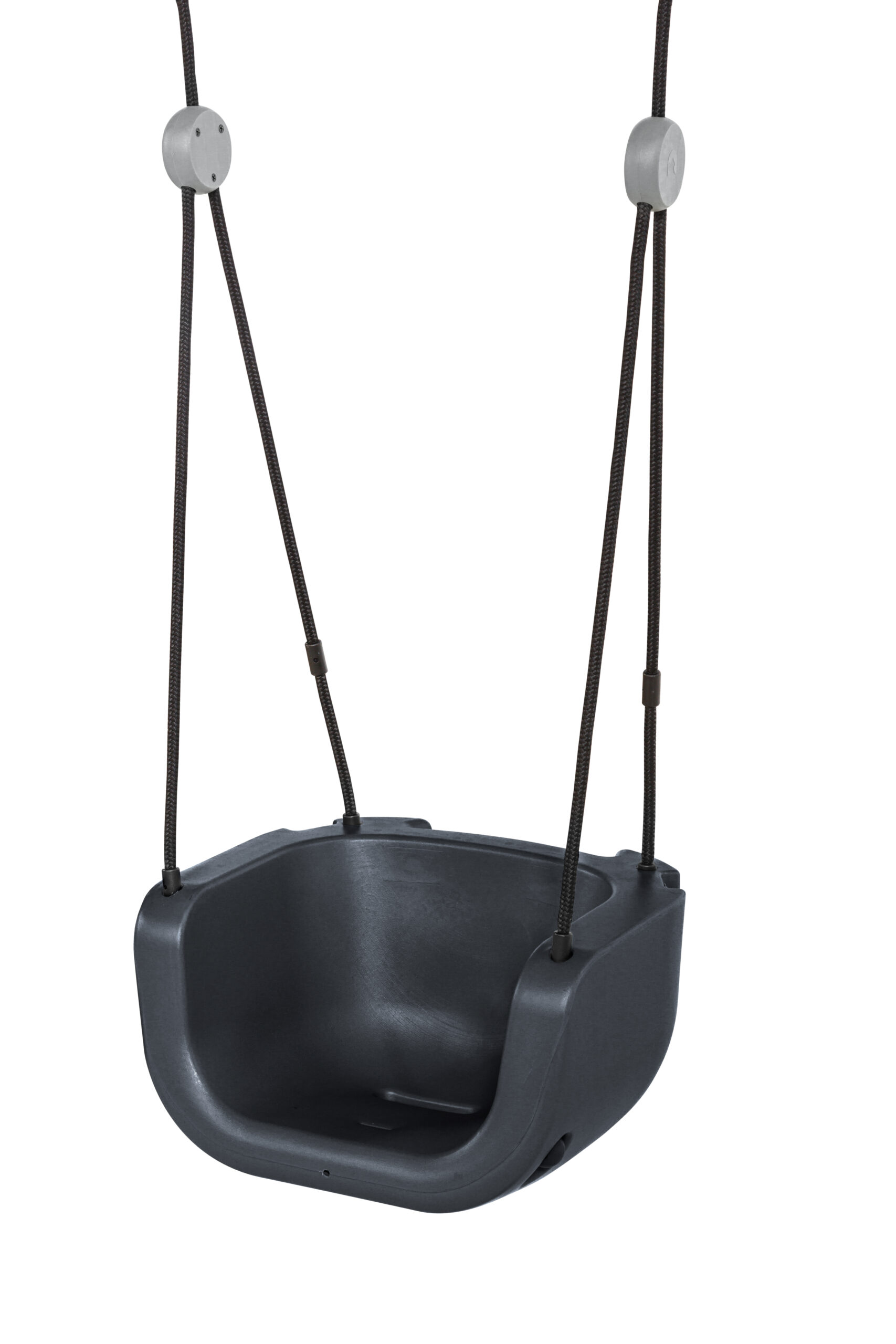 Sūpynės pagamintos iš HDPE smūgiams atsparaus plastiko, užtikrinančio ilgaamžiškumą. 3 taškų saugos diržai patikimai prilaiko mažylį, suteikdami maksimalų saugumą. Juodos spalvos pintos virvės yra tvirtos, neslidžios ir švelnios mažų rankyčių pirštukams. Šiuolaikiškas ir išskirtinis dizainas ir antracito bei pilkos spalvos paletė suteikia modernumo ir stilingai dera prie bet kokios žaidimų aikštelės.