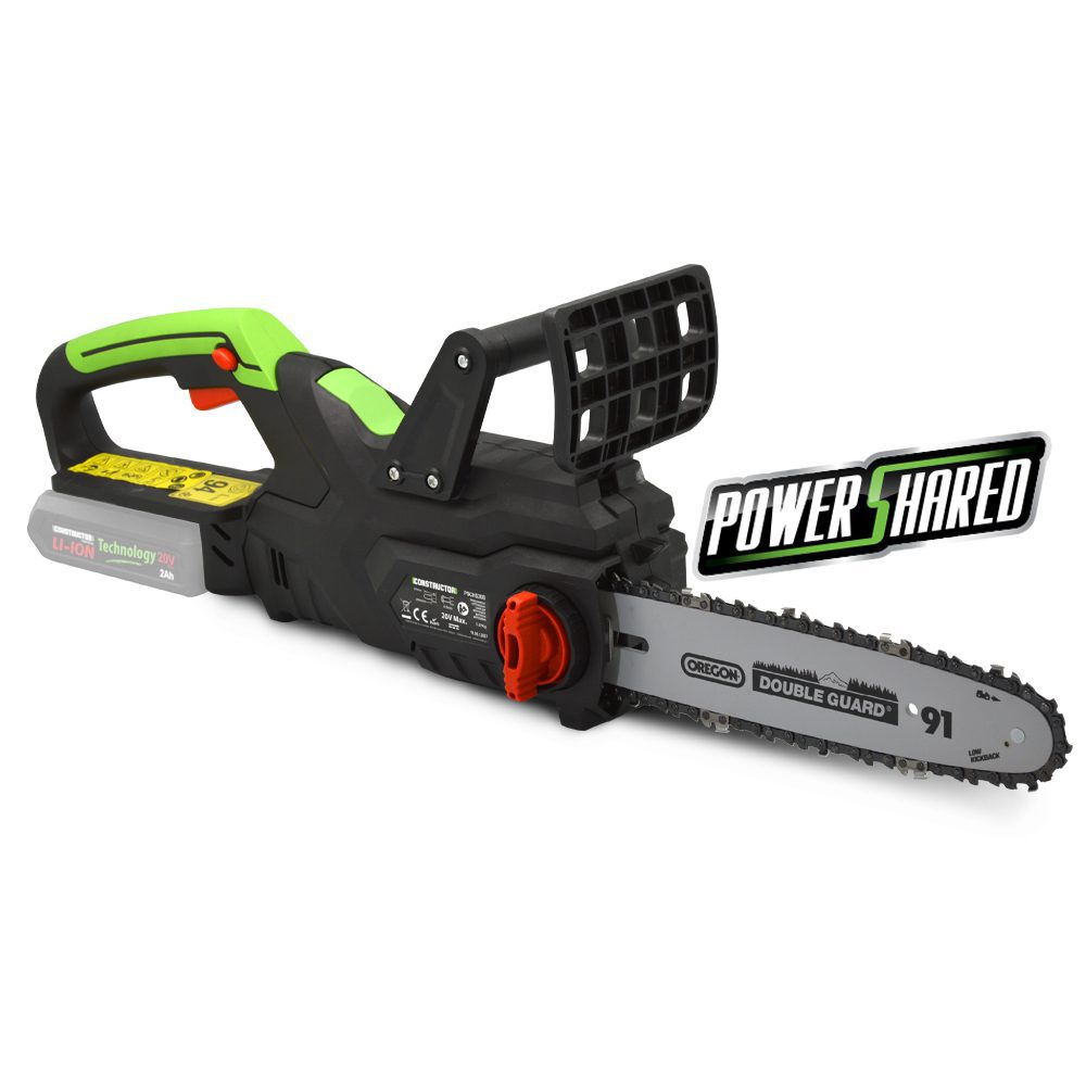 Akumuliatorinis grandininis pjūklas PSCHS20B pristatomas be akumuliatoriaus ir įkroviklio. Atskirai įsigysite 2 Ah (PSBAT20-2A) arba 4 Ah (PSBAT20-4A) akumuliatorių ir greitąjį įkroviklį (PSCHBAT20). Jie tinka daugumai Constructor įrankių.