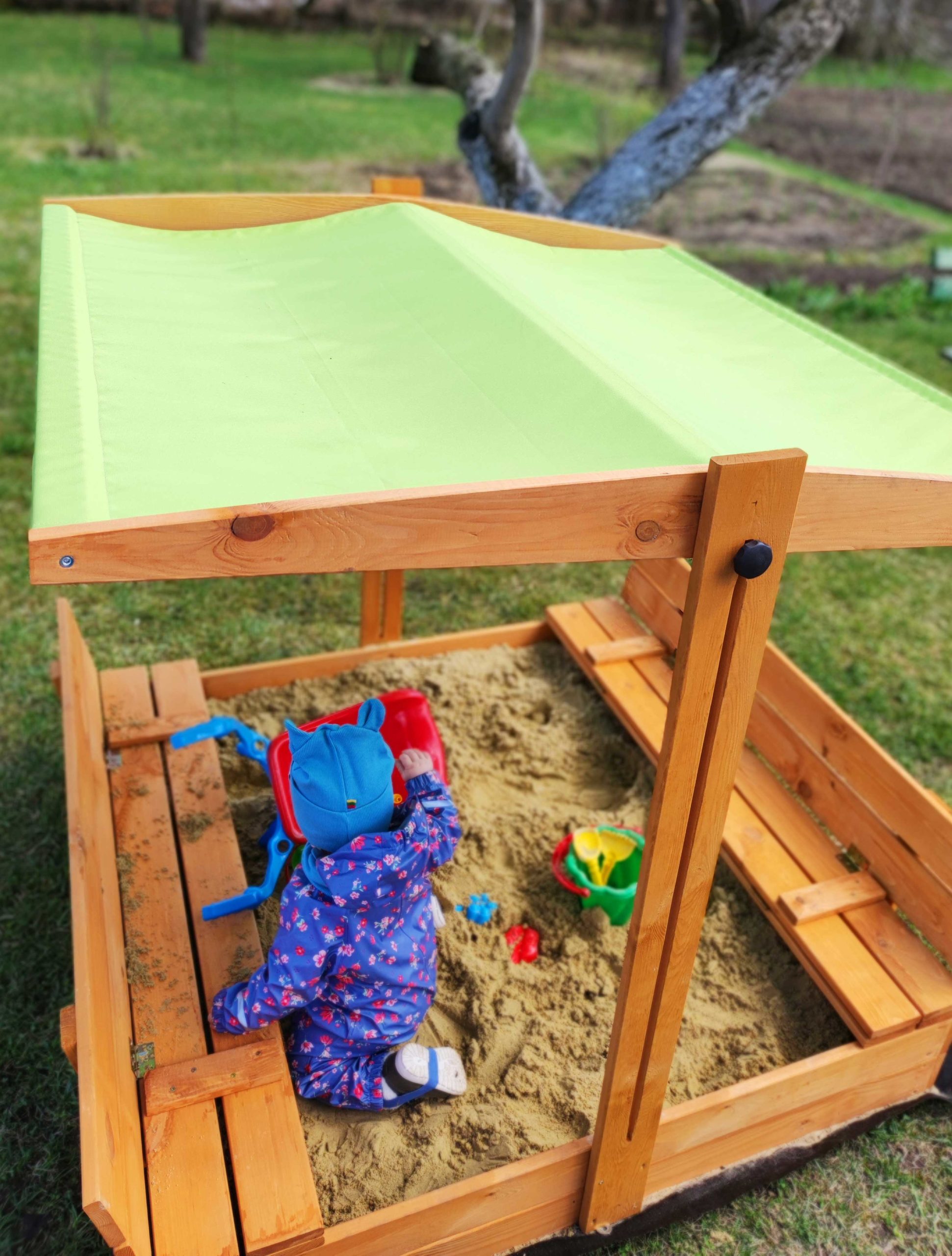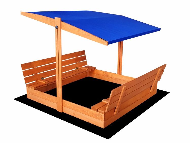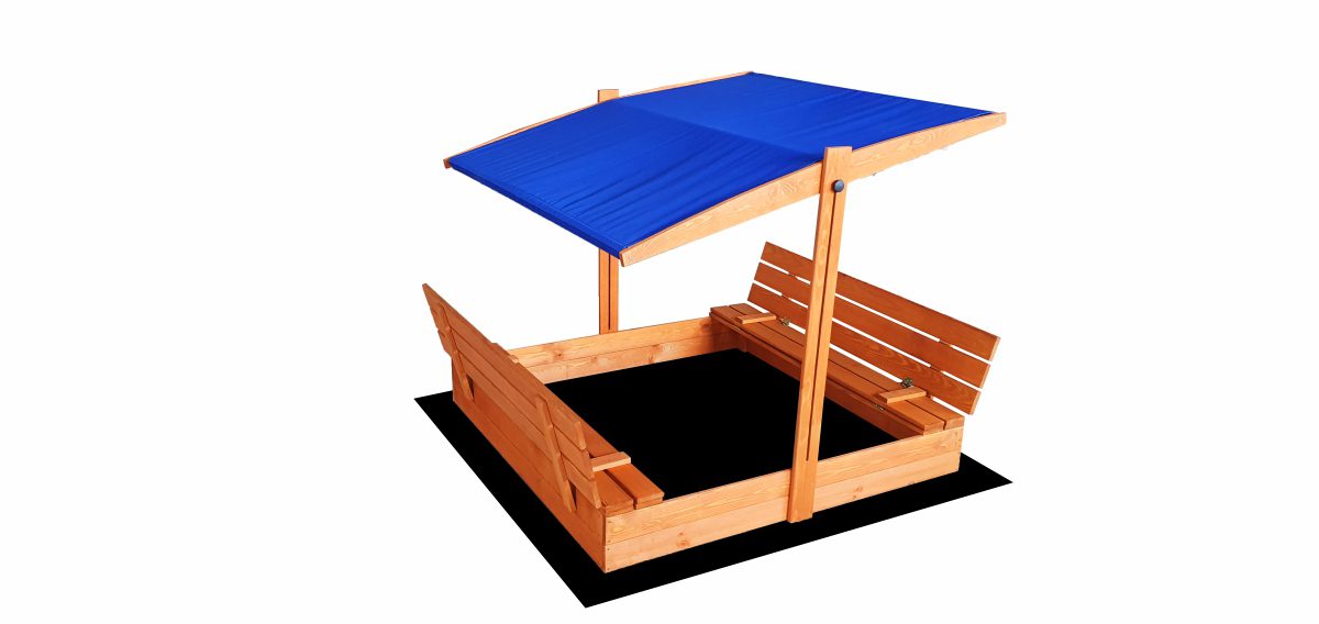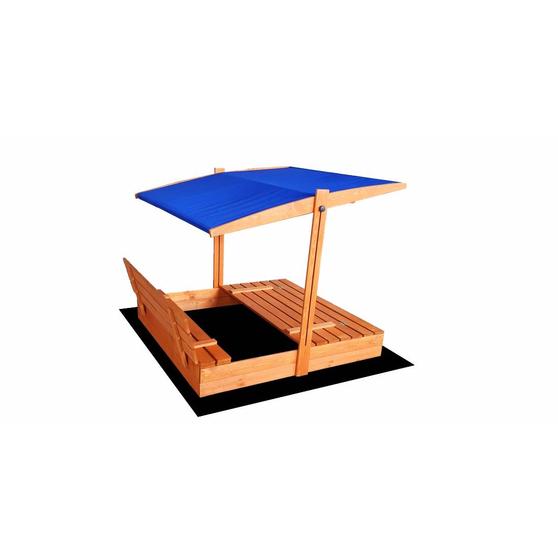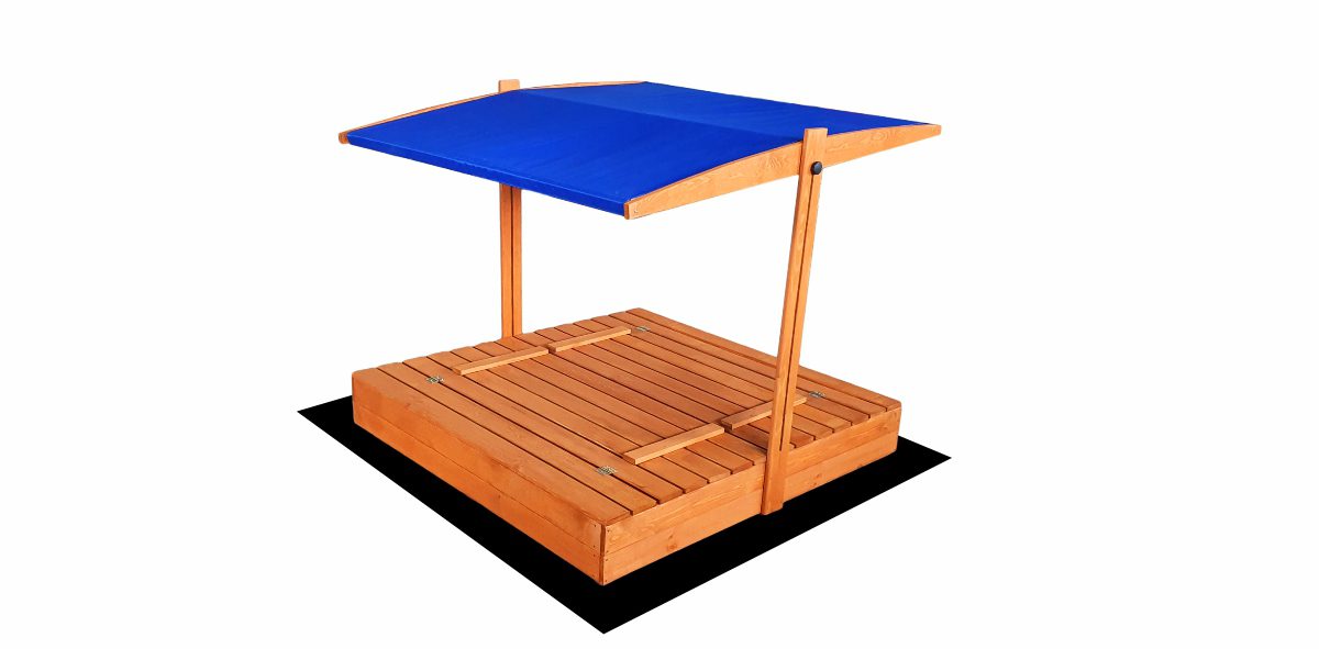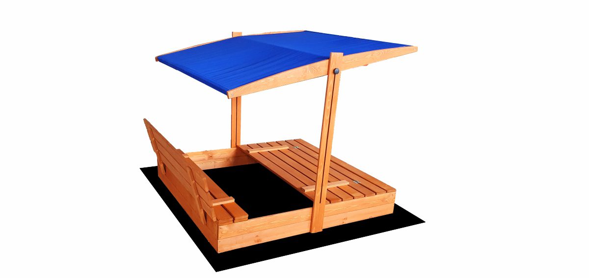 Praktiška ir funkcionali smėlio dėžė komplektuojama su dangčiu, kuris apsaugo smėlį nuo neigiamų aplinkos veiksnių ar gyvūnų teršimo ir transformuojasi į suoliukus šonuose. Komplektacijoje esantis mėlynos spalvos stogelis taps puikia apsauga ne tik nuo kaitrios saulės spindulių, bet ir lietaus. Stogelio aukštis reguliuojamas.