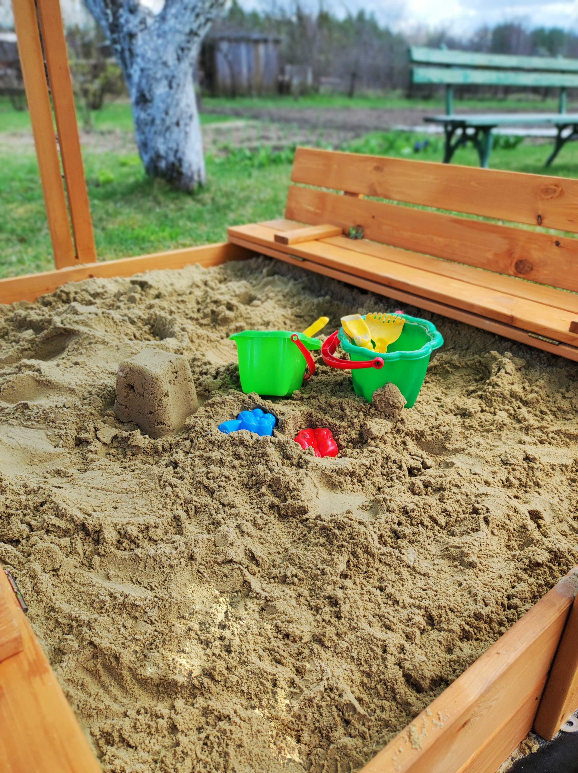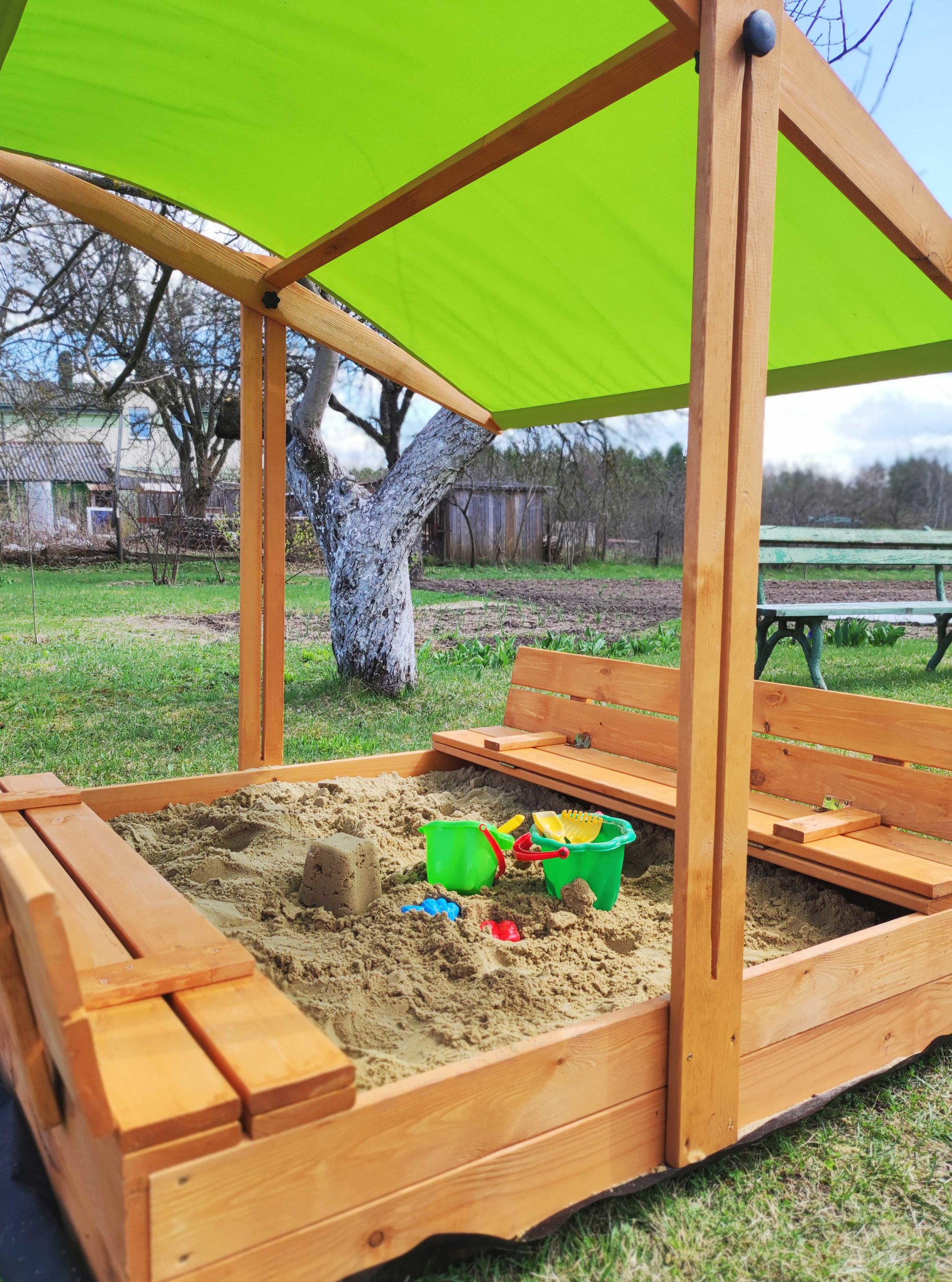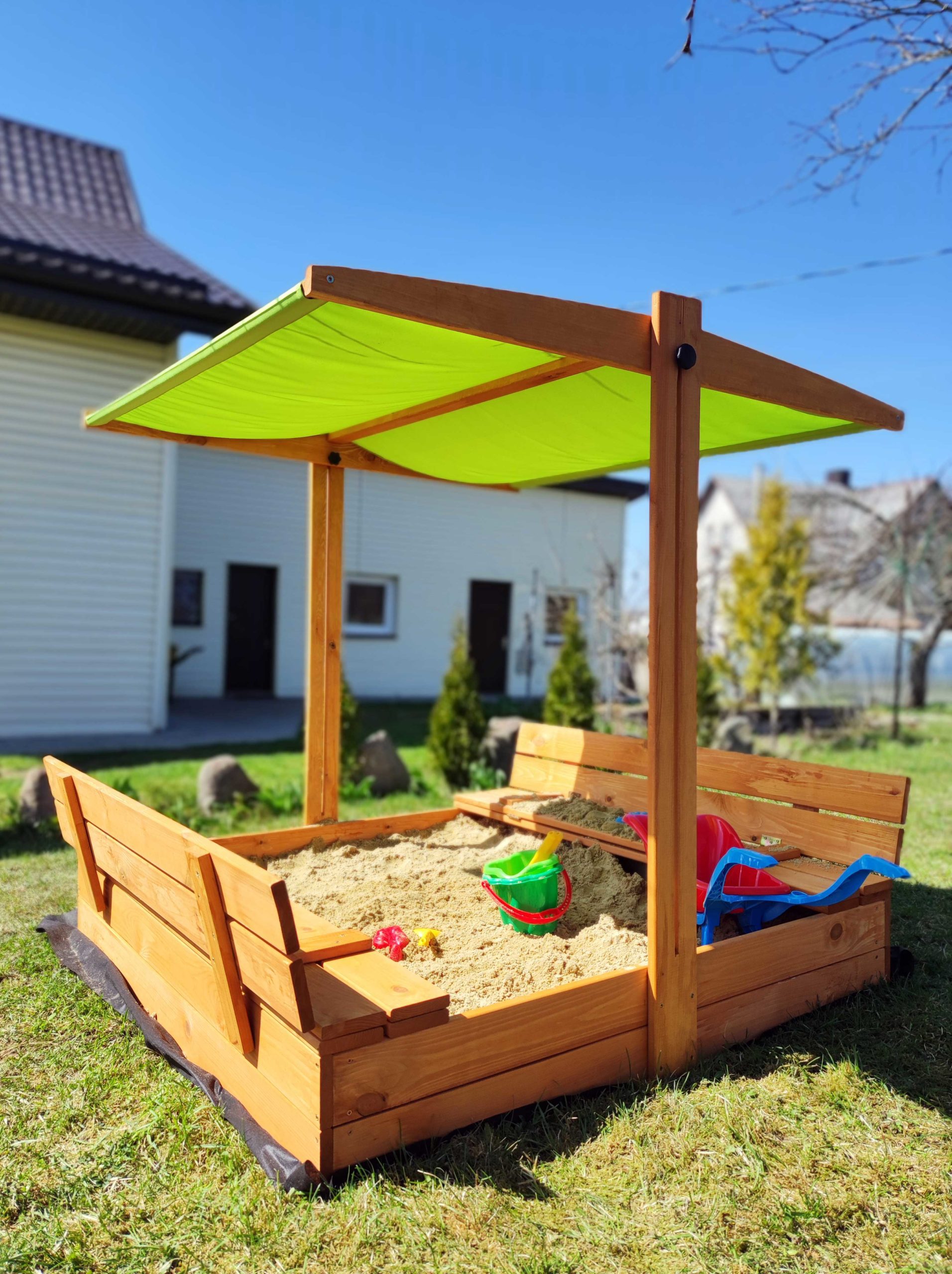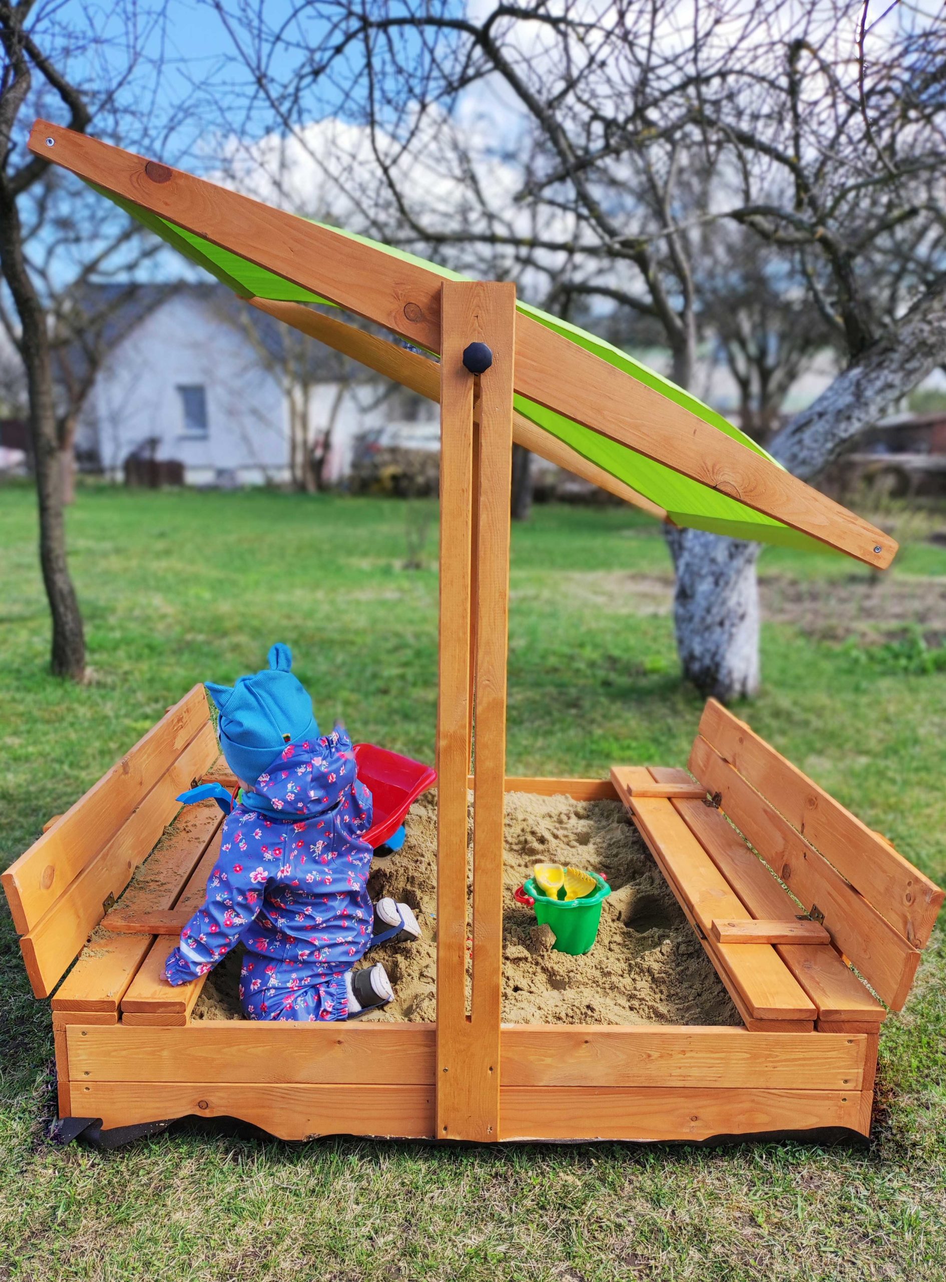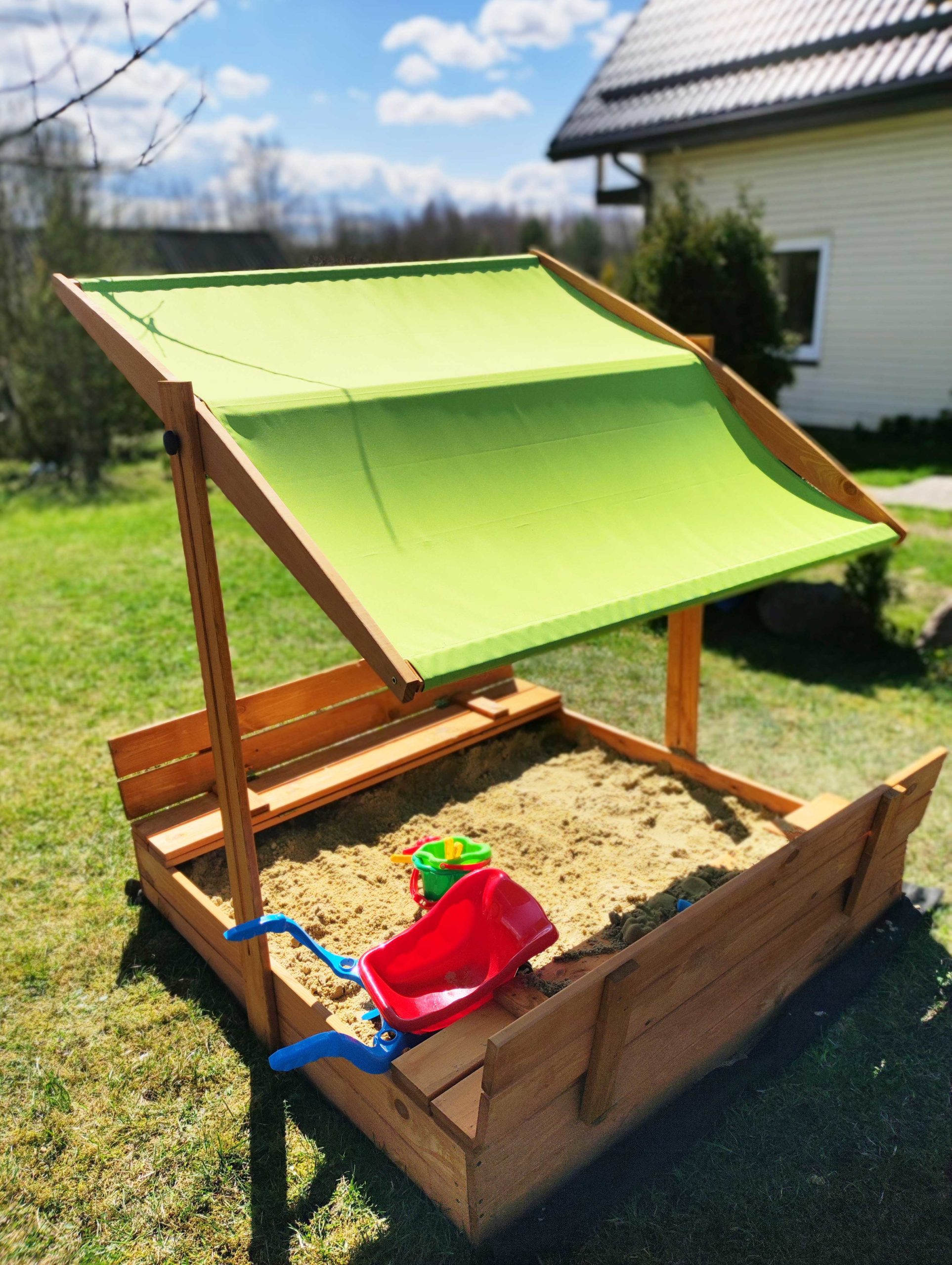 Praktiška ir funkcionali smėlio dėžė komplektuojama su dangčiu, kuris apsaugo smėlį nuo neigiamų aplinkos veiksnių ar gyvūnų teršimo ir transformuojasi į suoliukus šonuose. Komplektacijoje esantis mėlynos spalvos stogelis taps puikia apsauga ne tik nuo kaitrios saulės spindulių, bet ir lietaus. Stogelio aukštis reguliuojamas.