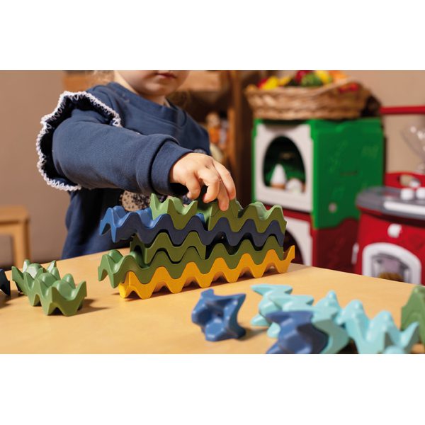 Inovatyvus 90 dalių kaladėlių rinkinys su unikaliu banguotu dizainu įkvepia vaikus kurti originalias konstrukcijas ir lavina jų fantaziją bei kūrybinį mąstymą. Skirtingi kaladėlių dydžiai (1, 2, 3 ir 6 bangelių) ir ryškios spalvos leidžia statyti įvairias formas, atpažinti modelius ir ieškoti kūrybiškų sprendimų. Statybos procesas skatina rankų ir akių koordinaciją, loginį mąstymą, atkaklumą bei problemų sprendimo įgūdžius. Rinkinyje taip pat yra instrukcijos su statybos idėjomis, padedančios pradėti kurti. Pagaminta iš saugių, ekologiškų medžiagų ir patvirtinta „Triman“ kokybės ženklais dėl atsakingos gamybos.