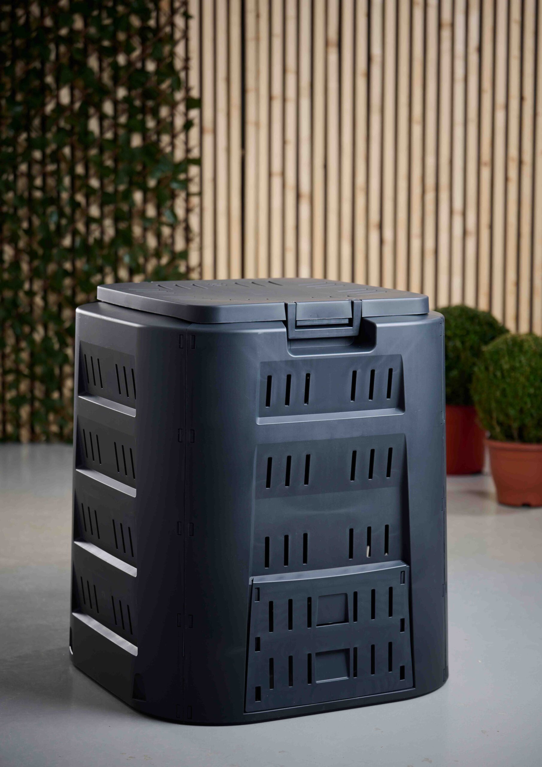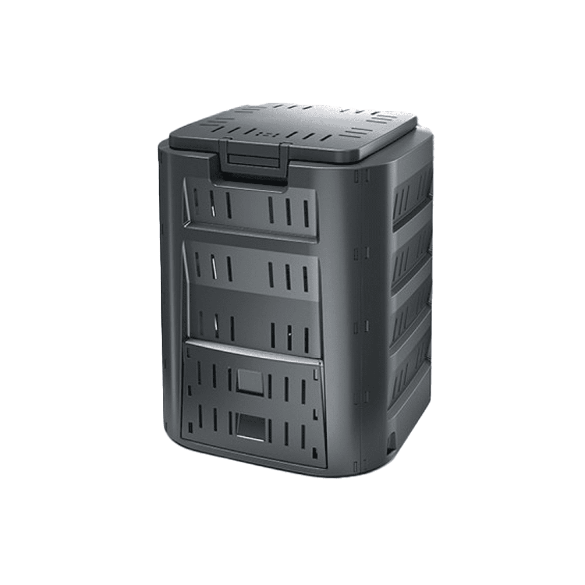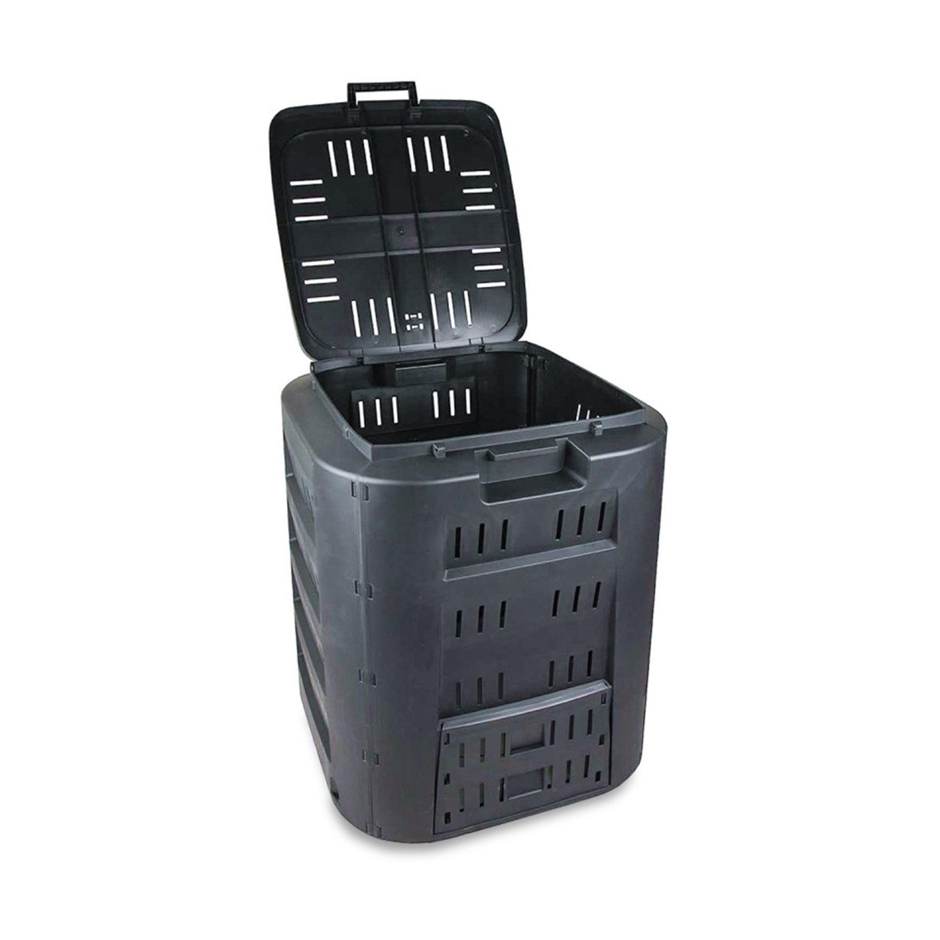 Ši kompostavimo dėžė pagaminta iš polipropileno, todėl yra ypač atspari neigiamoms oro sąlygoms. Kompostavimo dėžė turi dangtį, kurį pakėlus nesudėtingai sudėsite atliekas. Apačioje yra durelės skirtos patogiam komposto išėmimui. Dėžė talpina 320 l, jos dydis itin kompaktiškas, todėl puikiai tinkamas naudoti mažuose kiemuose ar soduose. Kompostavimo dėžę surinkti ypač paprasta, surinkimui papildomi įrankiai nereikalingi.