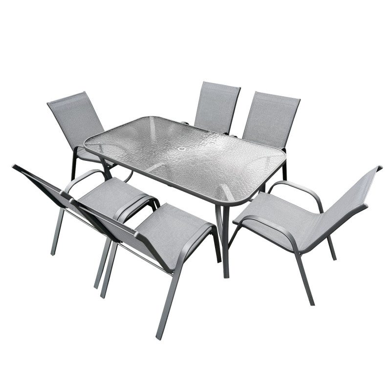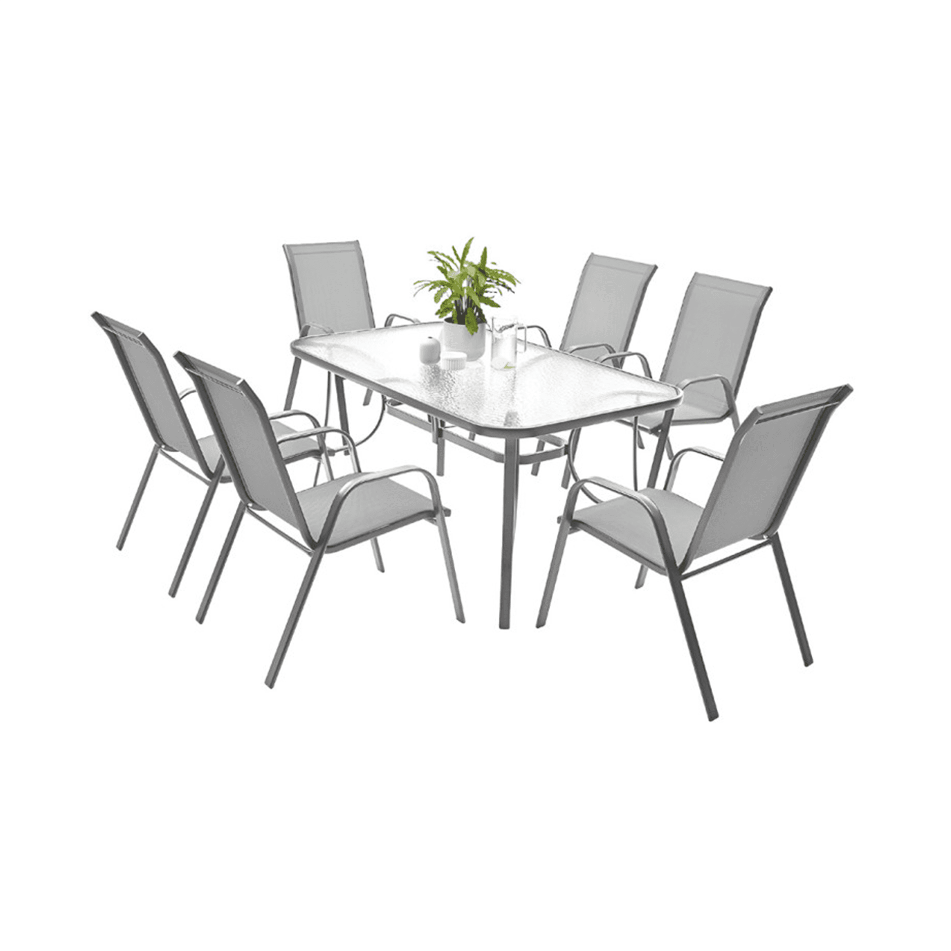 Konstrukcija pagaminta iš milteliniu būdu dengtu plienu, kuris atsparus rūdims, drėgmei ir intensyviam naudojimui. Tvirtas ir patvarus grūdinto stiklo paviršius, kuris suteikia stalui modernų ir stilingą įvaizdį. Patvarus audinys, atsparus UV spinduliams, todėl išlaiko spalvą net po ilgalaikio naudojimo saulėje.