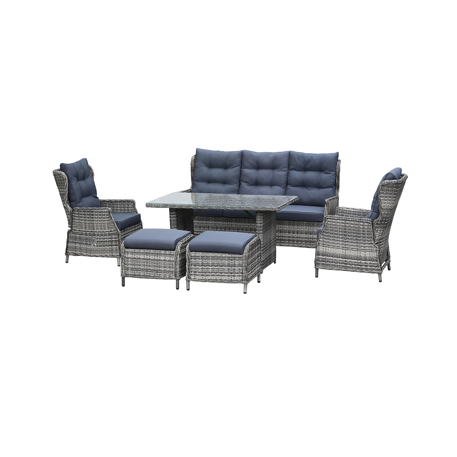 Baldų komplekto rėmas pagamintas iš milteliniu būdu dengto aliuminio, kuris suteikia ilgaamžiškumą. Elegantišką bei šiuolaikišką išvaizdą baldų komplektui suteikia iš vytelių pintas audinys, kuris dengtas vandeniui atsparia medžiaga. Minkštos lauko baldų komplekto dalys pagamintos iš aukštos kokybės poliesterio su 10 cm storio porolono užpildu, kuris užtikrina papildomą komfortą. Stalas turi 5 mm grūdinto stiklo paviršių, tai suteikia elegantišką bei estetišką vaizdą.