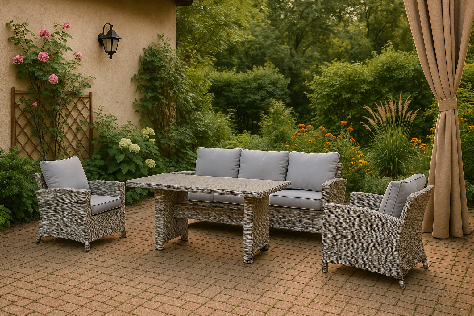 Keturių dalių lauko baldų komplektas yra puikus pasirinkimas ieškantiems patogumo, funkcionalumo ir šiuolaikiško dizaino. Sukurtas iš aukštos kokybės medžiagų, komplektas užtikrina ilgaamžiškumą ir nepriekaištingą išvaizdą. Jis puikiai tiks terasoms, sodams ar pavėsinėms, suteikdamas erdvę atsipalaidavimui ir bendravimui. Šis lauko baldų komplektas puikiai tiks tiek jaukiems šeimos vakarams, tiek didesniems susibūrimams su draugais.