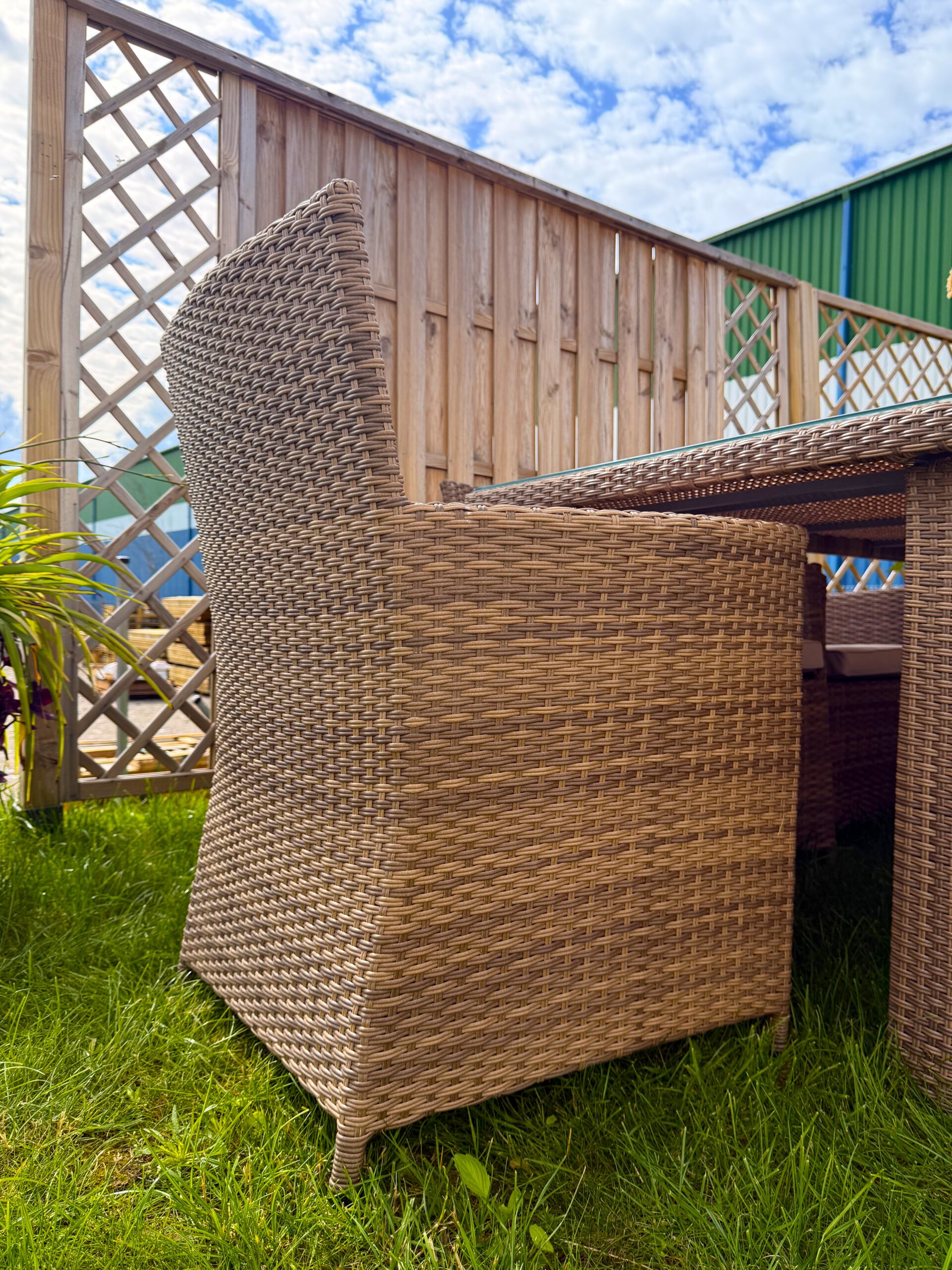 Baldų komplekto rėmas pagamintas iš milteliniu būdu dengto plieno, kuris suteikia ilgaamžiškumą. Elegantišką bei šiuolaikišką išvaizdą baldų komplektui suteikia iš vytelių pintas audinys. Minkštos lauko baldų komplekto dalys pagamintos iš aukštos kokybės poliesterio su 6 cm storio užpildu, kuris užtikrina papildomą komfortą. Stalas turi stiklinį paviršių, tai suteikia elegantišką bei estetišką vaizdą.
