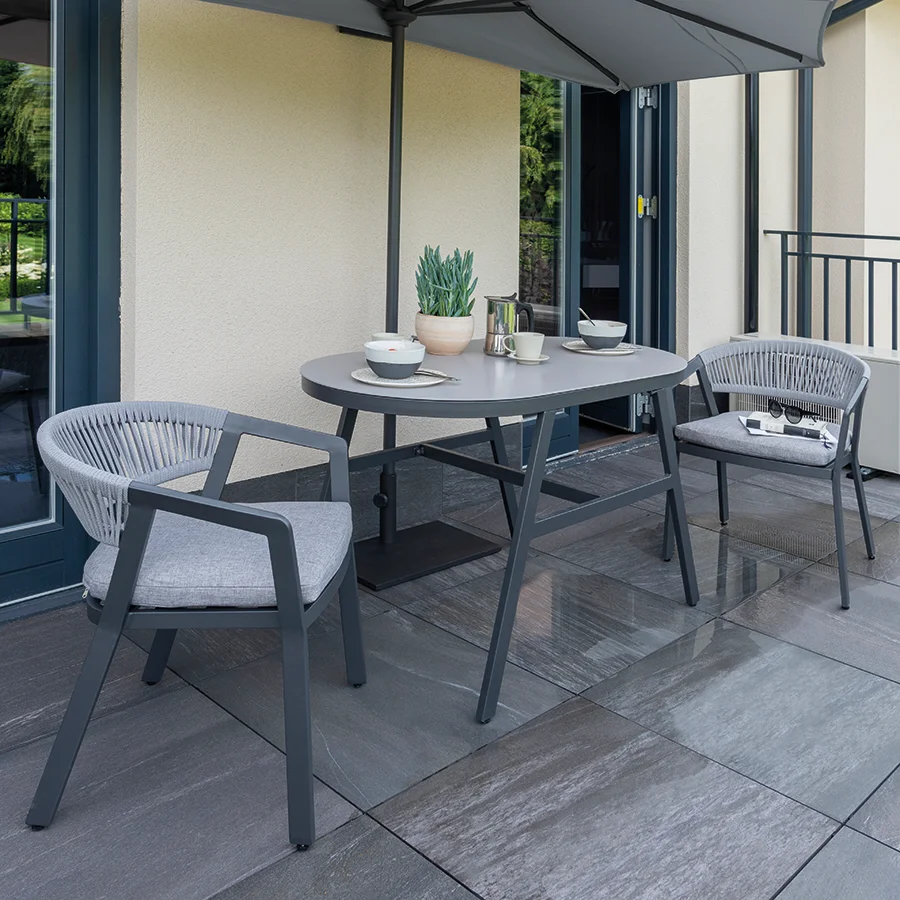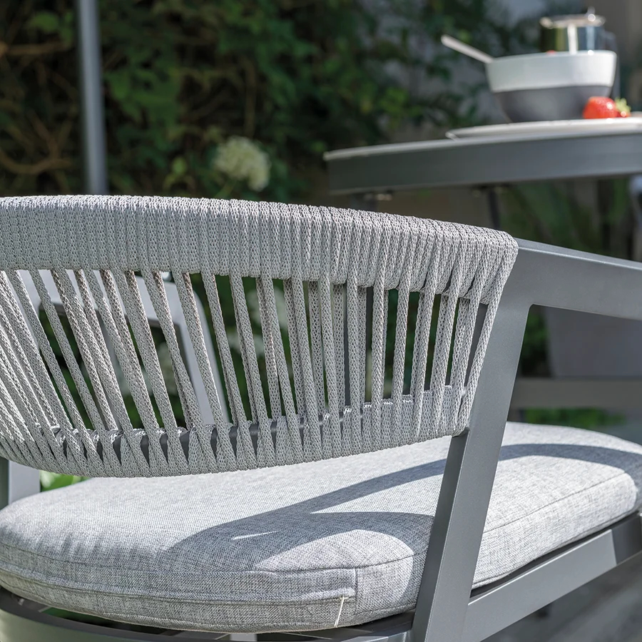 Kėdės komplekte turi minkštas pilkos spalvos pagalvėles su 5 cm storio užpildu, kurios užtikrina aukštą komforto lygį net ir ilgesnį laiką praleidžiant lauke. Pagalvėlės pagamintos iš 200 g/m² poliesterio, kuris ne tik yra malonus liesti, bet ir atsparus oro sąlygoms bei dėmėms, todėl baldų priežiūra yra paprasta ir nesudėtinga. Stalas su dailia ovalo formos konstrukcija suteikia komplektui prabangos pojūtį, o taip pat yra lengvai prižiūrimas, todėl idealiai tinka lauko sąlygoms.