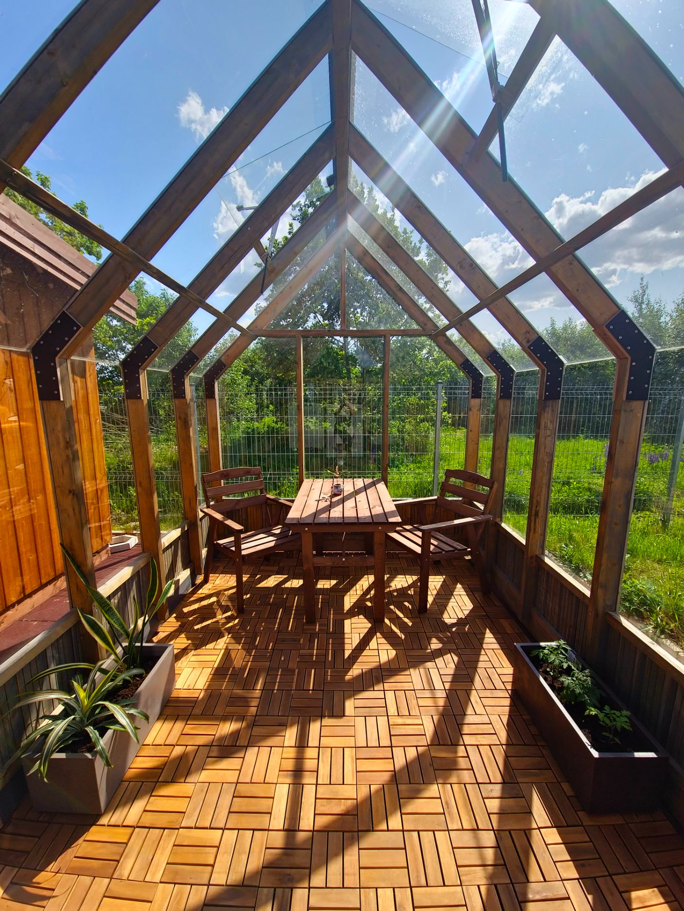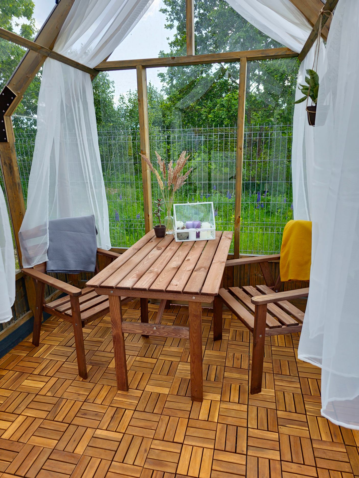 Lauko grindų danga jungiama po vieną plytelę, kurią sudaro dvylika alyvuotos akacijos medžio lentelių, kurios pritvirtintos prie tvirtos plastikinės konstrukcijos. Alyvuotas akacijos medis pasirinktas dėl savo patvarumo, atsparumo pažeidimams ir ilgaamžiškumo. Šios plytelės tarpusavyje jungiamos labai paprastai, plastikinėje konstrukcijoje esančiais kabliukais. Plastikinė konstrukcija pagaminta taip, jog sudėjus grindų dangą ant bet kokio kito paviršiaus susidaro tarpeliai, kurie neleidžia rinktis skysčiams. Tad išklojus terasą ar kitą atvirą vietą šia lauko grindų danga – po ja nesikaups drėgmė ar lietaus vanduo, jis nutekės ir išgaruos.