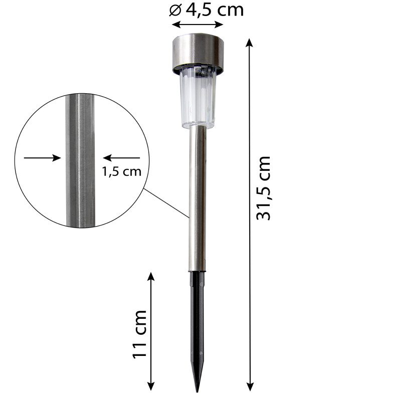 Į žemę įsmeigiamas lauko šviestuvas su saulės baterija – tai išmanus sprendimas sodo ar kiemo apšvietimui, kuriam nereikia elektros. Dieną šviestuvas įkraunamas saulės energija, o naktį automatiškai šviečia iki 8 valandų. Sidabrinės spalvos korpusas suteikia modernumo ir puikiai dera tiek prie klasikinio, tiek prie šiuolaikinio eksterjero.