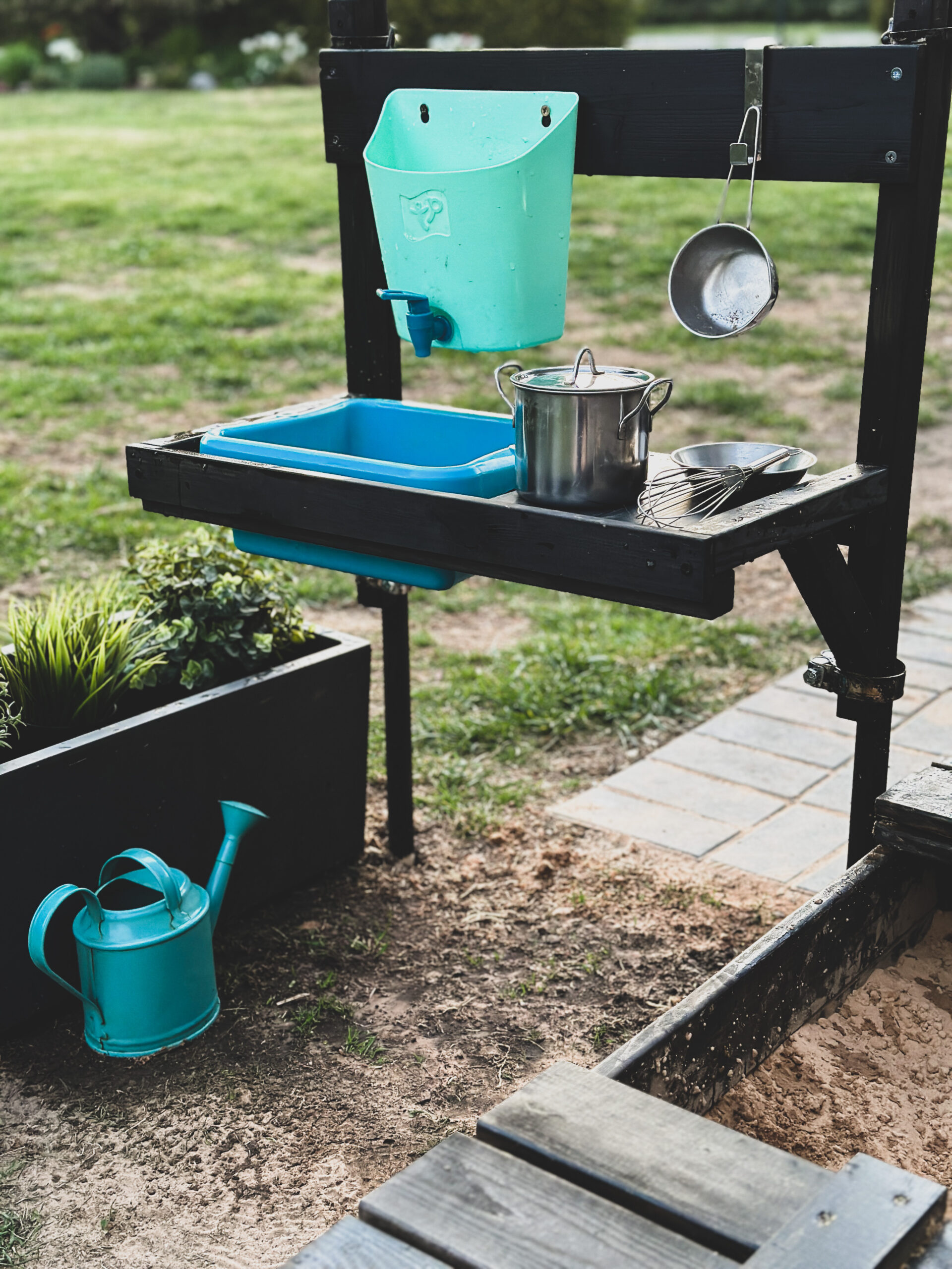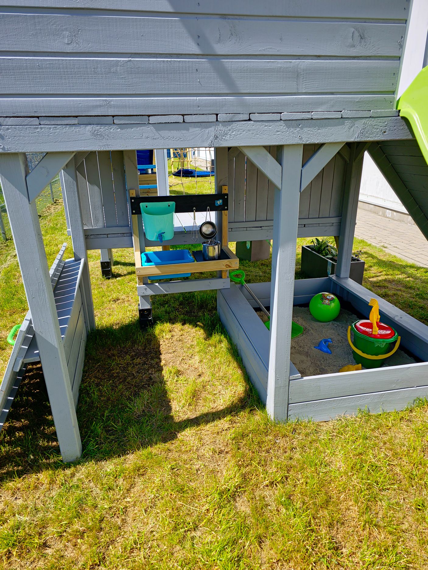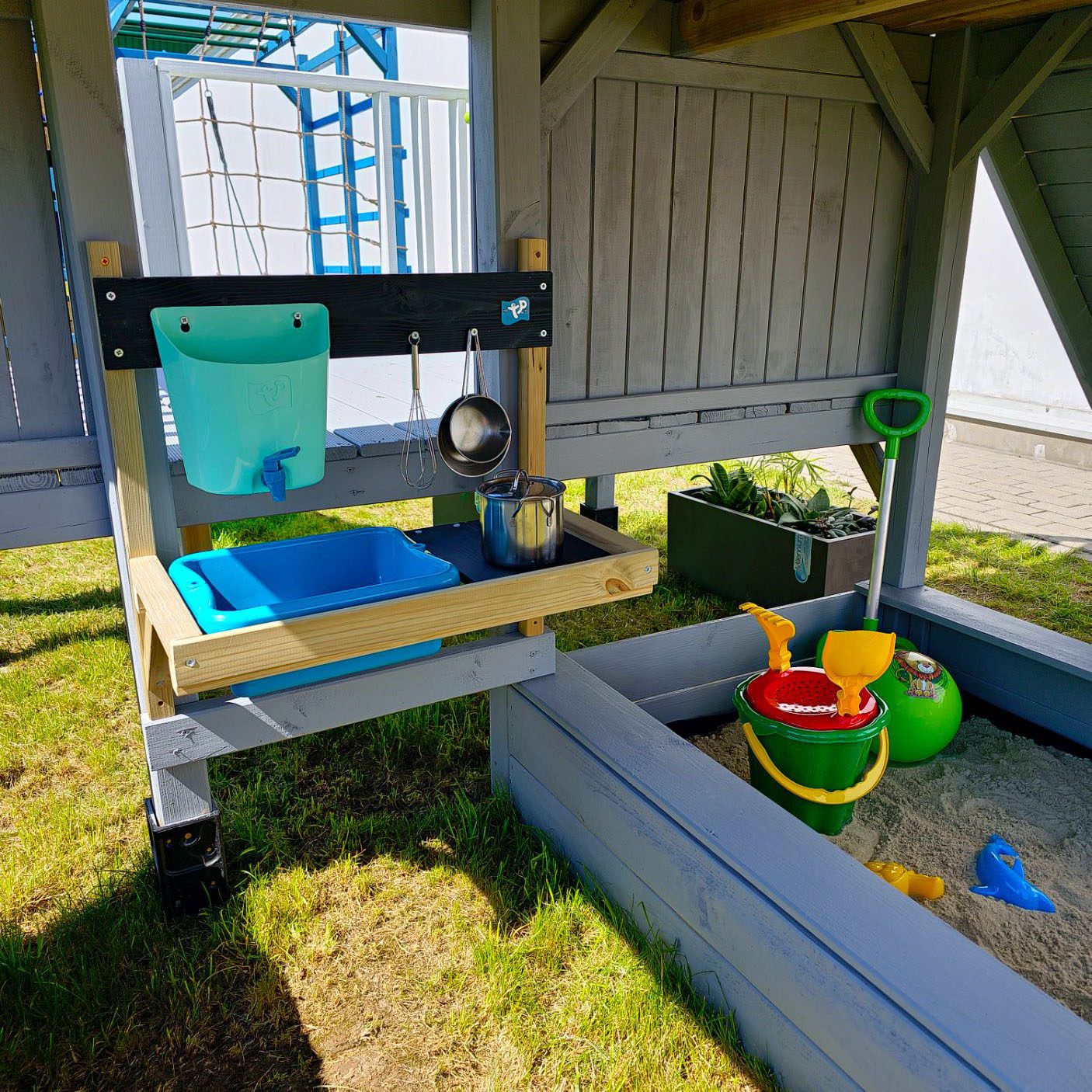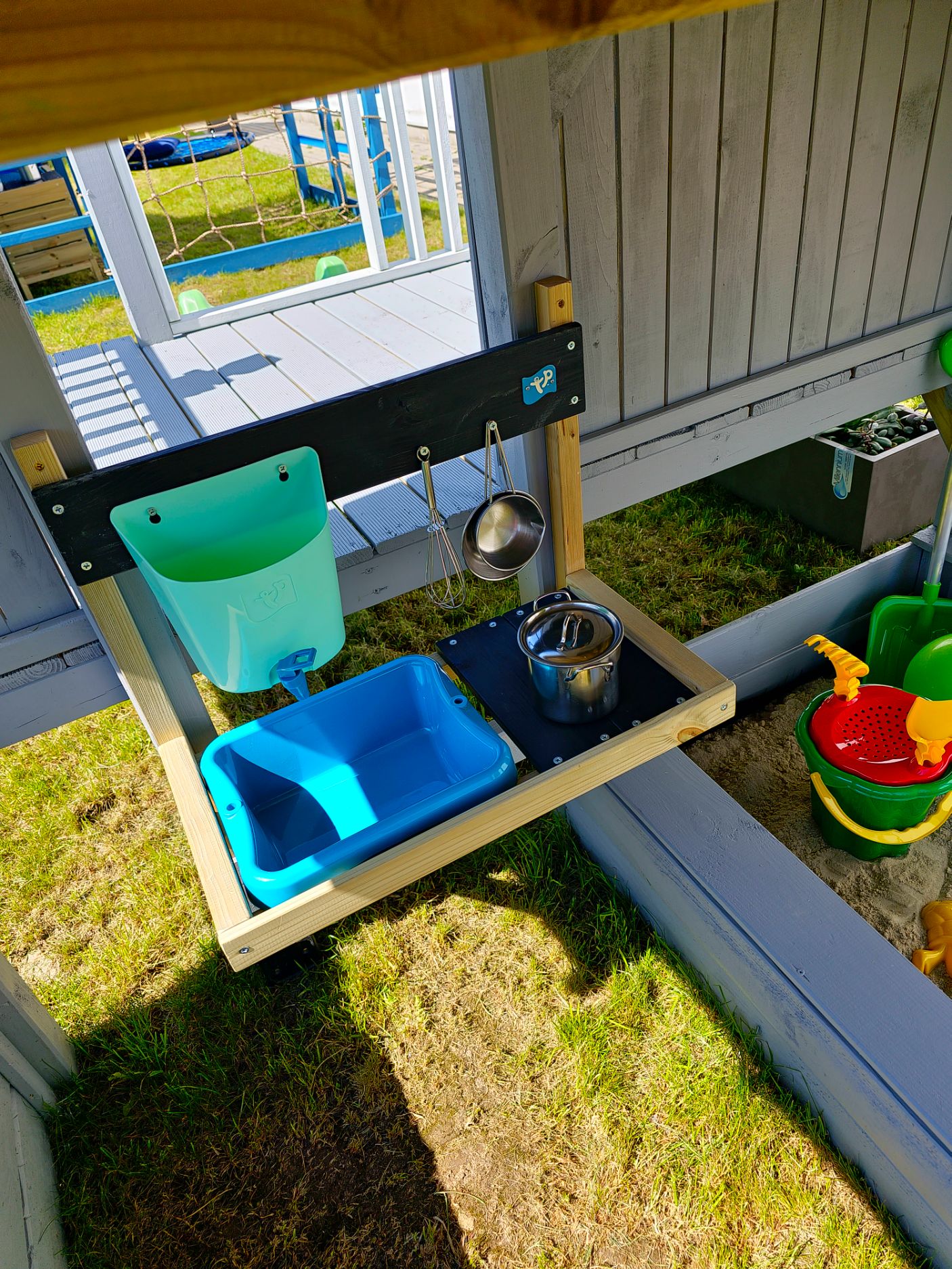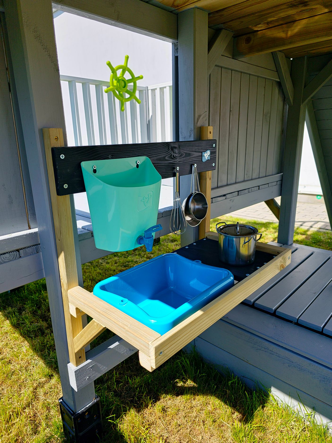 Tvirta medinė konstrukcija gali būti tvirtinama prie žaidimų namelio, žaidimų aikštelės ar pastato sienos. Ši purvo virtuvė suteikia daug veiklos kompaktiškoje erdvėje. Virtuvėlę taip pat patogu naudoti balkone ar terasoje.