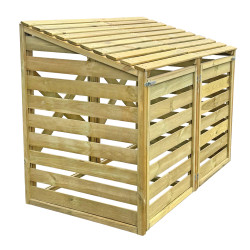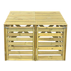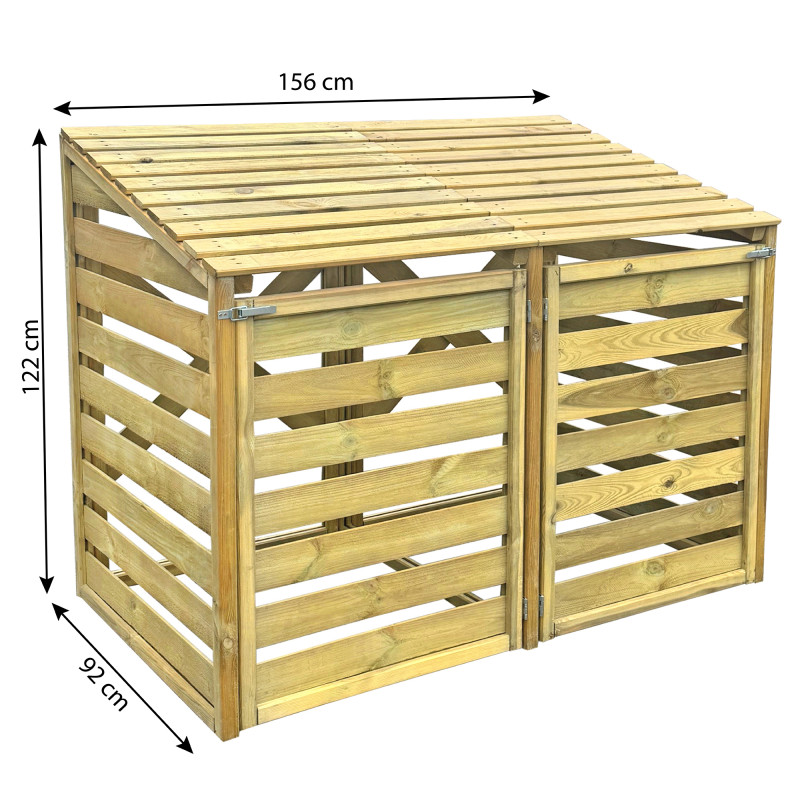 Medinės šiukšlių konteinerio stoginės surinkimas itin paprastas. Varstomų priekinių durelių pagalba galėstite lengvai transportuoti šiukšlių konteinerius. Kiekviena durelių pusė turi užraktą, kurio pagalba durelės nebus varstomos Jums nesinaudojant stogine, konteineriai bus apsaugoti nuo gyvūnų bei nepageidaujamų asmenų. Stoginės viršutiniai pakeliami dangčiai leidžia lengvai naudotis kontaineriais išmetant šiukšles. Net 156 x 92 x 122 cm dydžio konstrukcija, kurioje lengvai telpa du šiukšlių konteineriai atliekoms rūšiuoti. Medinėje šiukšlių konteinerio stoginėje rekomenduojame talpinti 2 vnt. po 240 l šiukšlių konteinerius (konteinerio išmatavimai 60 x 75 x 115 cm).