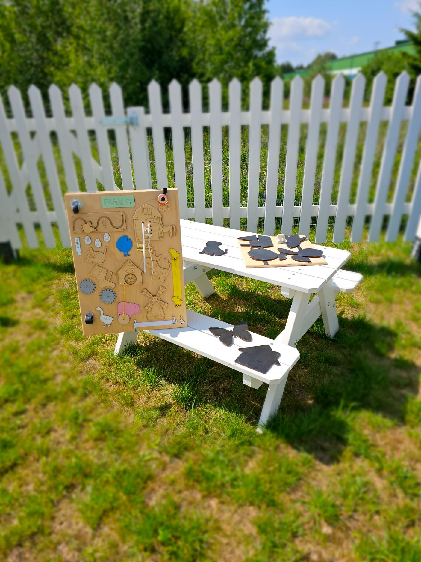 Lentelės prie pagrindo tvirtinamos velcro lipduku, todėl jas galima lengvai dėti, keisti ir piešti kreida. Tai yra puikus būdas skatinti vaikų kūrybiškumą, kuriame jie gali laisvai eksperimentuoti su savo piešiniais ir išmokti kurti įvairias formas ir spalvas.