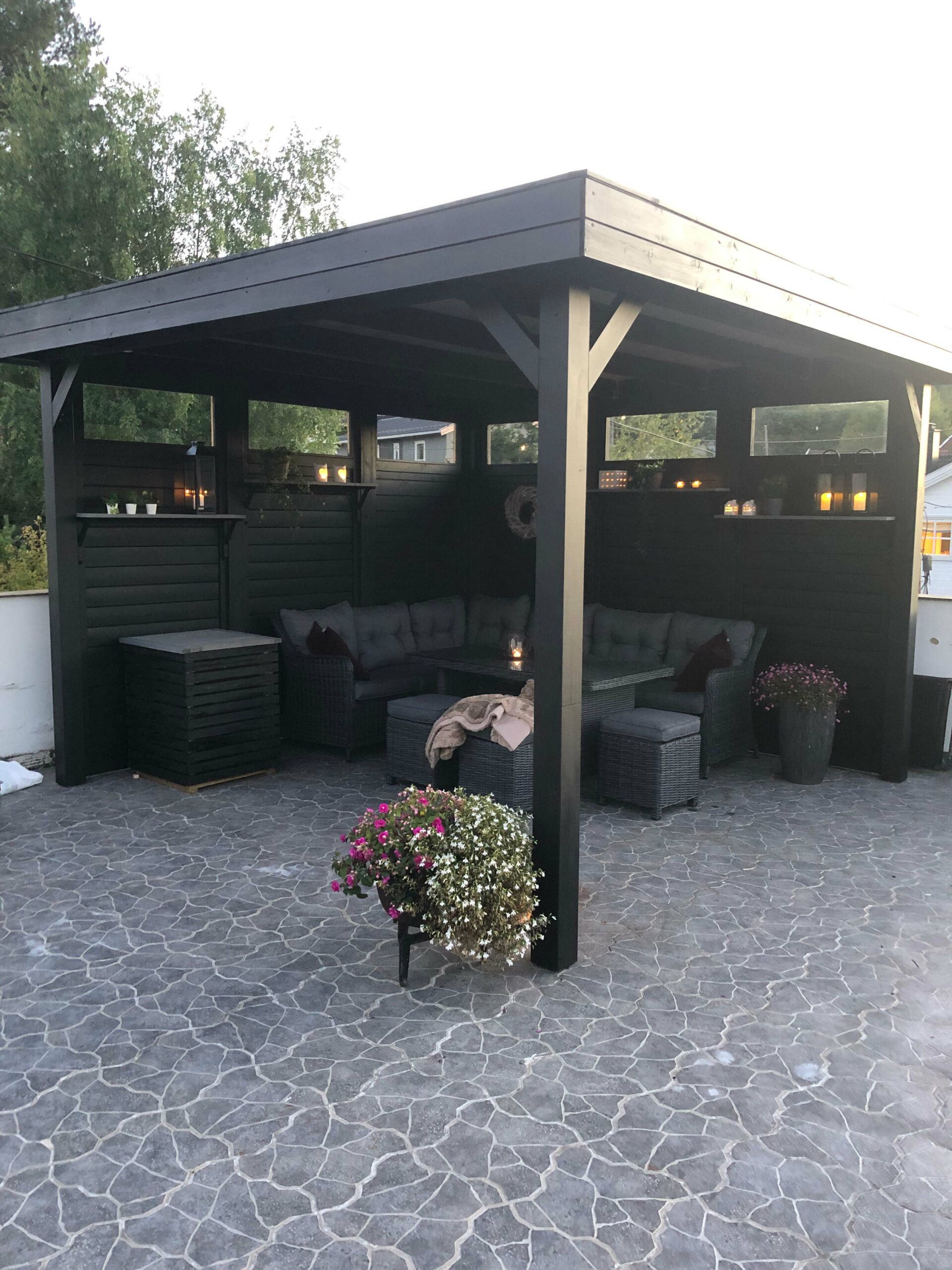 Medinius gaminius, skirtus naudoti lauke, rekomenduojame nudažyti Jūsų pasirinktomis spalvomis – ne tik sukursite tikrą kiemo puošmeną, bet taip pat papildomai apsaugosite medieną. Džiaugiamės, galėdami pasiūlyti profesionalių, mediniams lauko fasadams skirtų dažų, belieka išsirinkti labiausiai patinkančias spalvas! Esant poreikiui už papildomą mokestį, medinę pavėsine galime impregnuoti giluminiu būdu.
