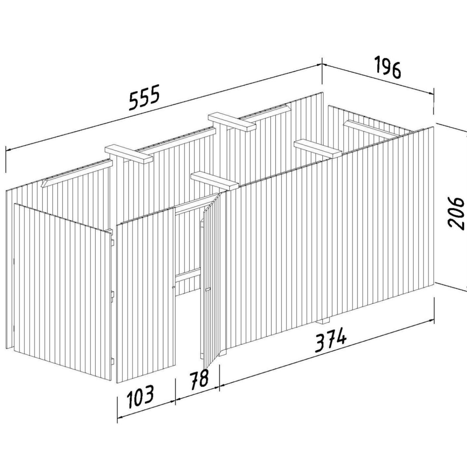 SIENOS. Sienų konstrukcija susideda iš montavimui paruoštų laminuotos medienos 120 x 120 mm pastolių. Stoginės pastoliams reikalingas ankeriavimas – 14 vnt, juos reiktų įsigyti papildomai. Paprasta konstrukcija leidžia greitai ir lengvai surinkti statinį savo kieme.