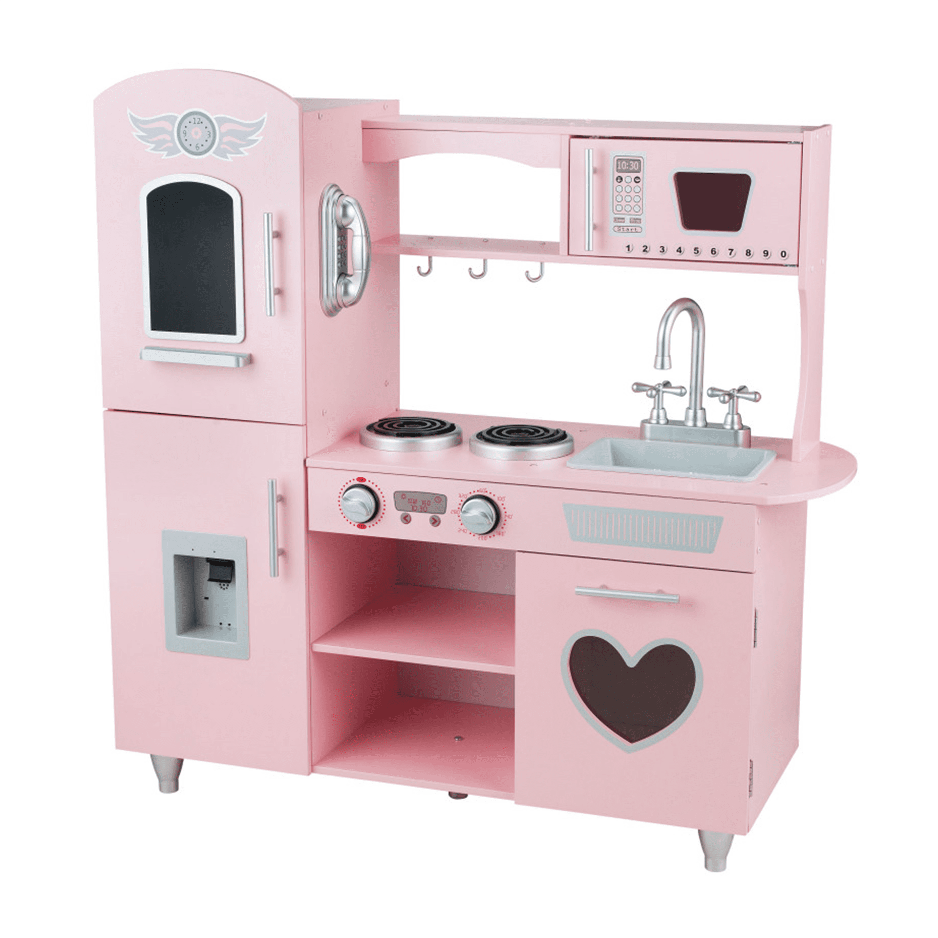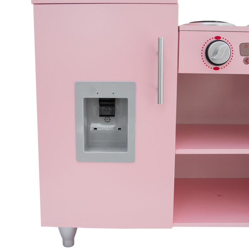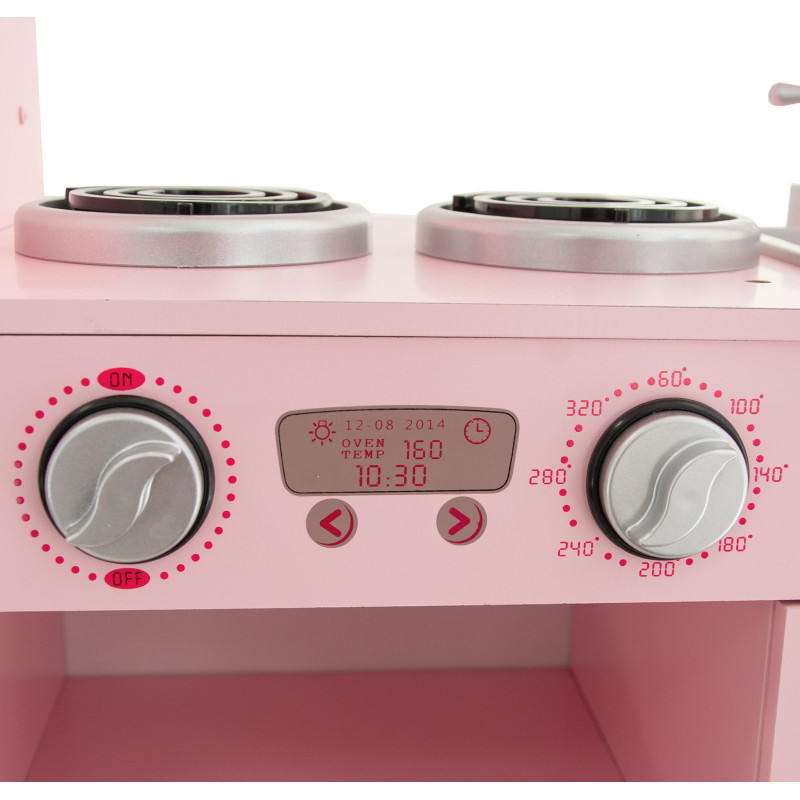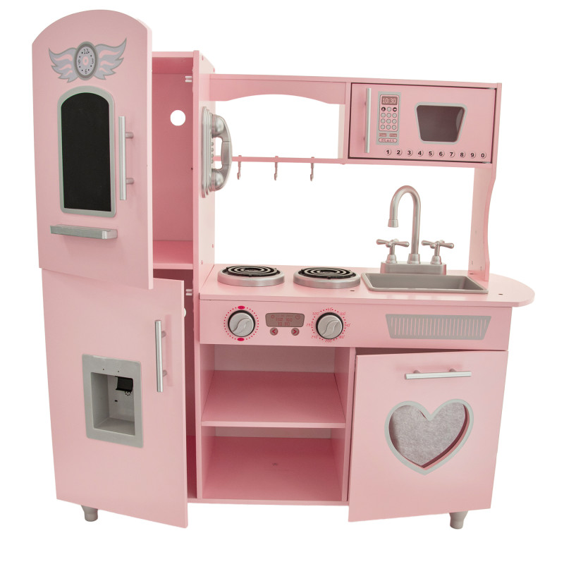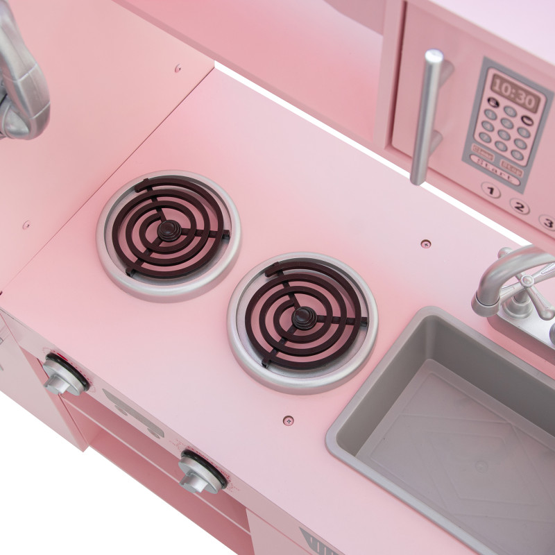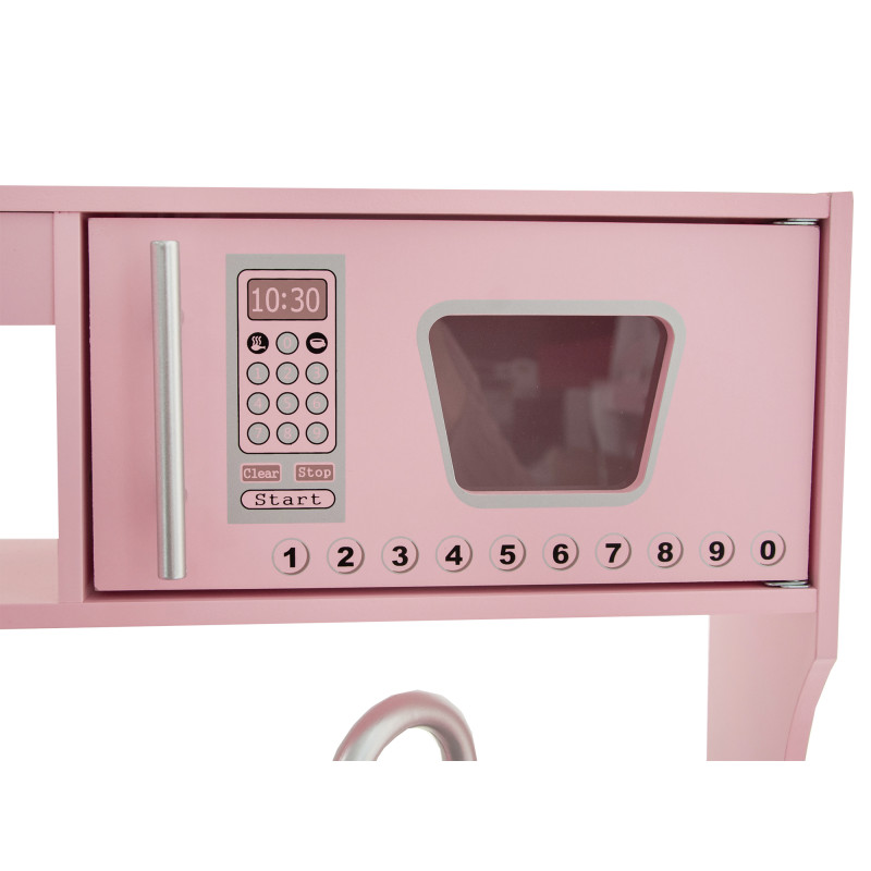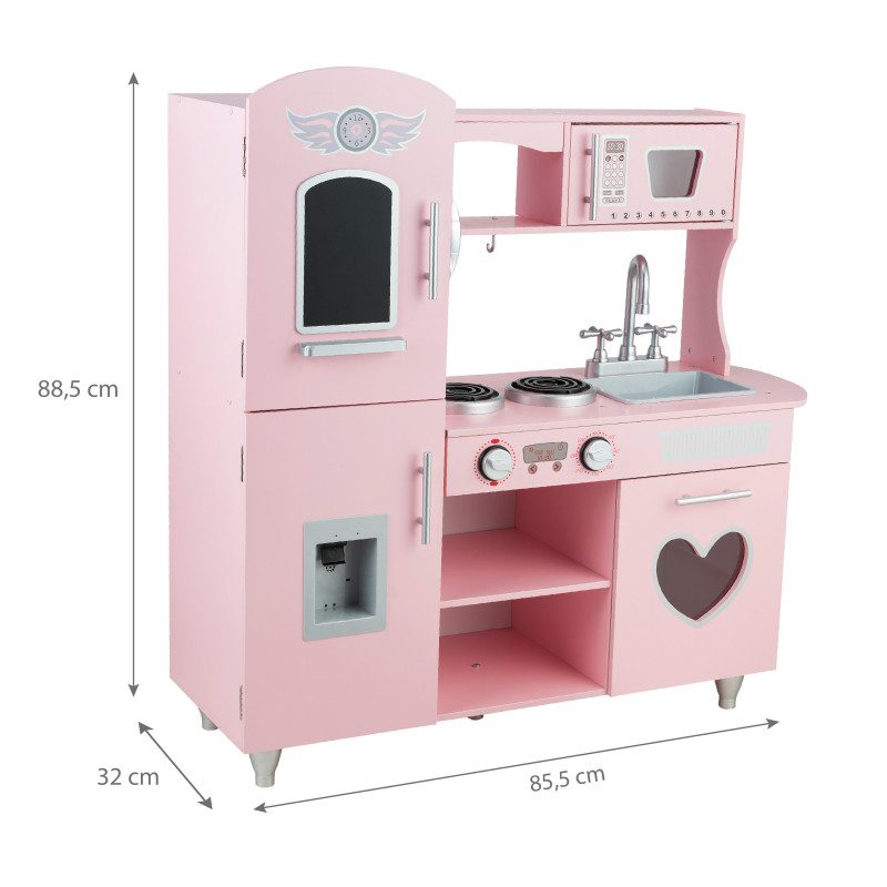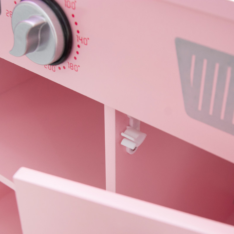 Kiekvienos mažosios virtuvės šeimininkės svajonė! Durelės varstosi, rankenėlės sukinėjasi, kabliukai mentelėms kabinti ir dar daugelis kitų virtuvės įregimų padės vaikui lavinti fantaziją, skatins kūrybiškumą bei padės susipažinti su pasauliu. Leiskite savo vaikui pagaminti įspūdingus pirmuosius patiekalus šaunioje virtuvėlėje. Rožinės spalvos virtuvėlė su sidarbo detalėmis taps tikra kambario puošmena bei smagiausia vieta žaidimams. Visi elementai nudažyti vaikams ir aplinkai nekenksmingais dažais.