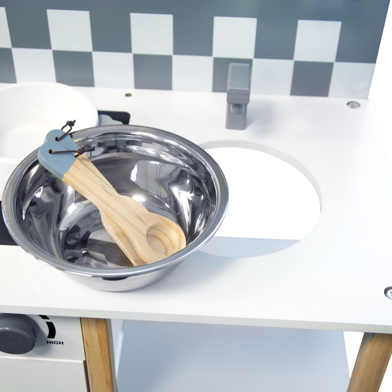 Universalaus dizaino kompaktiška virtuvėlė mažiausiems virtuvės šefams. Durelės varstosi, rankenėlės sukinėjasi, virš viryklės yra lentynėlė mentelėms laikyti. Įvairūs mediniai priedai. Virtuvėlė neabejotinai suteiks džiaugsmo ir tuo pačiu skatins kūrybiškumą ir lavins vaizduotę. Leiskite savo vaikui pagaminti įspūdingus pirmuosius patiekalus.