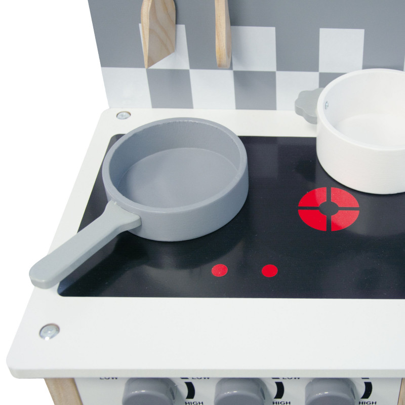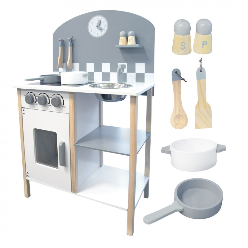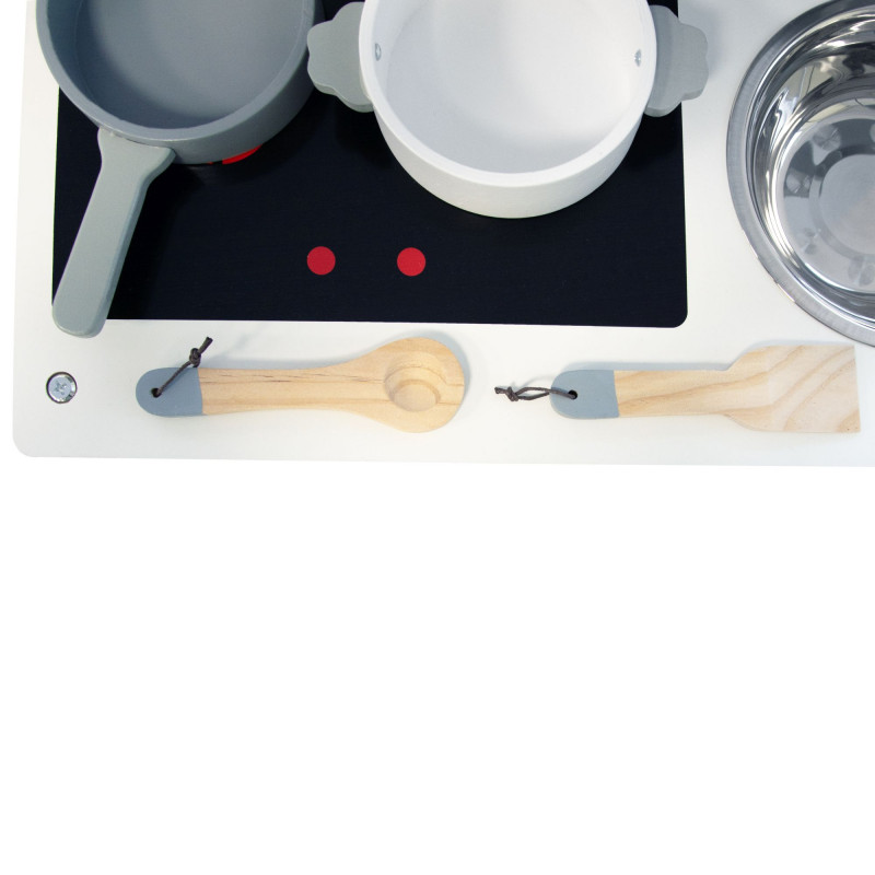 Universalaus dizaino kompaktiška virtuvėlė mažiausiems virtuvės šefams. Durelės varstosi, rankenėlės sukinėjasi, ant kabliukų tvirtinasi įvairūs mediniai priedai. Virtuvėlė neabejotinai suteiks džiaugsmo ir tuo pačiu skatins kūrybiškumą ir lavins vaizduotę. Leiskite savo vaikui pagaminti įspūdingus pirmuosius patiekalus.