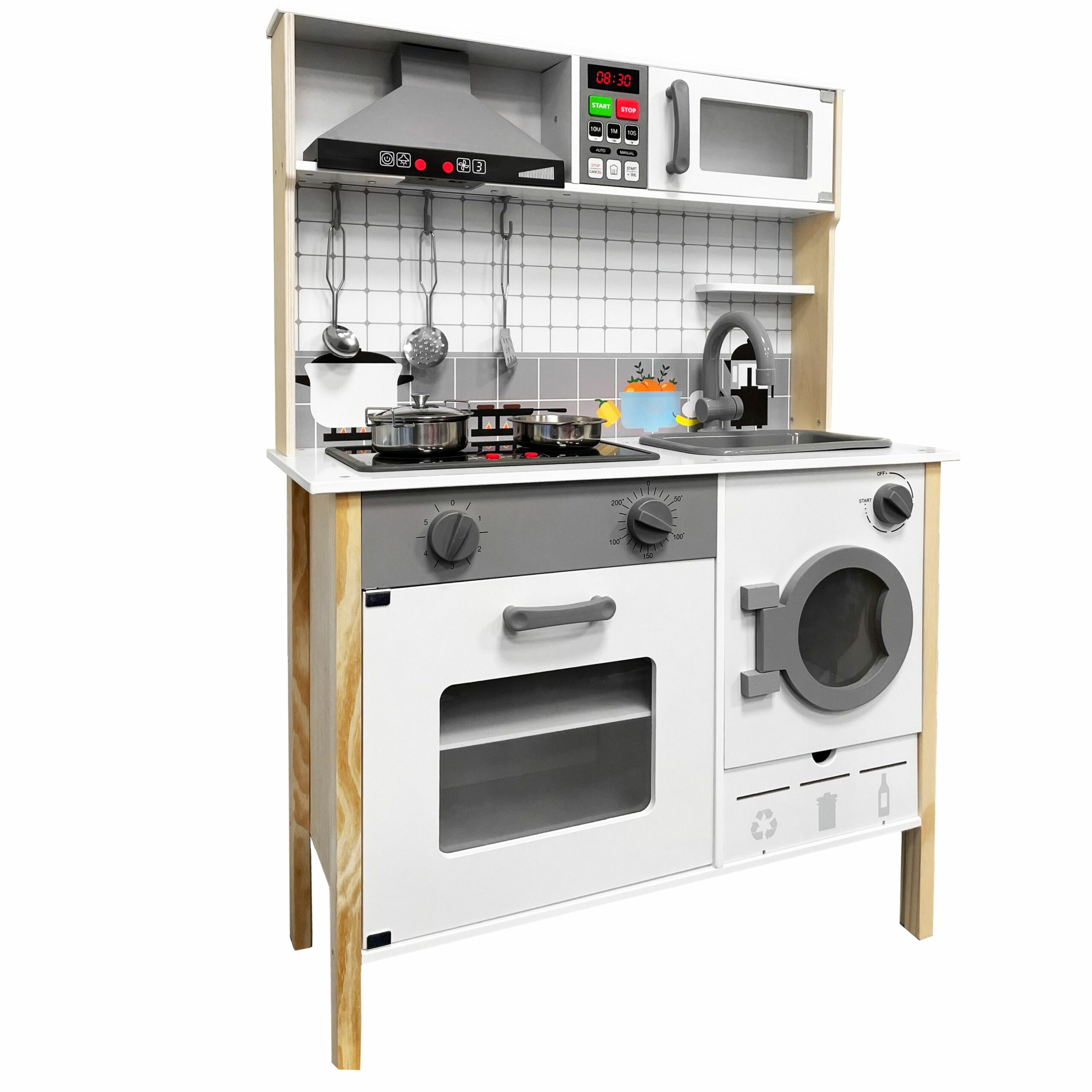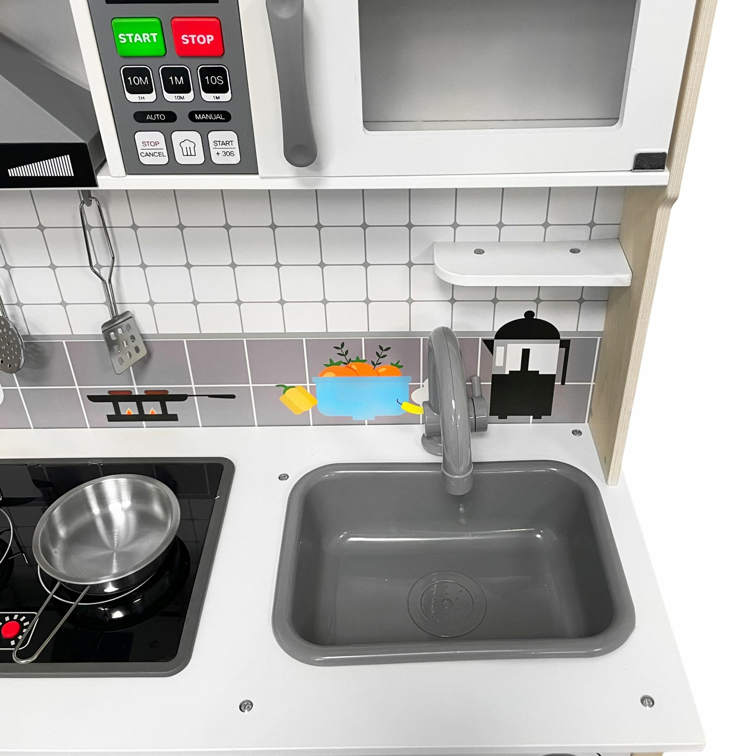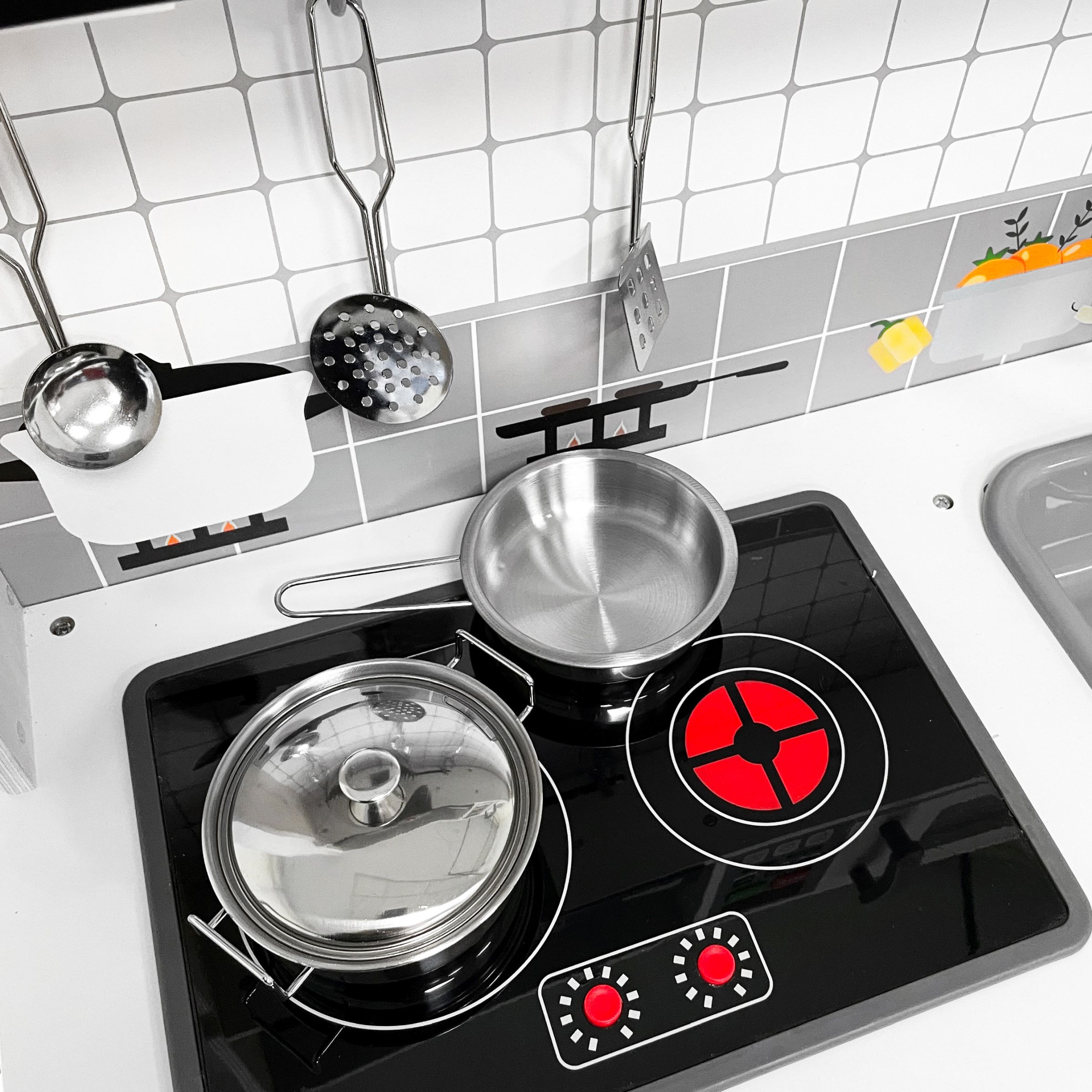 Originali ir stilinga, universalaus dizaino virtuvėlė mažiesiems virtuvės šefams. Daug dėmesio skirta virtuvėlės dizainui ir detalėms bei priedams. Pagaminta iš aukščiausios kokybės medienos, kuri žavi šiluma, ilgaamžiškumu ir natūraliu grožiu. Durelės varstosi, kabliukai metaliniams įrankiams pakabinti, įvairūs metaliniai priedai (keptuvė ir puodas su dangčiu, mentelės) padės mažajam virėjui gaminti įvairius, gardžius patiekalus. Virtuvėlė neabejotinai suteiks džiaugsmo ir tuo pačiu skatins kūrybiškumą bei lavins vaizduotę.