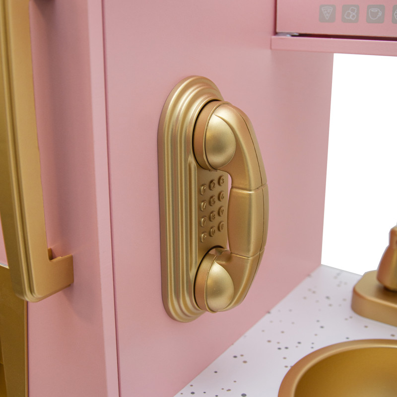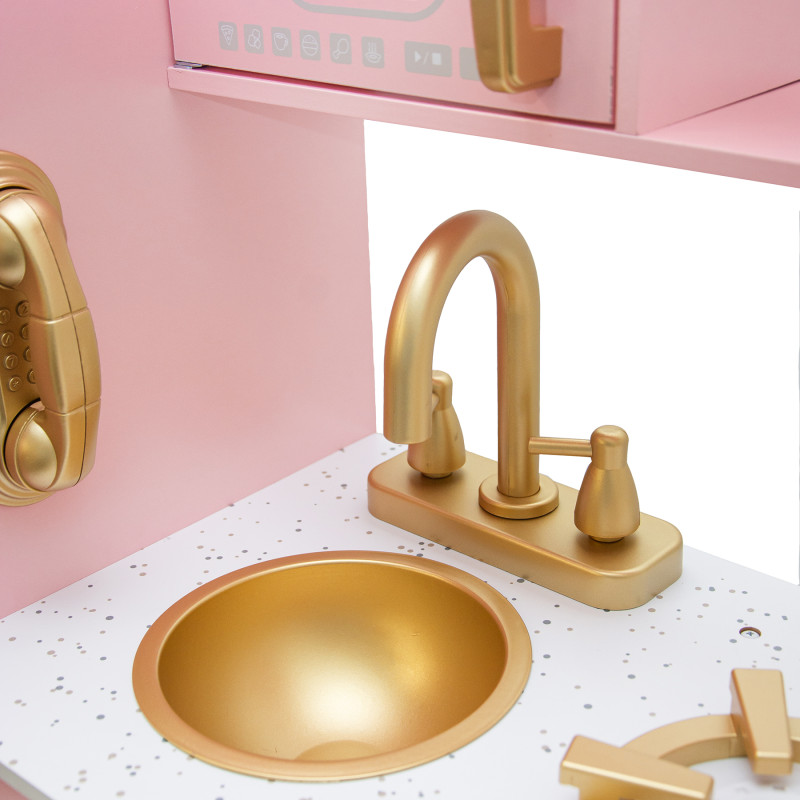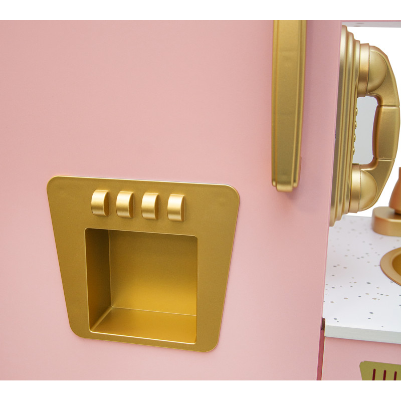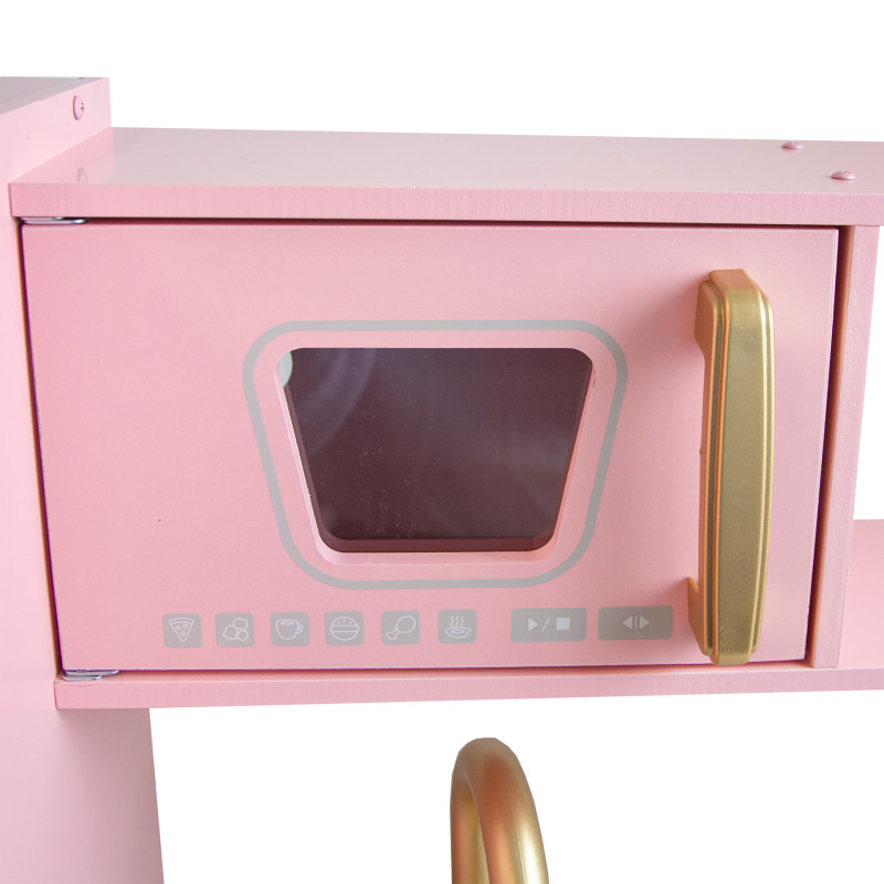 Itin prabangaus dizaino medinė virtuvėlė – kiekvienos mažosios virtuvės šeimininkės svajonė! Rausva virtuvėlė su puošniu aukso spalvos dekoru neabejotinai suteiks džiaugsmo ir tuo pačiu skatins kūrybiškumą ir lavins vaizduotę, bei padės mažajam virėjui gaminti įvairius, gardžius patiekalus. Originalaus ir tikroviško dizaino technika: kriauklė, viryklė, orkaitė, mikrobangų krosnelė. Leiskite savo vaikui pagaminti įspūdingus pirmuosius patiekalus.