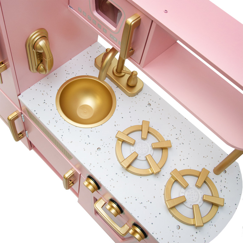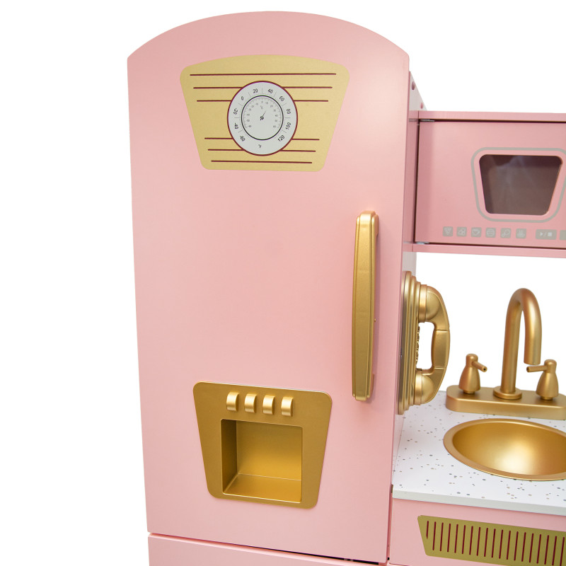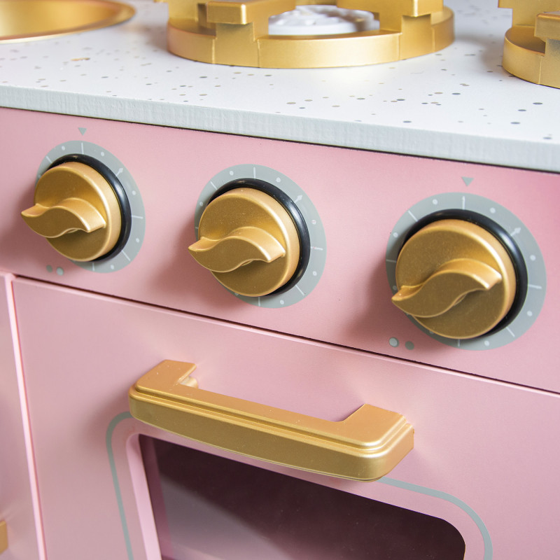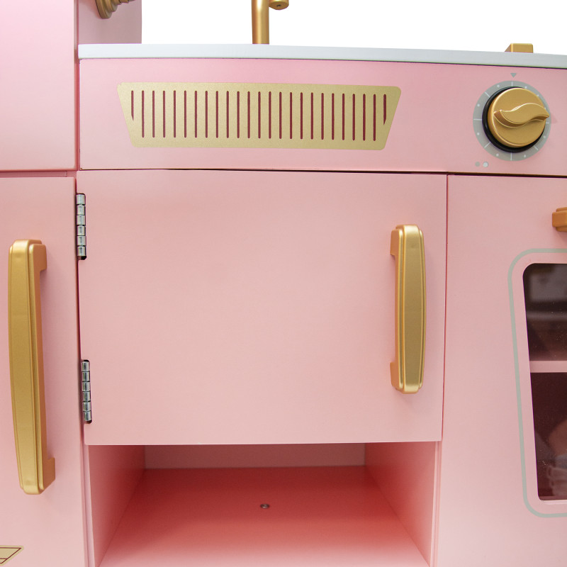 Itin prabangaus dizaino medinė virtuvėlė – kiekvienos mažosios virtuvės šeimininkės svajonė! Rausva virtuvėlė su puošniu aukso spalvos dekoru neabejotinai suteiks džiaugsmo ir tuo pačiu skatins kūrybiškumą ir lavins vaizduotę, bei padės mažajam virėjui gaminti įvairius, gardžius patiekalus. Leiskite savo vaikui pagaminti įspūdingus pirmuosius patiekalus.