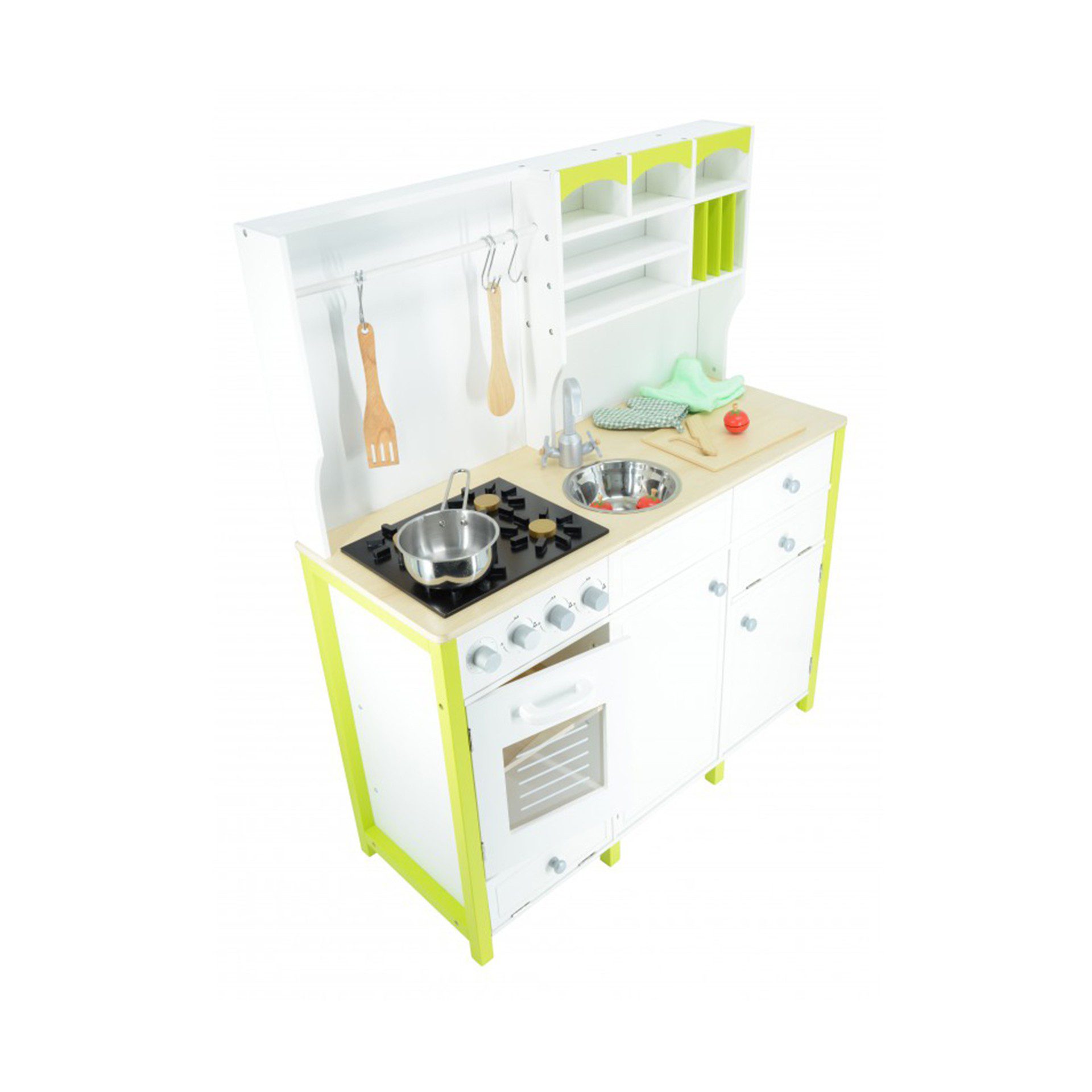 • 11 priedų (2 mentelės, medinis peilis, dubuo, puodas, pirštinė, pjaustymo dangtelis, rankšluostėlis ir trys mediniai pomidorai)