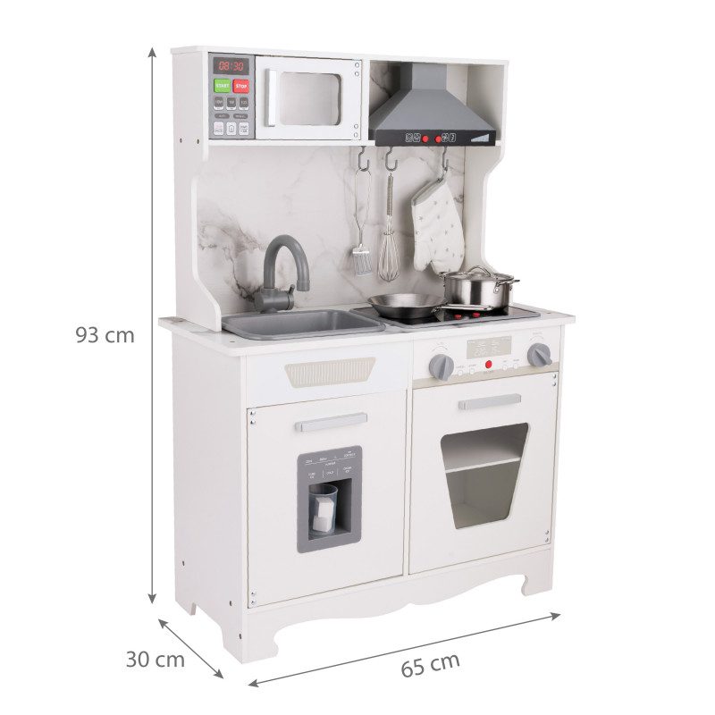 Originali ir stilinga virtuvėlė mažiesiems virtuvės šefams. Daug dėmesio skirta virtuvėlės dizainui ir detalėms bei priedams. Pagaminta iš aukščiausios kokybės medienos, kuri žavi šiluma, ilgaamžiškumu ir natūraliu grožiu. Dėl elegantiško balto dizaino su subtiliais pilkais akcentais, virtuvėlė puikiai papildys bet kurį vaikų kambarį. Pasitelkus fantazija pavyks pagaminti įspūdingus pirmuosius patiekalus. Žaidžiant vaikai lavins ne tik rankų miklumą, bet ir kūrybingumą, kurdami išskirtinį kulinarinį šedevrą.