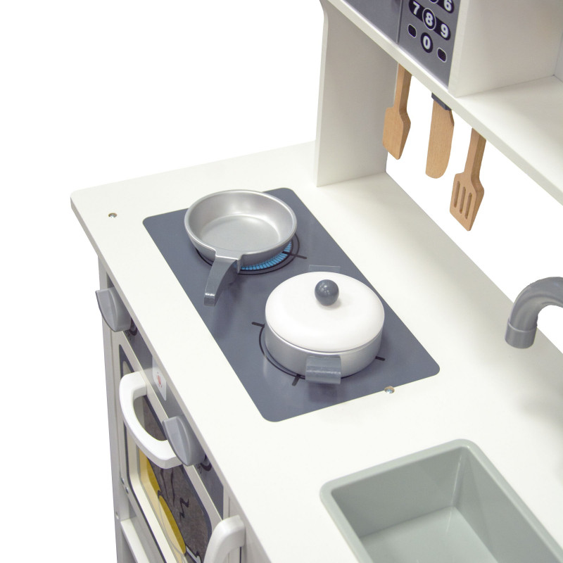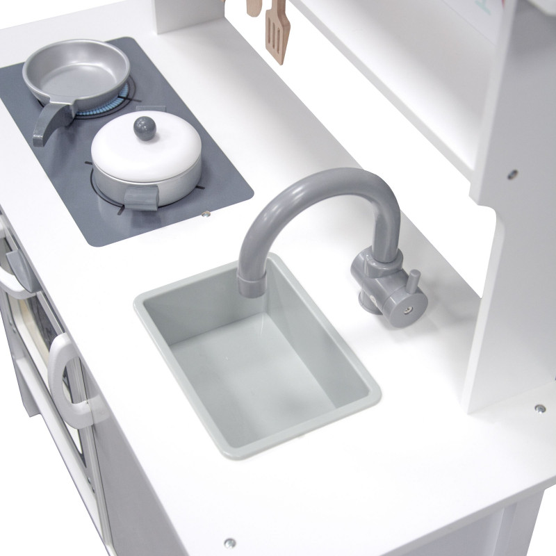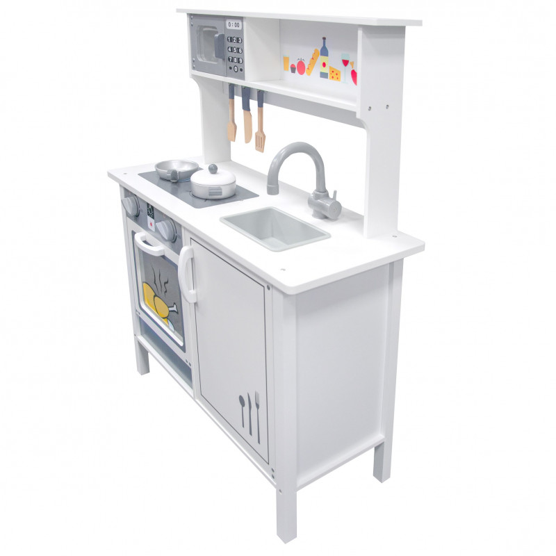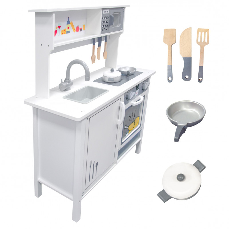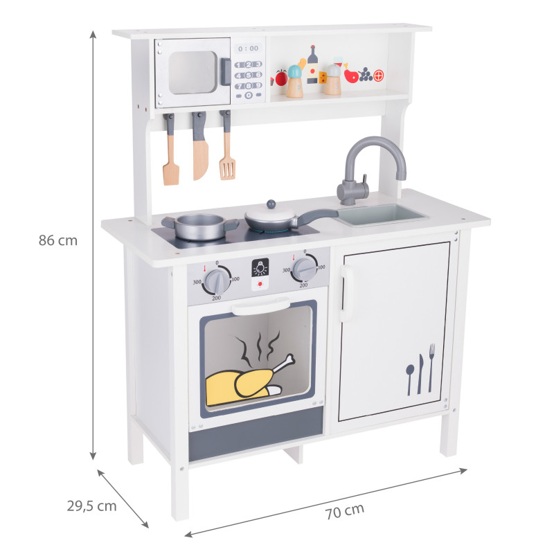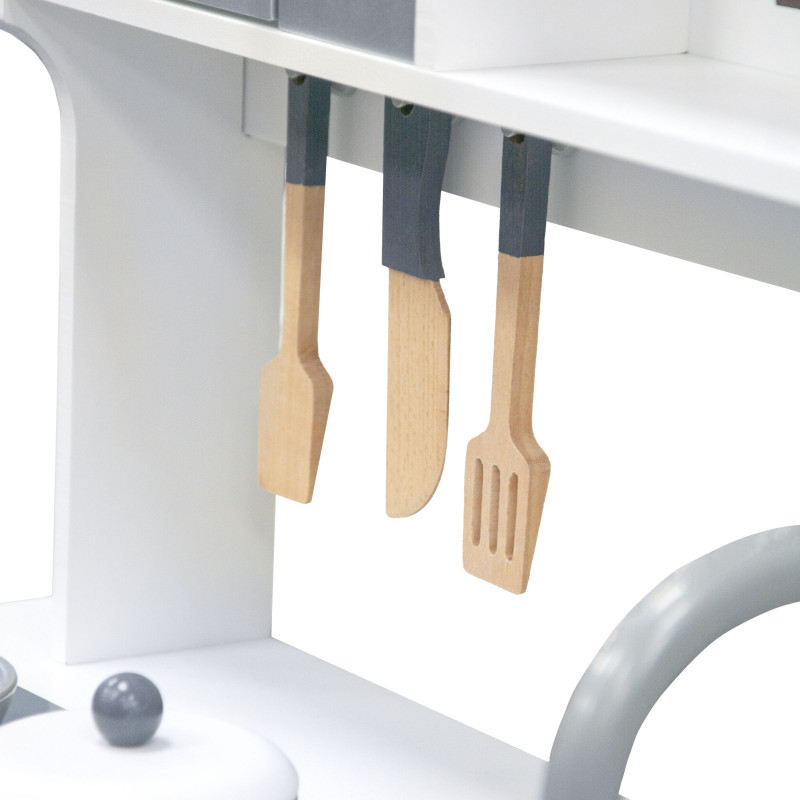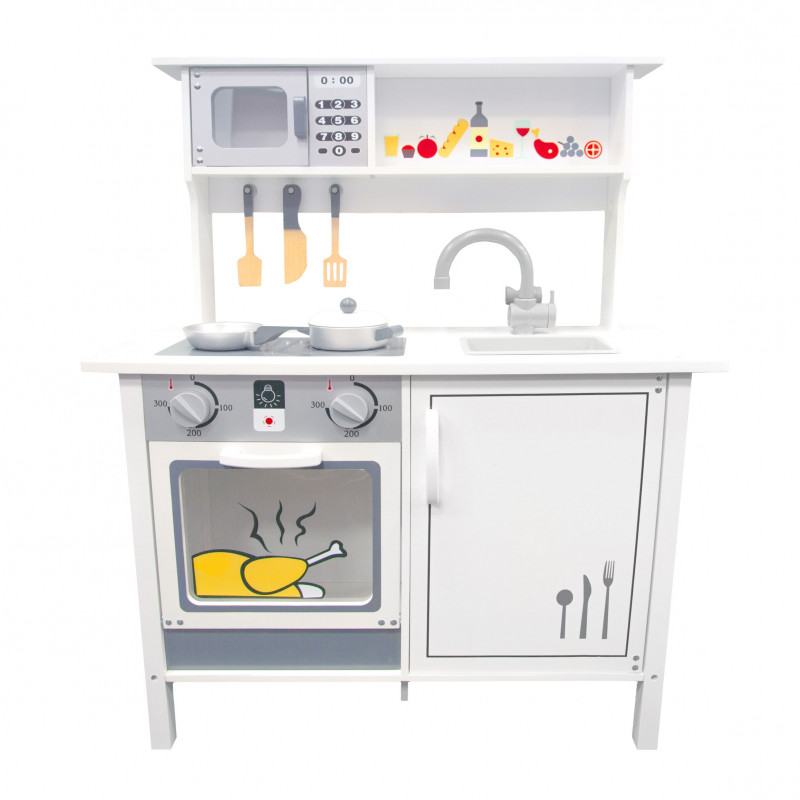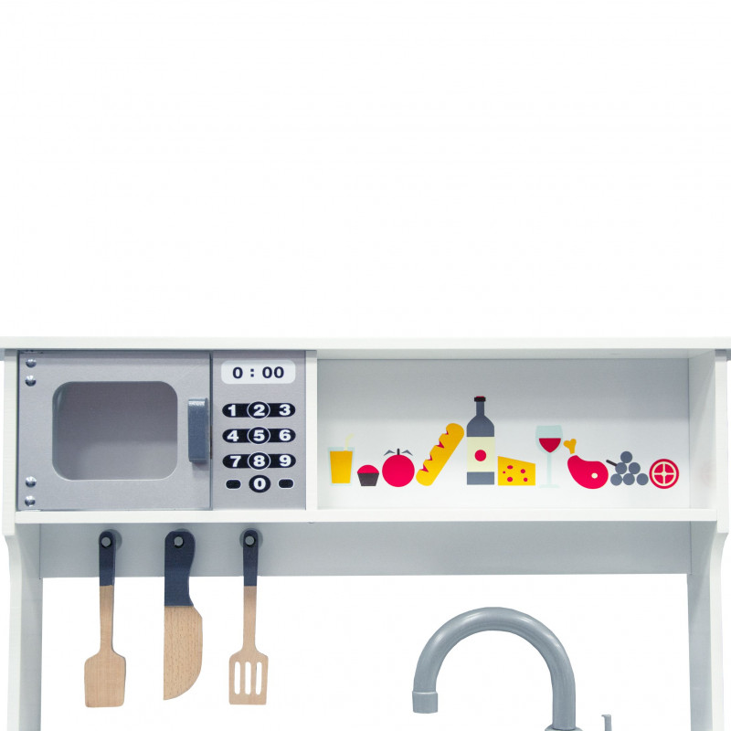 Žavi ir stilinga, universalaus dizaino virtuvėlė mažiesiems virtuvės šefams. Daug dėmesio skirta virtuvėlės dizainui ir detalėms bei priedams. Pagaminta iš aukščiausios kokybės medienos, kuri žavi šiluma, ilgaamžiškumu ir natūraliu grožiu. Durelės varstosi, kabliukai įrankiams pakabinti, įvairūs mediniai priedai (keptuvė ir puodas su dangčiu, mentelės) padės mažajam virėjui gaminti įvairius, gardžius patiekalus. Virtuvėlė neabejotinai suteiks džiaugsmo ir tuo pačiu skatins kūrybiškumą bei lavins vaizduotę.