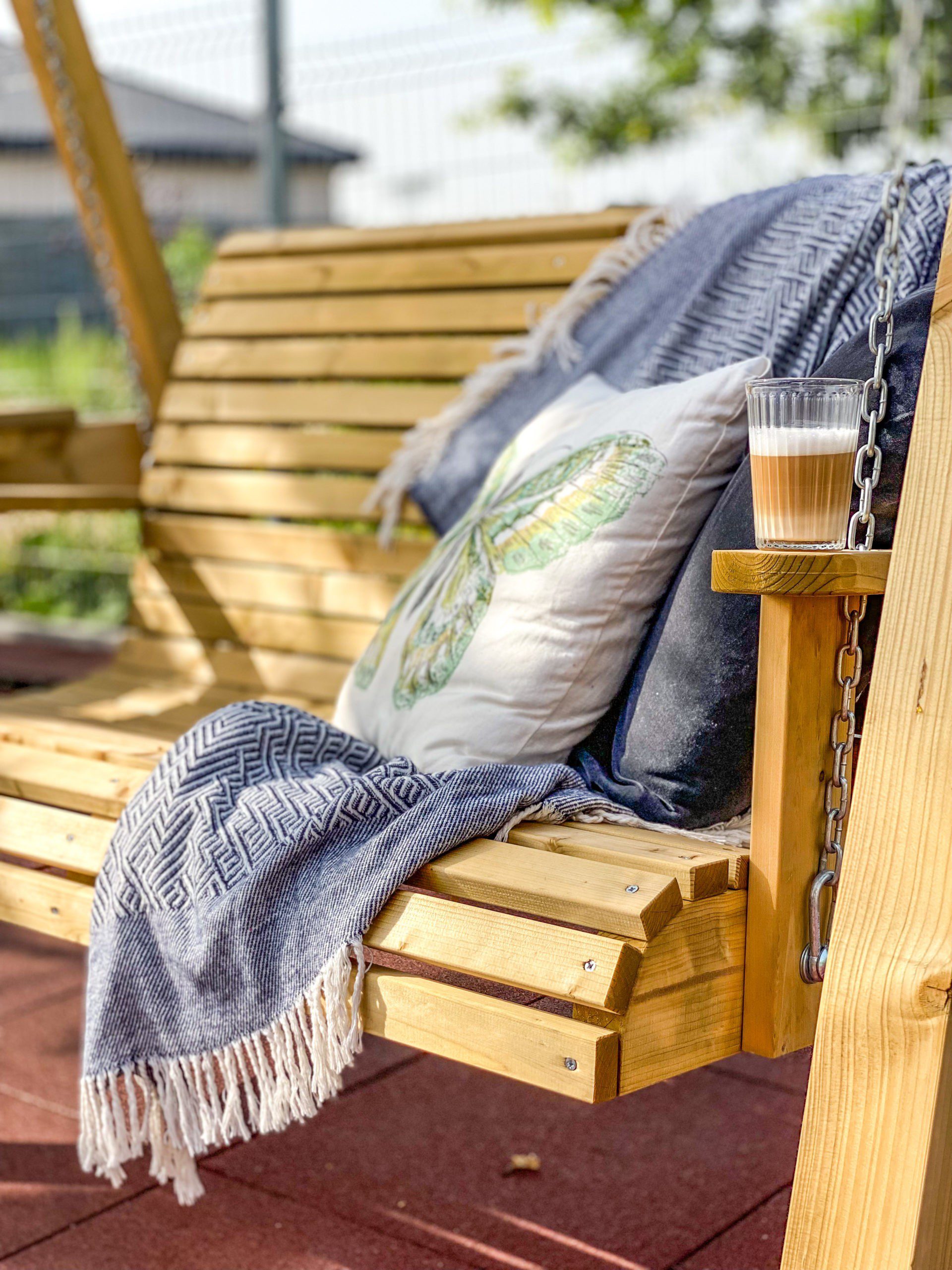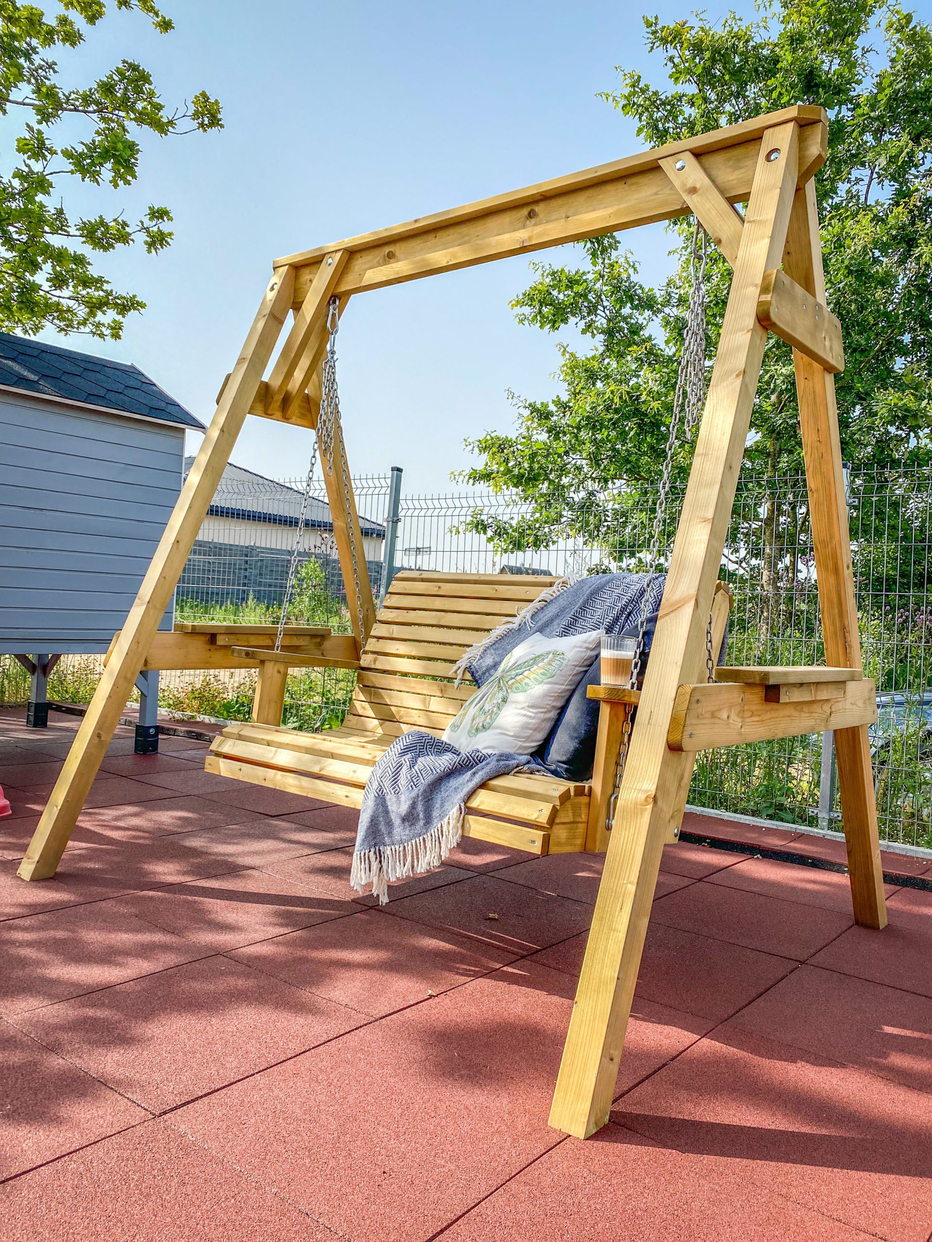 Surinkus sūpynes, būtina leisti medienai gerai išdžiūti, tuomet mediena įgauna rusvą atspalvį, o impregnanto likučiai nutrupa arba yra nesudėtingai nuvalomi. Rekomenduojame medines dalis nudažyti – tai taps tikra kiemo puošmena, o dažų sluoksnis sukurs papildomą apsaugą medienai ir sūpyne galėsite mėgautis dar ilgiau. Jei planuojate dažyti sūpynę – būtinai leiskite medienai pilnai išdžiūti, nerekomenduojame dažyti drėgnos medienos!