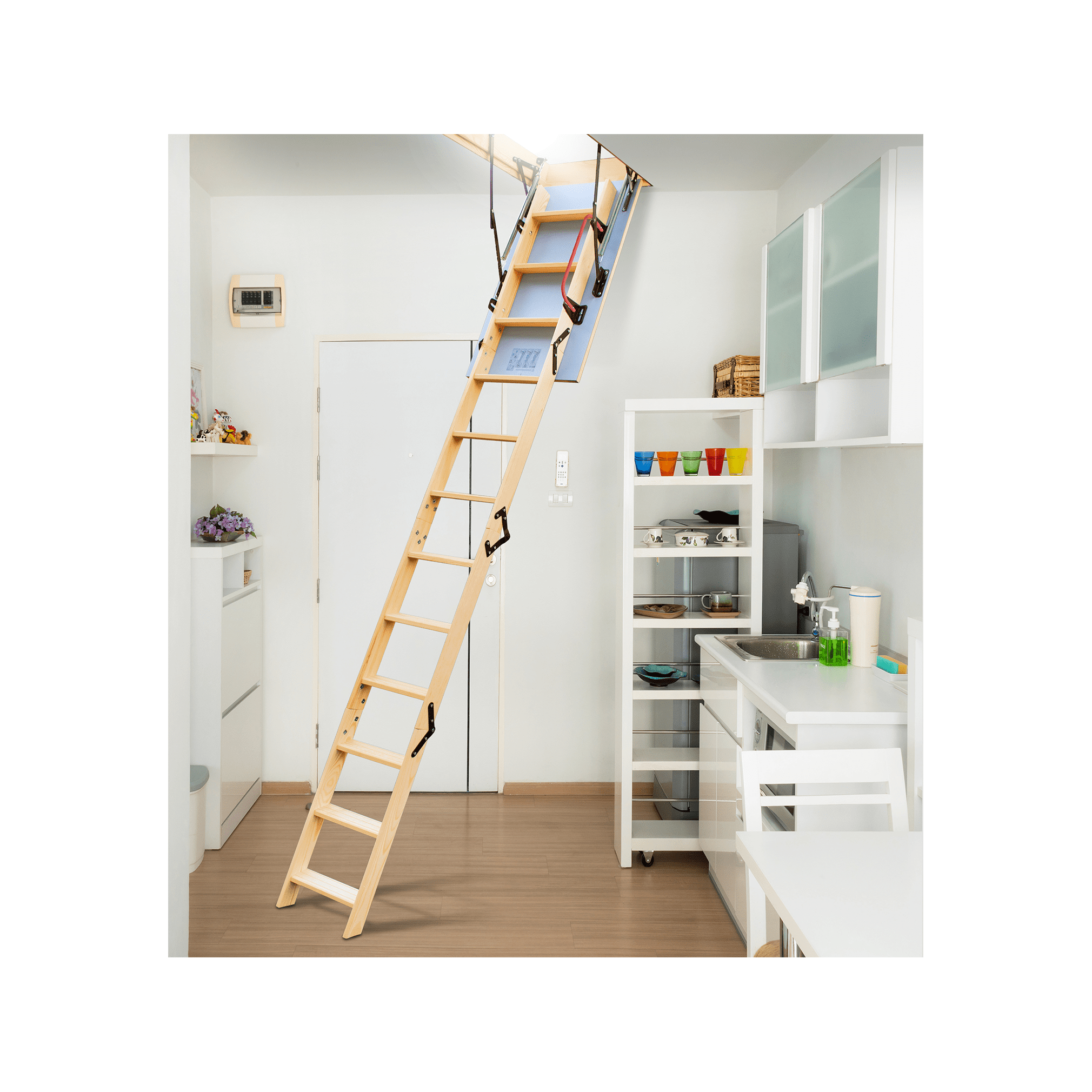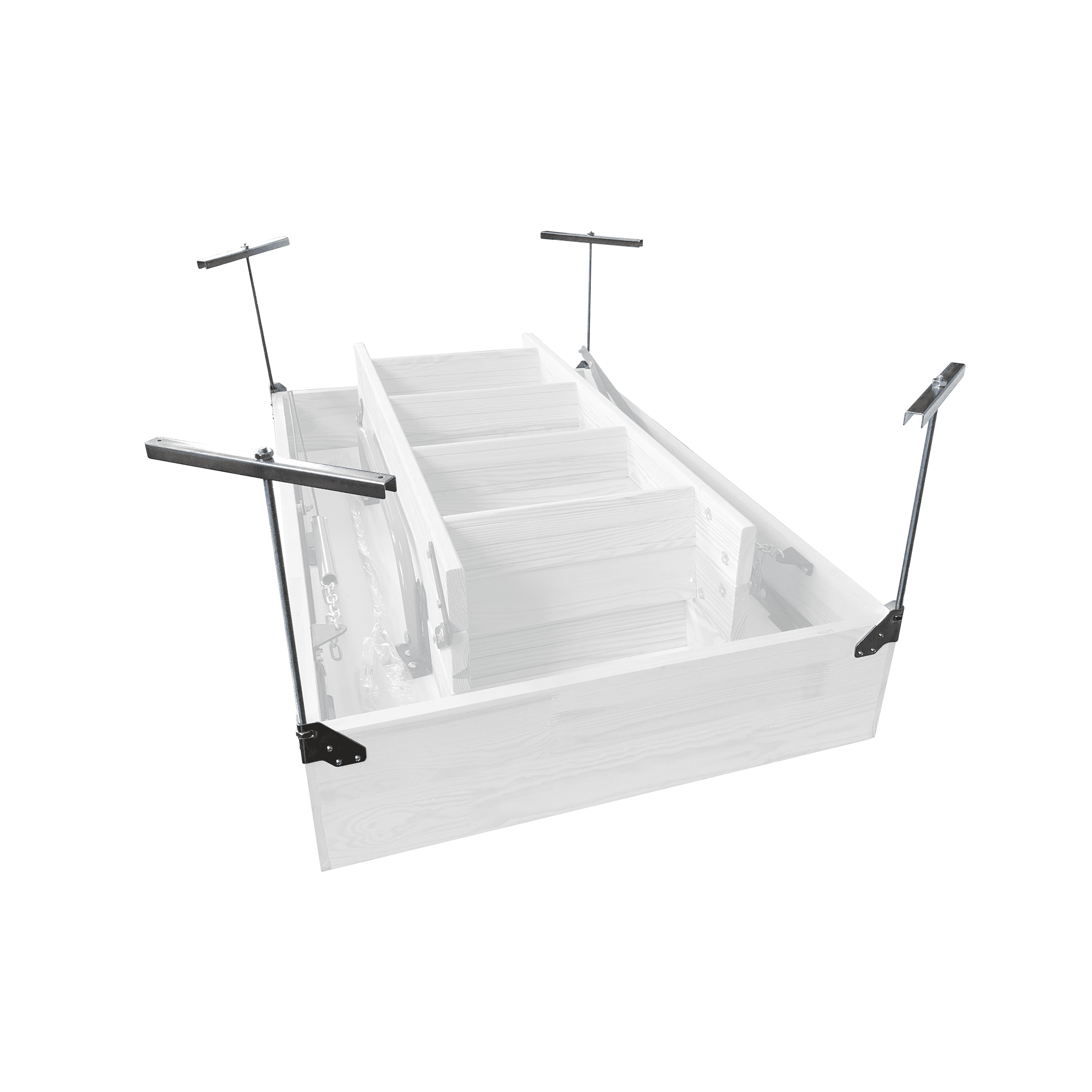 Dėžė – baltas izoliuotas dangtis iš abiejų pusių, laiptai – natūrali medžio |