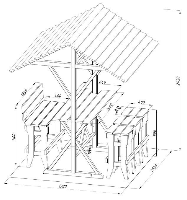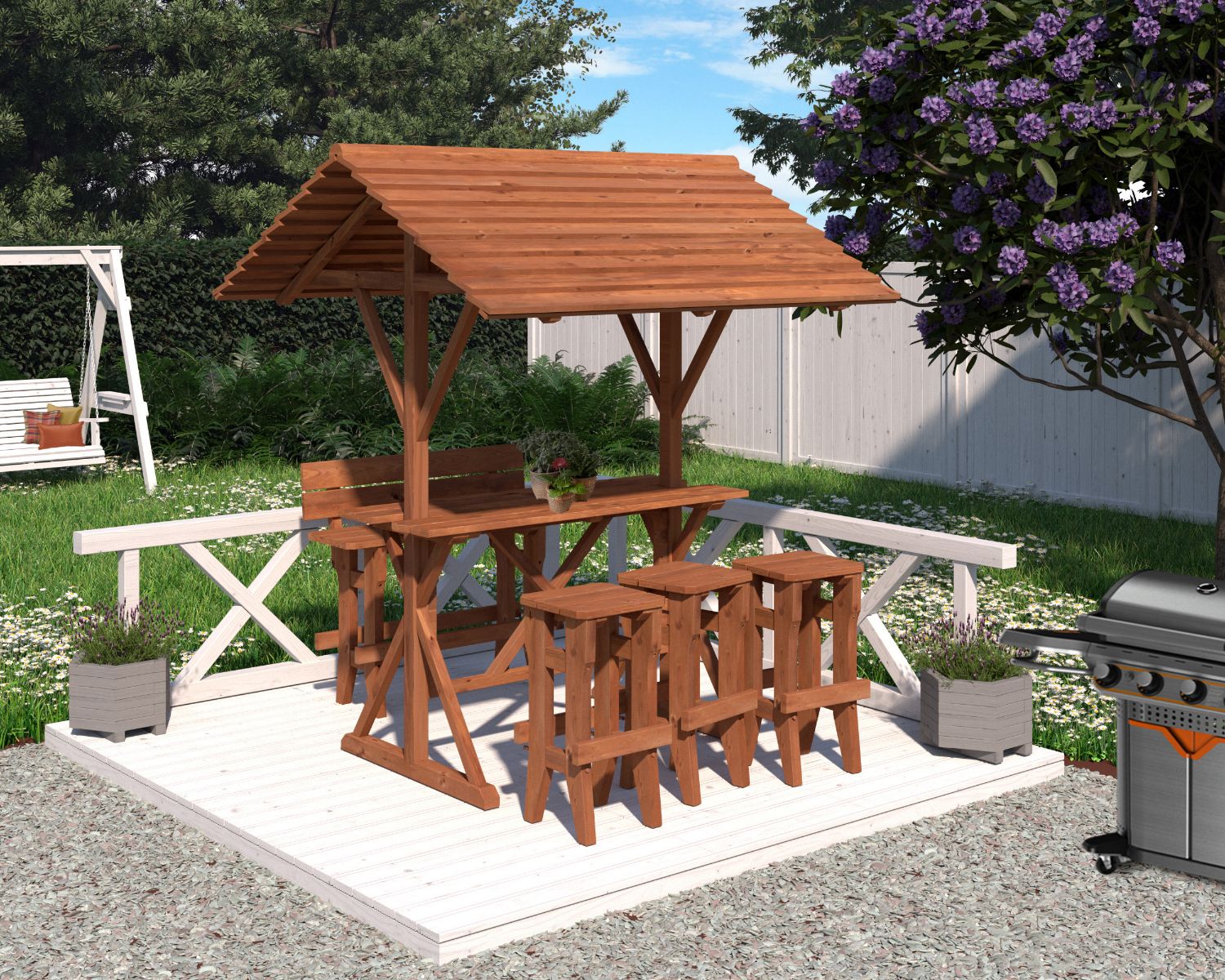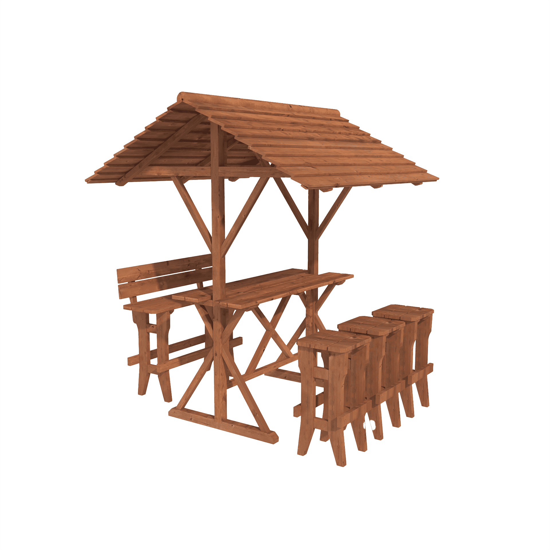 Komplektą sudaro aukštas stalas su stogeliu, 1 suolas ir 3 kėdės. Stogelis sukurs jaukų pavėsį karštą dieną ar apsaugos nuo trumpalaikio nedidelio lietaus. Rekomenduojame stalą tvirtinti į pagrindą.
