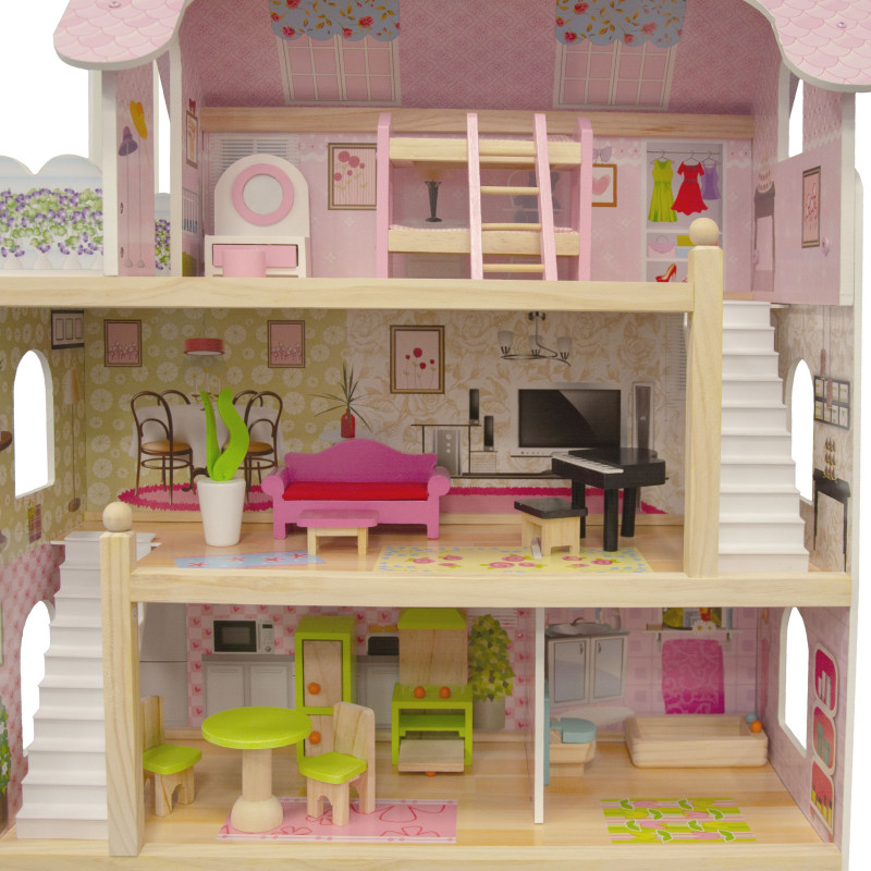 Medinis lėlių namelis yra puikus pasirinkimas norint lavinti vaikų vaizduotę bei kūrybiškumą. Dėl savo dydžio lėlių namelis atras vietą net ir mažiausiuose vaikučių kambariuose. Atskirose namelio erdvėse vaikai galės sukurti įvairius žaidimų scenarijus, išskirtines situacijas, kurios neabejotinai lavins fantaziją. Visos detalės pagamintos iš medžio bei nudažytos ekologiškais dažais. 3 aukštų medinį lėlių namelį sudaro 4 skirtingos patalpos. Šiame namelyje yra virtuvė, vonia, miegamasis bei svetainė. Taip pat namelis turi balkoną.