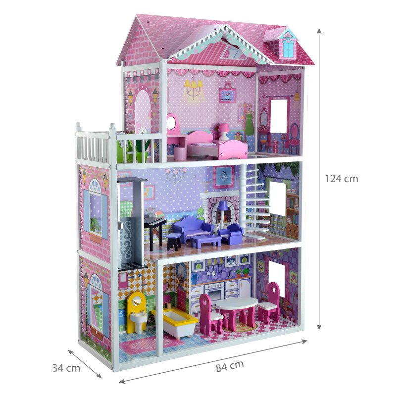 Medinis lėlių namelis yra puikus pasirinkimas norint lavinti vaikų vaizduotę bei kūrybiškumą. Šis 124 cm aukščio namelis taps tikra kambario puošmena bei smagiausia žaidimų erdve. Atskirose namelio erdvėse vaikai galės sukurti įvairius žaidimų scenarijus, išskirtines situacijas, kurios neabejotinai lavins fantaziją. Visos detalės pagamintos iš medžio bei nudažytos ekologiškais dažais. 3 aukštų medinį lėlių namelį sudaro 4 skirtingos patalpos. Šiame namelyje yra virtuvė, vonia, miegamasis bei svetainė. Taip pat namelis turi balkoną bei liftą.