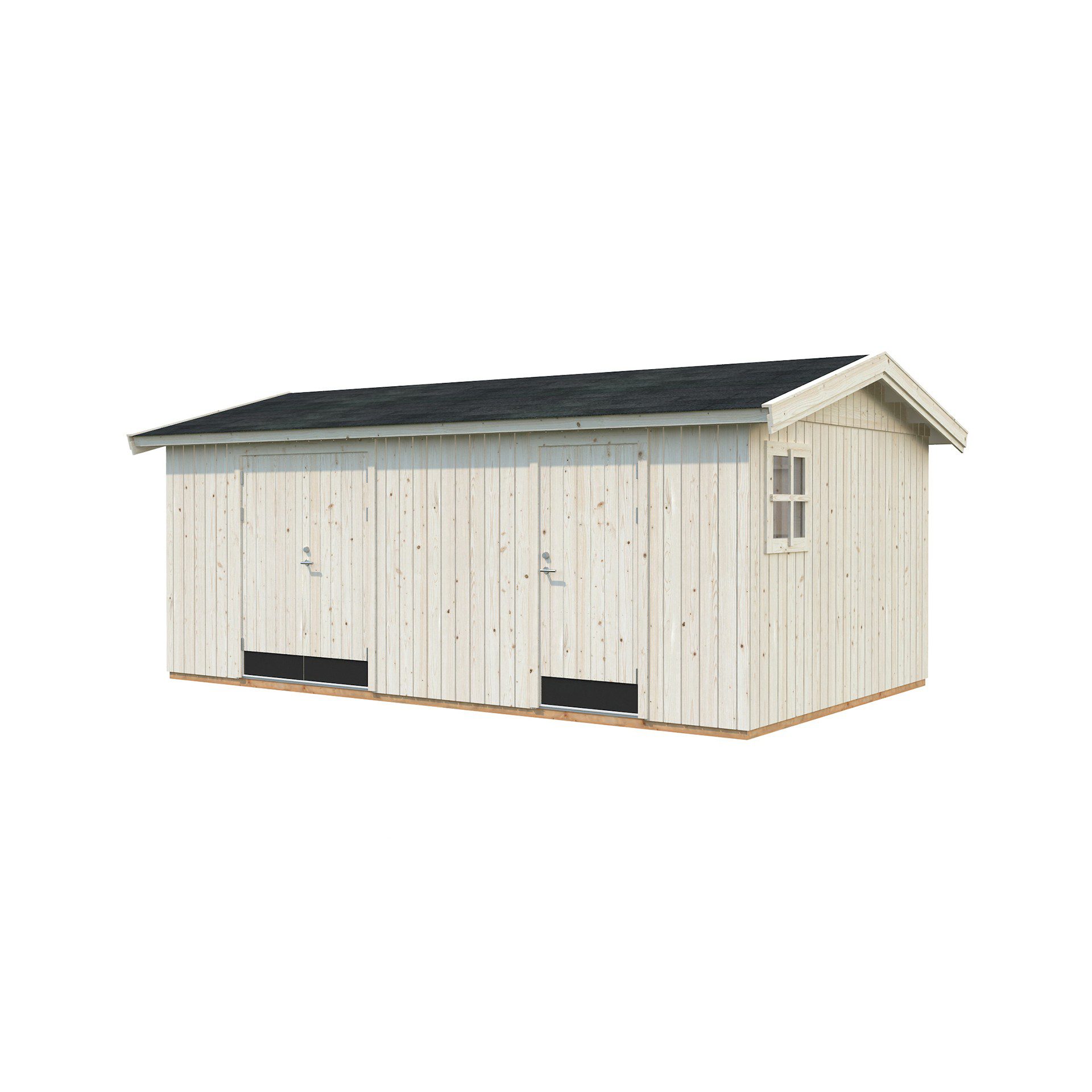 LANGAI IR DURYS. Komplektacijoje yra du durų komplektai – vienos standartinės 78 x 181 cm, kitos plačiai atveriamos 138 x 181 cm. Abiejų durų konstrukcijoje yra 32 mm EPS šilumos izoliacinė medžiaga suteikianti apsaugą nuo drėgmės ir vėjo. Durys apačioje padengtos metaline apsauga dažyta juodais matiniais dažais. Durų rėmas yra pagamintas iš laminuotos medienos, kartu komplektuojamas su kietmedžio slenksčiu. Durys rakinamos cilindriniu užraktu. Mažesnioji patalpa įstiklinta 4 mm viengubo stiklo neatidaromu langu 51 x 55 cm, kuris suteikia natūralų apšvietimą viduje.