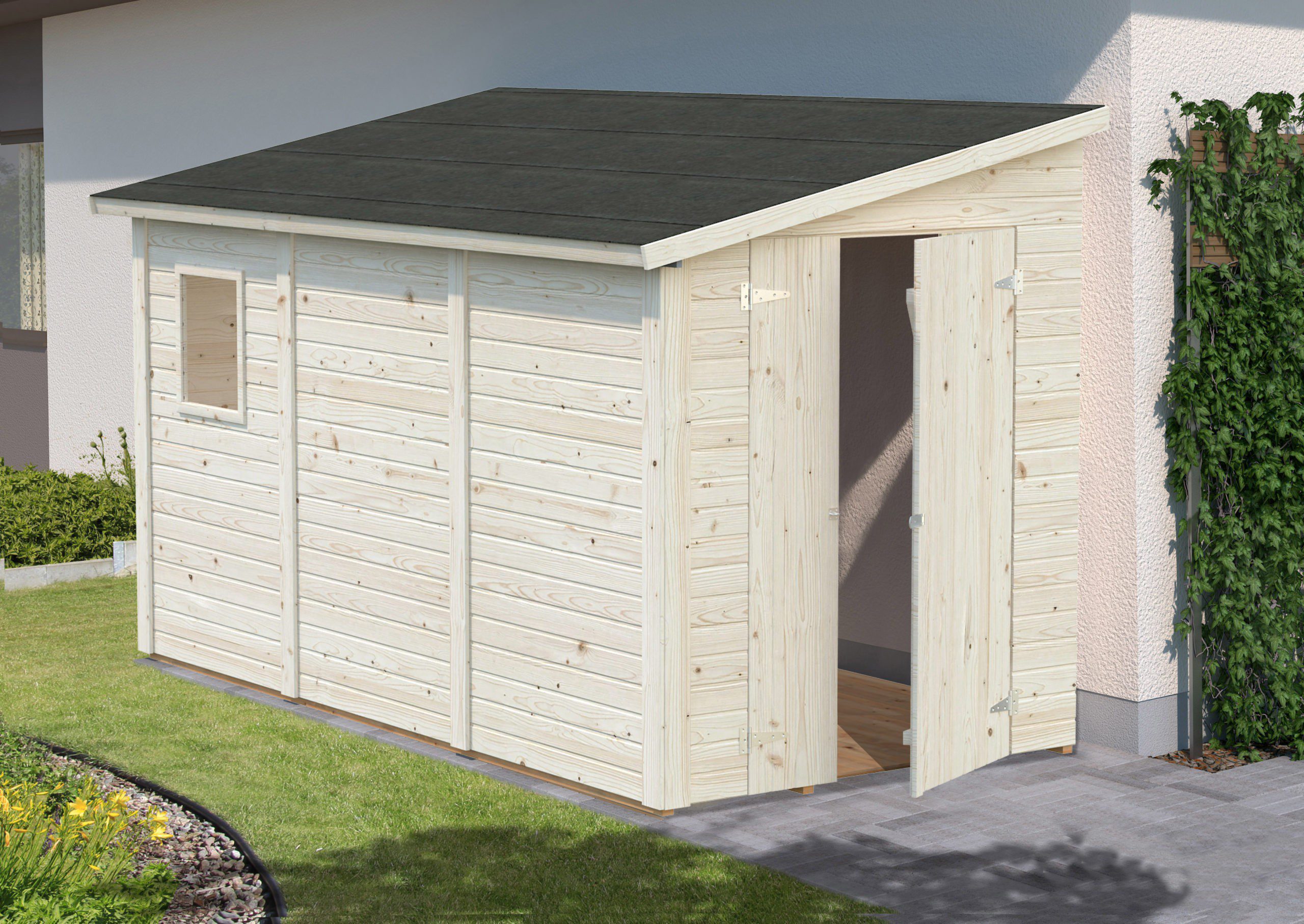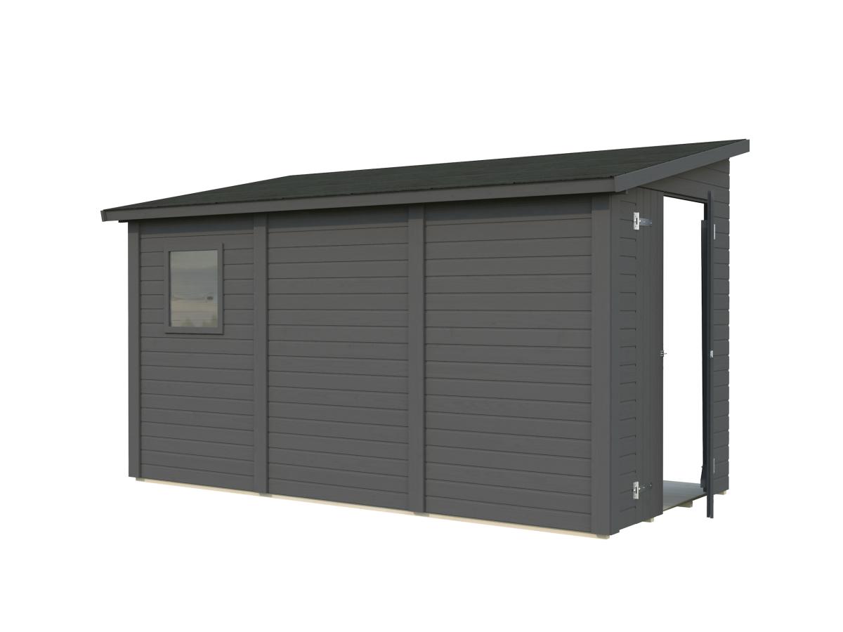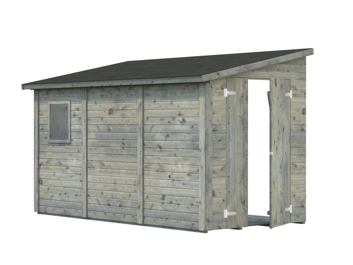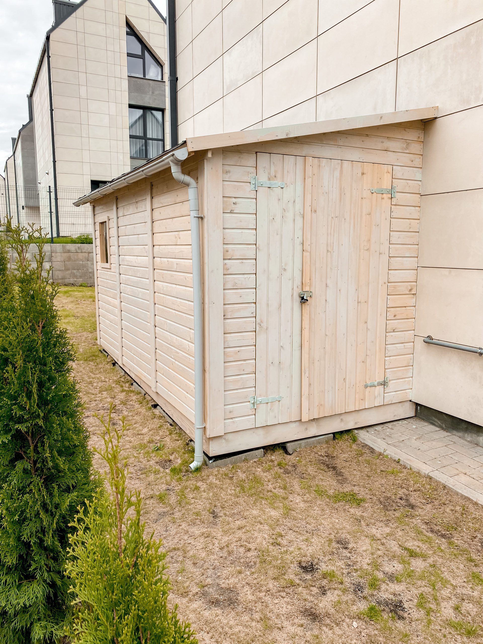 SIENOS. Sienų konstrukcija susideda iš jau paruoštų surinkti sienų elementų. Sienų lentų storis 16mm. Sandėliukas neturi šoninės sienos, nes yra jungiamas prie kito pastato sienos.