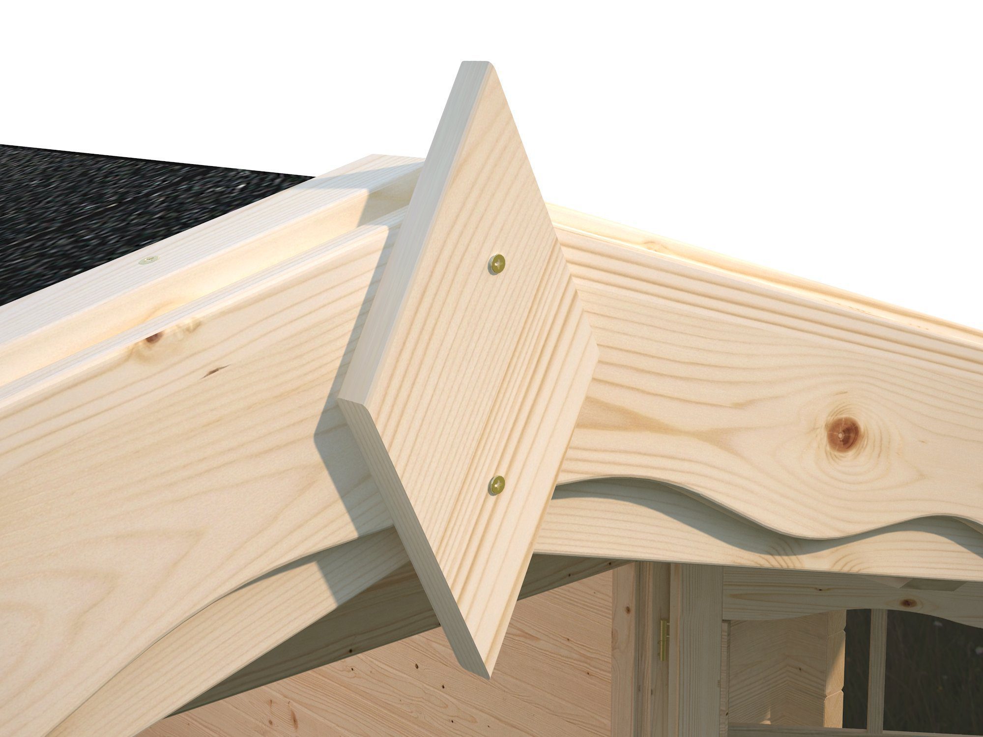 STOGAS. Stogas kalamas iš 19 mm neimpregnuotos spygliuočių medienos lentų, turinčių išdrožas ir įlaidas (špuntus) greitam ir kokybiškam surinkimui. Siekiant gaminį išsaugoti kuo ilgiau, rekomenduojama stogą dengti bituminėmis stogo čerpelėmis (komplektacijoje nėra). Visam stogo plotui uždengti, rekomenduojamas bituminių čerpelių kiekis – 10 pakuočių.