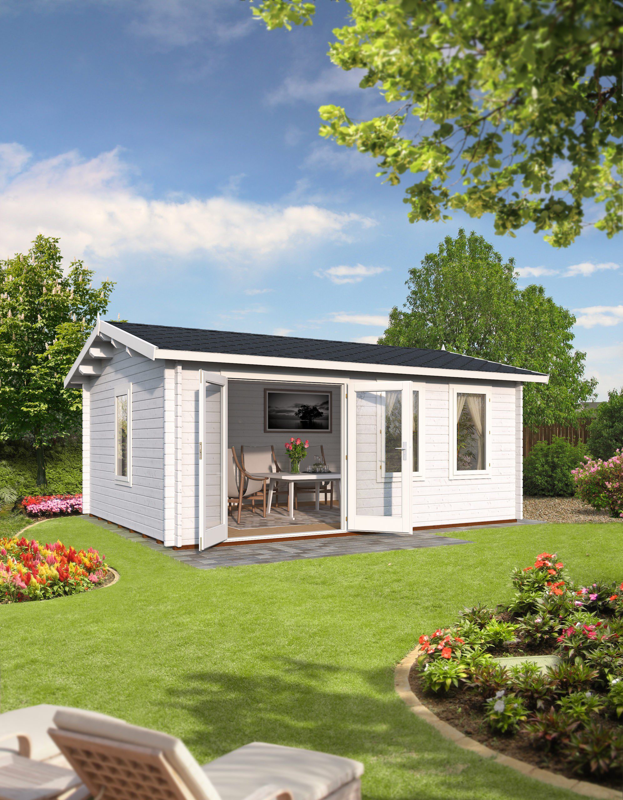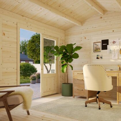 Modernaus dizaino medinis sodo namelis „Irma“19,1 m2 – puikus pasirinkimas Jūsų poilsiui. Šiais laikais itin populiarėja didesni ir erdvūs sodo nameliai, skirti ne tik susidėti ir laikyti sodo daiktus ne sezono metu, bet ir praleisti juose ilgesnius savaitgalius. Itin stilingas, primenantis poilsinius namelius ar vasarnamius šiltojo sezono praleidimui. Tokio tipo nameliai labai mėgstami turint vaizdingas vietoves aplink, nes turi daug langų pro kuriuos galima stebėti gamtą, bei sezono pasikeitimus. Kadangi namelio sienos storos medienos, langai dvigubi, pasistačius šildytuvą sodo namelis galėtų būti naudojamas nuo ankstyvo pavasario iki vėlyvo rudens. Tai gali būti itin jauki vieta darbui kai reikia pabėgti nuo namų šurmulio ir susikaupti, sugeneruoti naujas idėjas ar padaryti svarbius sprendimus. Namelyje galite pailsėti po intensyvesnių sodo darbų, ar tiesiog praleisti laiką savo malonumui. Galiausiai toks namelis būtų puikus traukos centras susitikti šiltais vasaros vakarais su šeima bei draugais prie grilyje ruoštos vakarienės. Namelis gali stovėti ne tik jūsų sode, bet ir kaimo sodyboje ar ežero pakrantėje, kur galėsite maloniai ir komfortiškai leisti savo laisvalaikį. Šis šiuolaikiškas medinis sodo namelis suteiks galimybę turėti uždarą, širdžiai mielą erdvę su plačiai atidaromomis durimis bei langais, leis grožėtis vaizdu ir šiltu vasaros oru.