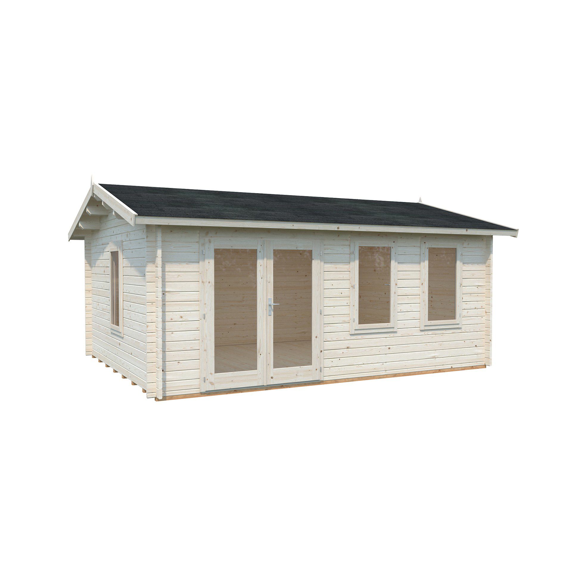 - Šiaurinių spygliuočių medienos 44 mm sienojai, 19 mm grindlentės ir 19 mm stogo lentos.