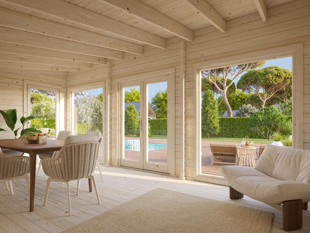 LANGAI IR DURYS. Dvigubo grūdinto stiklo panoraminiai langai 4-9-4 mm per visą namelio aukštį, kurių rėmas 143 x 194 cm pagaminti iš medžio masyvo. Iš šono esantis 82 x 198 cm langas gali būti atidaromas į vidų, į viršų arba praveriant langą minimaliai mikroventiliacijai, reguliuojamas atidarymo kampas. Plačiai atidaromų durų rėmas 148 x 203 cm yra pagamintas iš laminuotos medienos, kartu komplektuojamas su nerūdijančiu plienu dengtu durų slenksčiu. Durys rakinamos cilindrine spyna, įstiklintos dvigubu grūdintu 4-9-4 mm stiklu. Tiek langų, tiek durų rėmai su gumos ir silikono sandarinimu, langai su įmontuotais aliuminiais vandens surinkimo latakais.