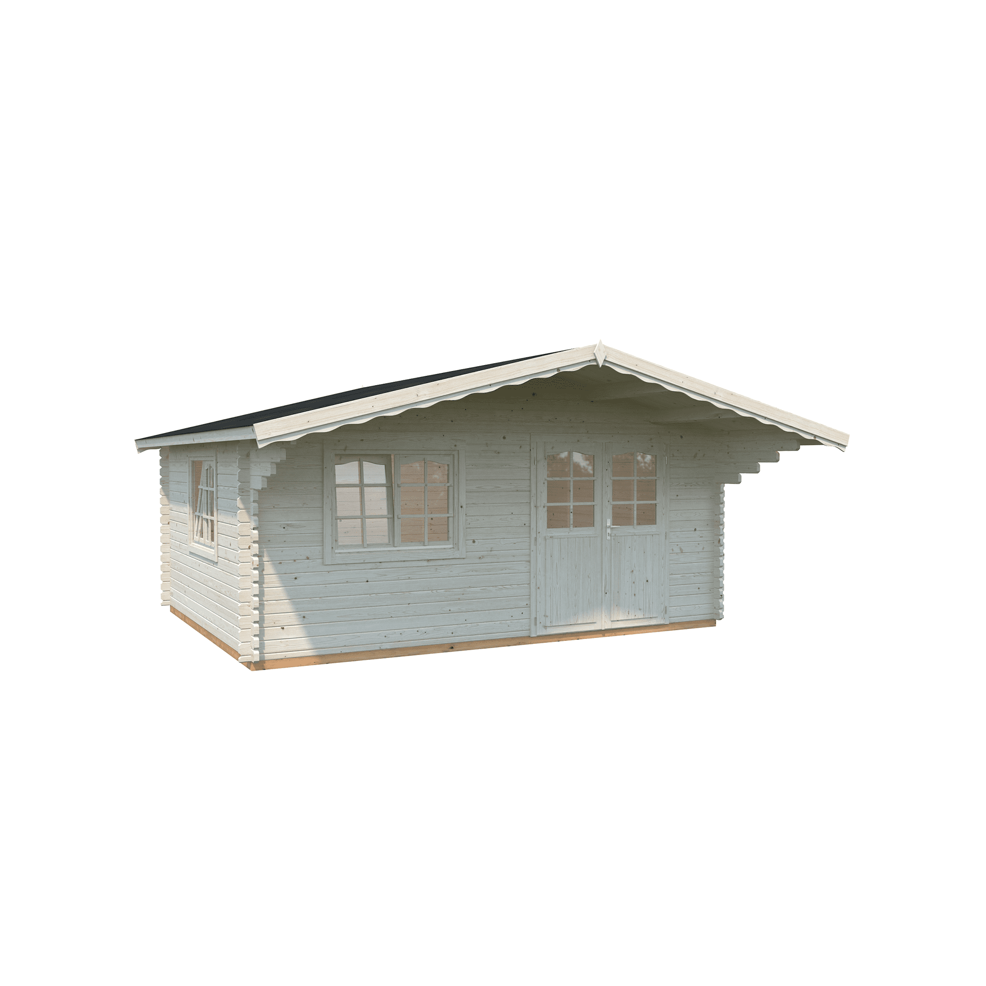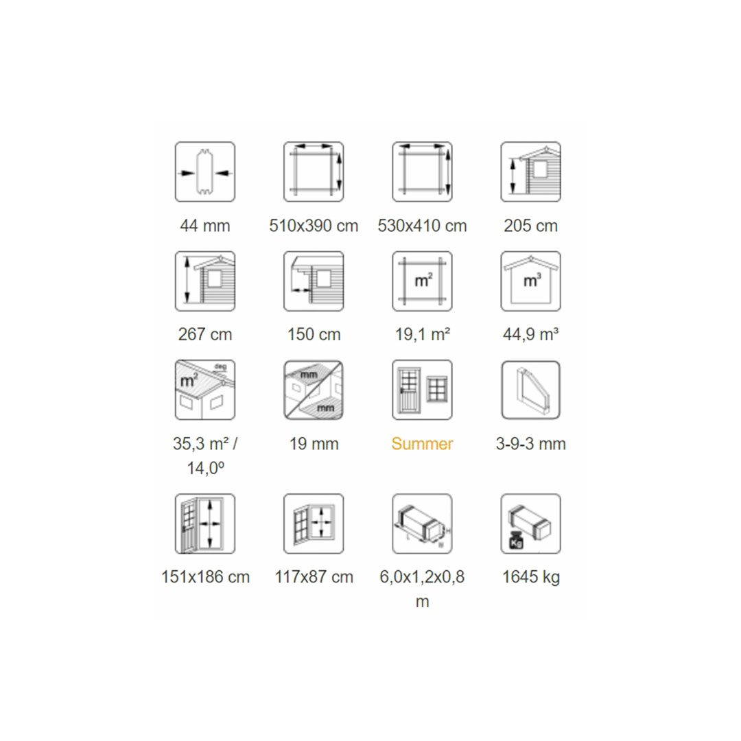 - Šiaurinių spygliuočių medienos 44 mm sienojai, 19 mm grindlentės ir 19 mm stogo lentos.