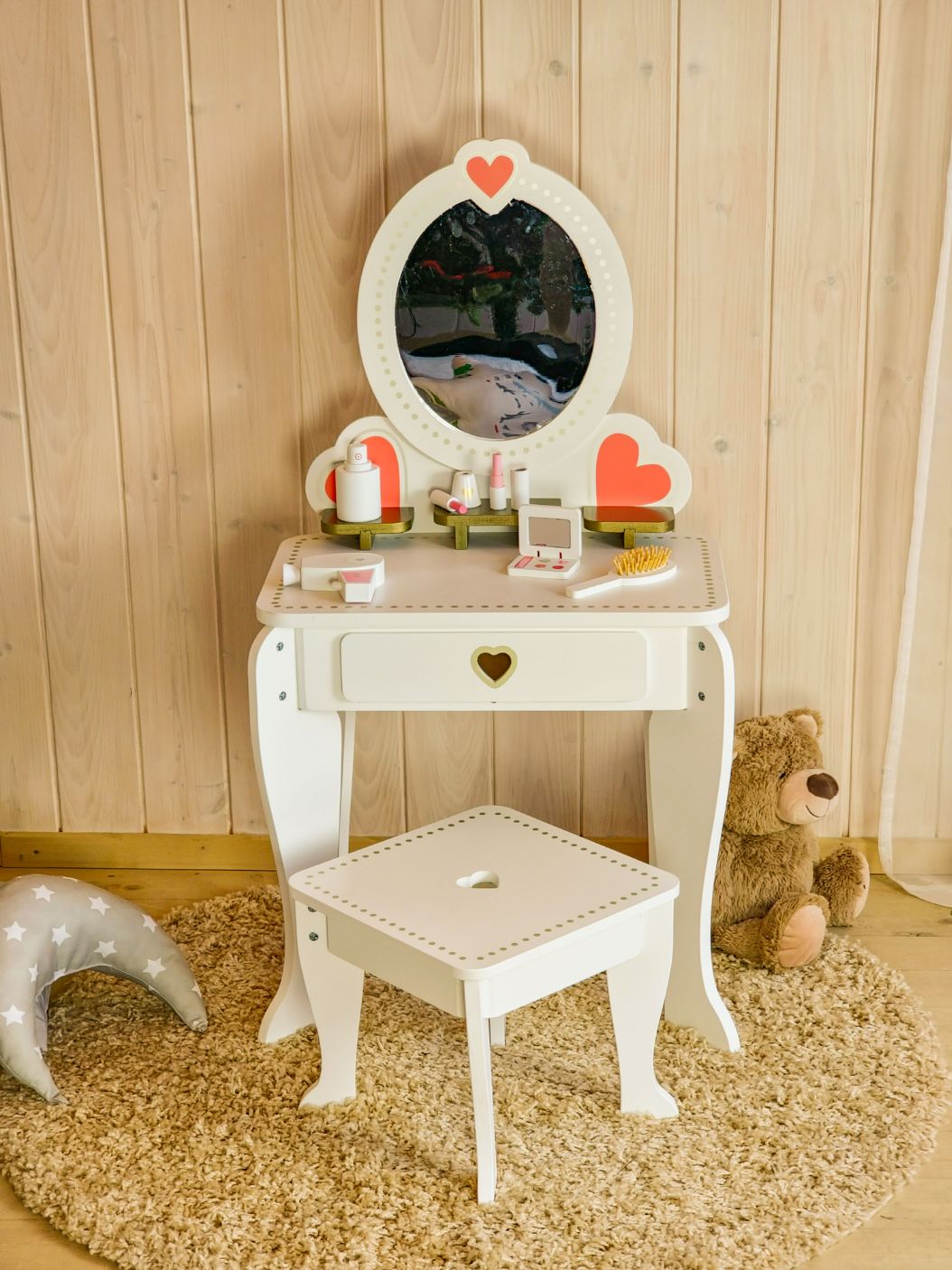 Kiekvienos mergaitės svajonė turėti savo grožio kampelį, kuriame ji galėtų pasijausti tarsi tikra princesė. Išskirtinio dizaino bei dailaus atspalvio kosmetinis staliukas nudžiugins kiekvieną mergaitę bei derės bet kokiame interjere. Kosmetinis staliukas dekoruotas raudonomis širdelėmis. Šis kosmetinis staliukas turi didelį veidrodį bei kėdutę. Taip pat komplektacijoje yra daug priedų. Visus grožio reikmenis bei žaisliukus galima patogiai išdėlioti ant didelio stalviršio ar susidėti į stalčių. Visi elementai nudažyti vaikams bei aplinkai nekenksmingais dažais.
