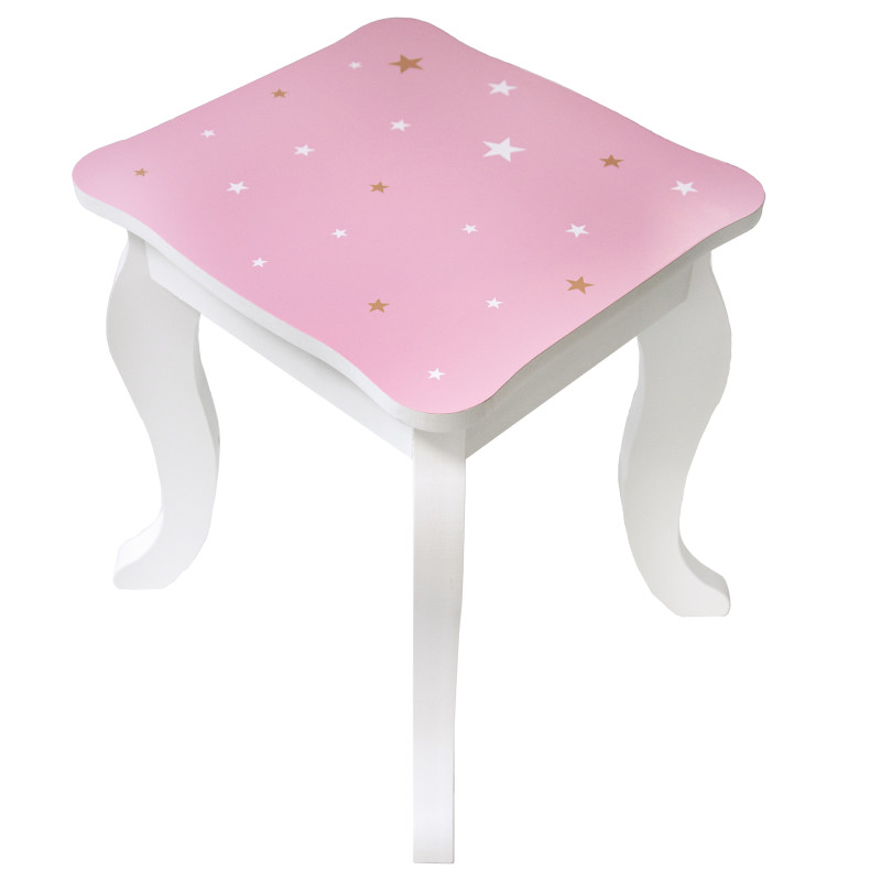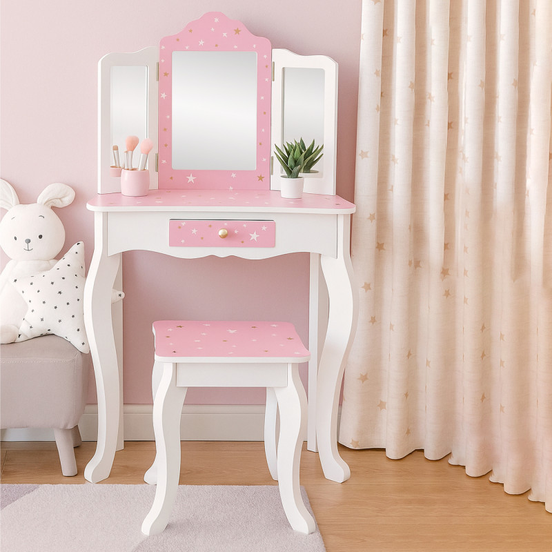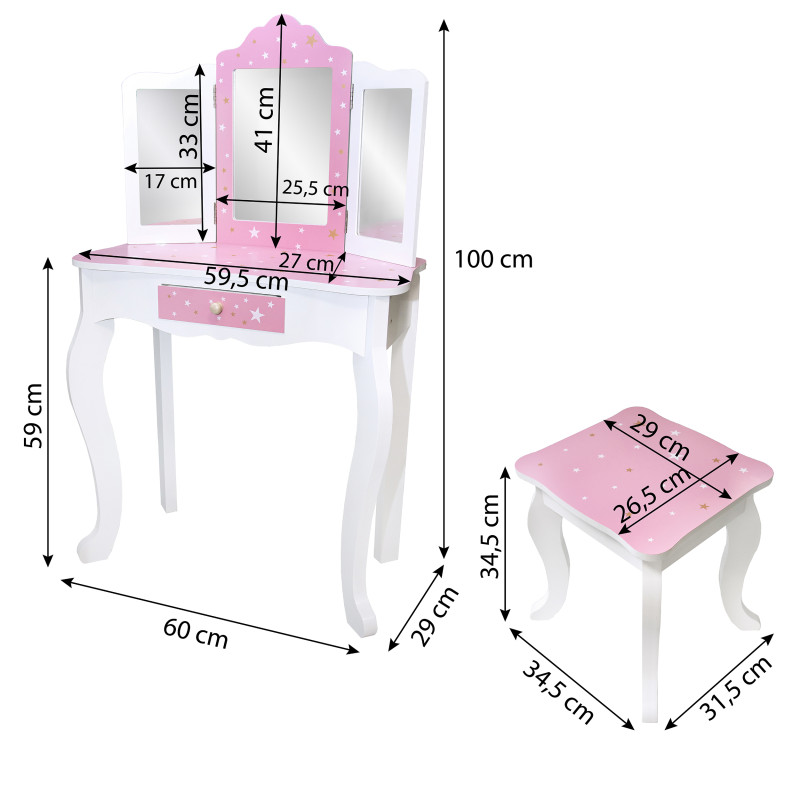 Tikra mažosios princesės svajonė! Žvaigždėmis dekoruotas komplektas neabejotinai patiks mergaitėms, kurios nori turėti grožio staliuką savo priemonėms susidėti. Puikiai tiks prie kitų kambario baldų. Staliukas su atidaromu stalčiumi, bei trijų dalių išlankstomu veidrodžiu.
