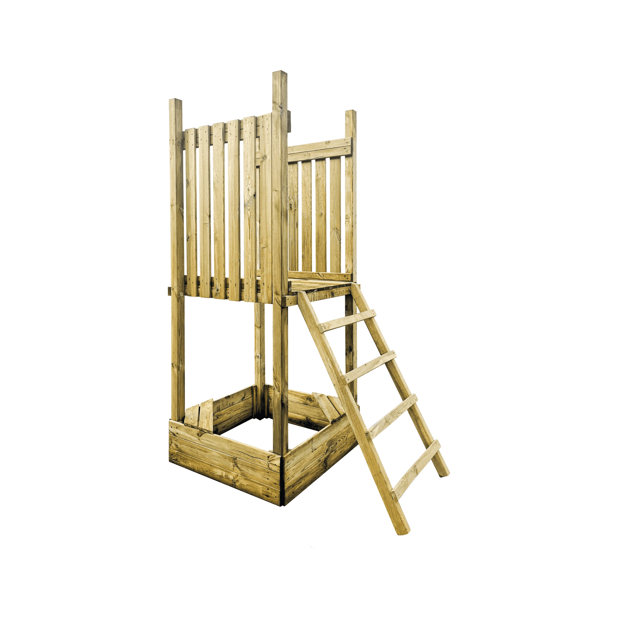 Medinis vaikų žaidimų bokštelis padės sukurti išskirtinę vaikų žaidimų erdvę! Šį modulį galima sujungti su kitais mūsų siūlomais mediniais sūpynių moduliais C, D ir E. Šis vaikų žaidimų aikštelės modulis itin universalus – bokštelio apačioje numatyta viena smėliadėžei, o taip pat prie šio modulio gali būti prijungiama 220cm čiuožykla, medinė laipiojimo sienelė su 5 kybiais, medinis tiltelis bei kiti priedai.