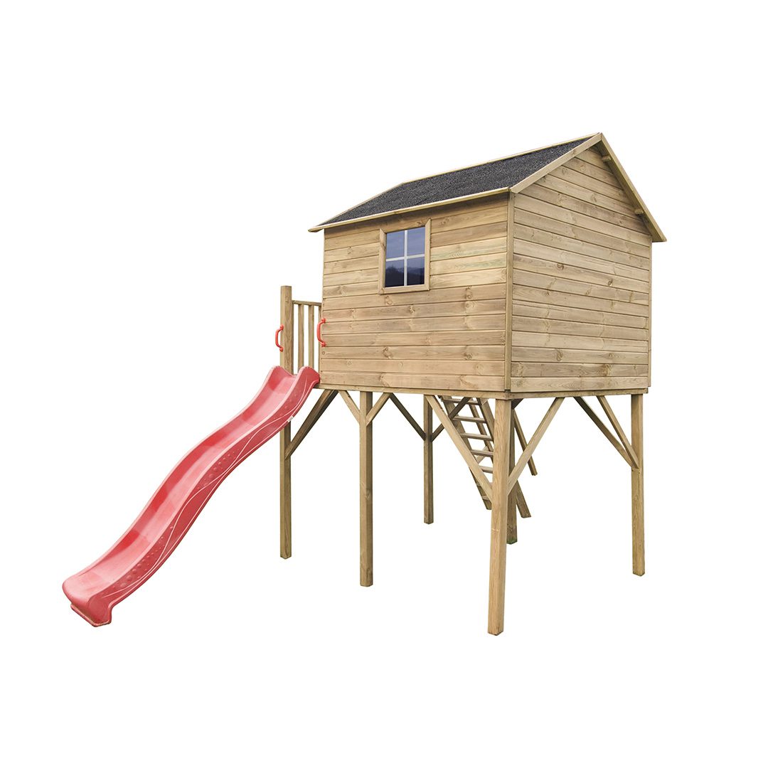 - Komplektacijoje nėra čiuožyklų, nuotraukose parodyta kaip gali atrodyti namelis su čiuožyklomis. Šiam nameliui gali būti papildomai tvirtinama 290 cm ilgio čiuožykla.