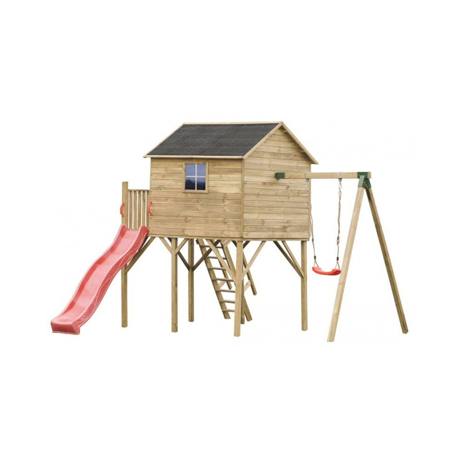 PASTABA! Nameliai pristatomi nesurinkit ir nenudažyti. Nuotraukose parodyta kaip gali atrodyti pastatytas bei nudažytas namelis. Sūpynių spalva gali skirtis nuo matomų nuotraukoje.