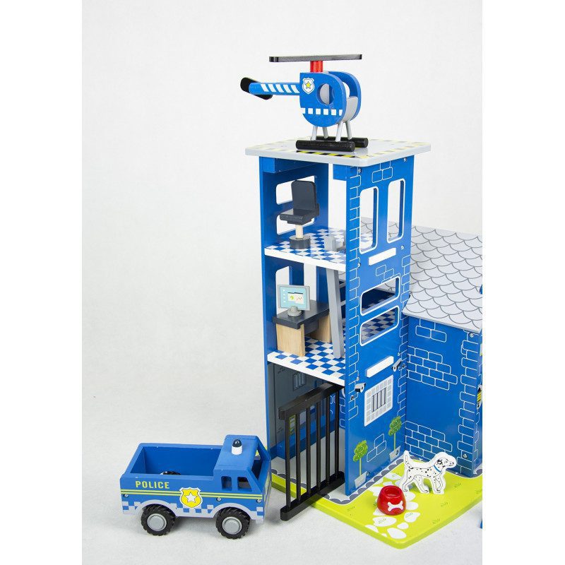 Mėlynoji policijos nuovada yra ideali pramogų ir mokymosi priemonė. Vaikai žaisdami jausis tikrais policininkais! Komplektas pagamintas iš aukštos kokybės medienos, kuri užtikrina saugų žaidimą ilgą laiką. Pagrindinį pastatą sudaro bokštas, kuris žaidimo metu gali būti naudojamas kaip komplekte esančio sraigtasparnio nusileidimo aikštelė.