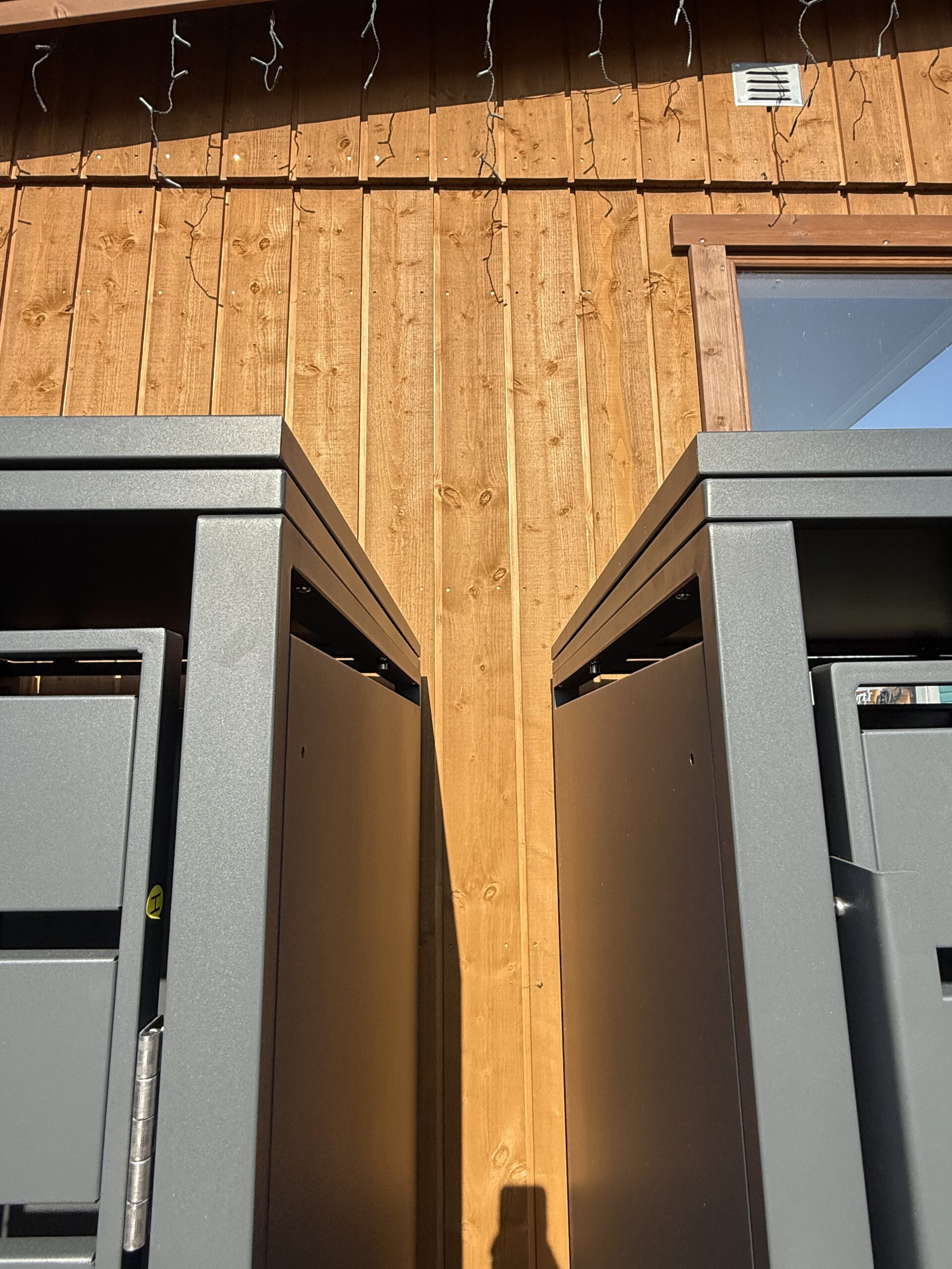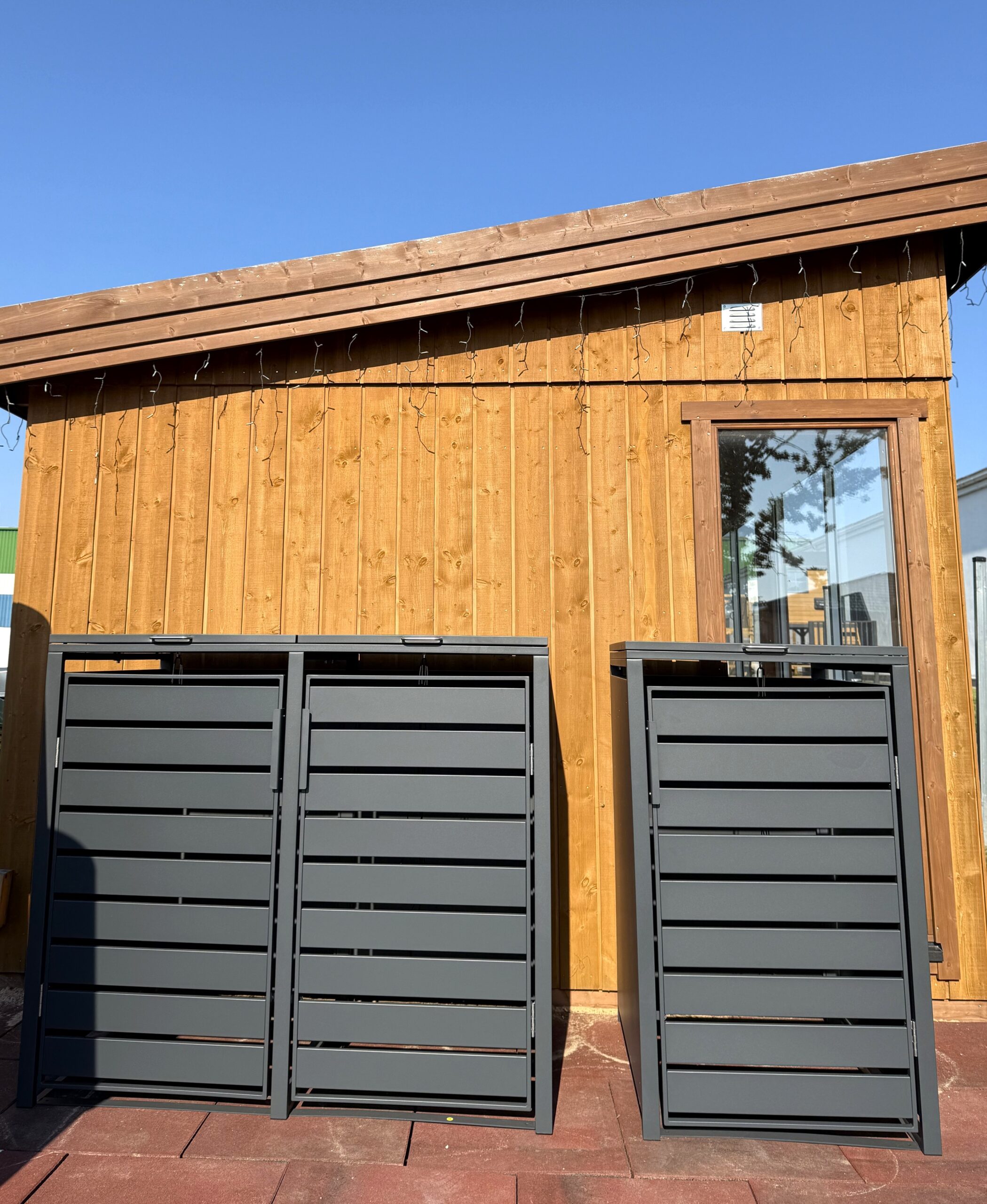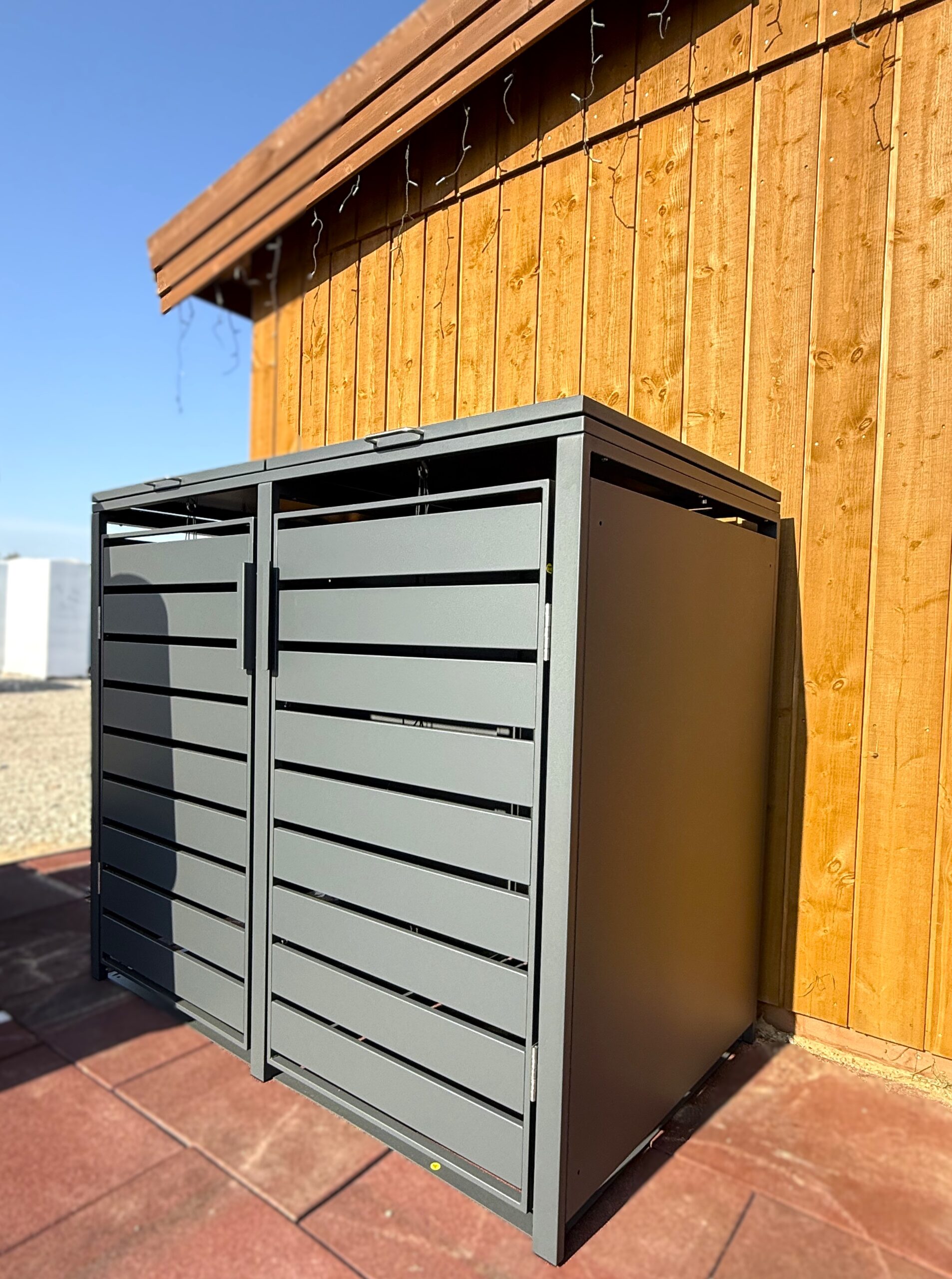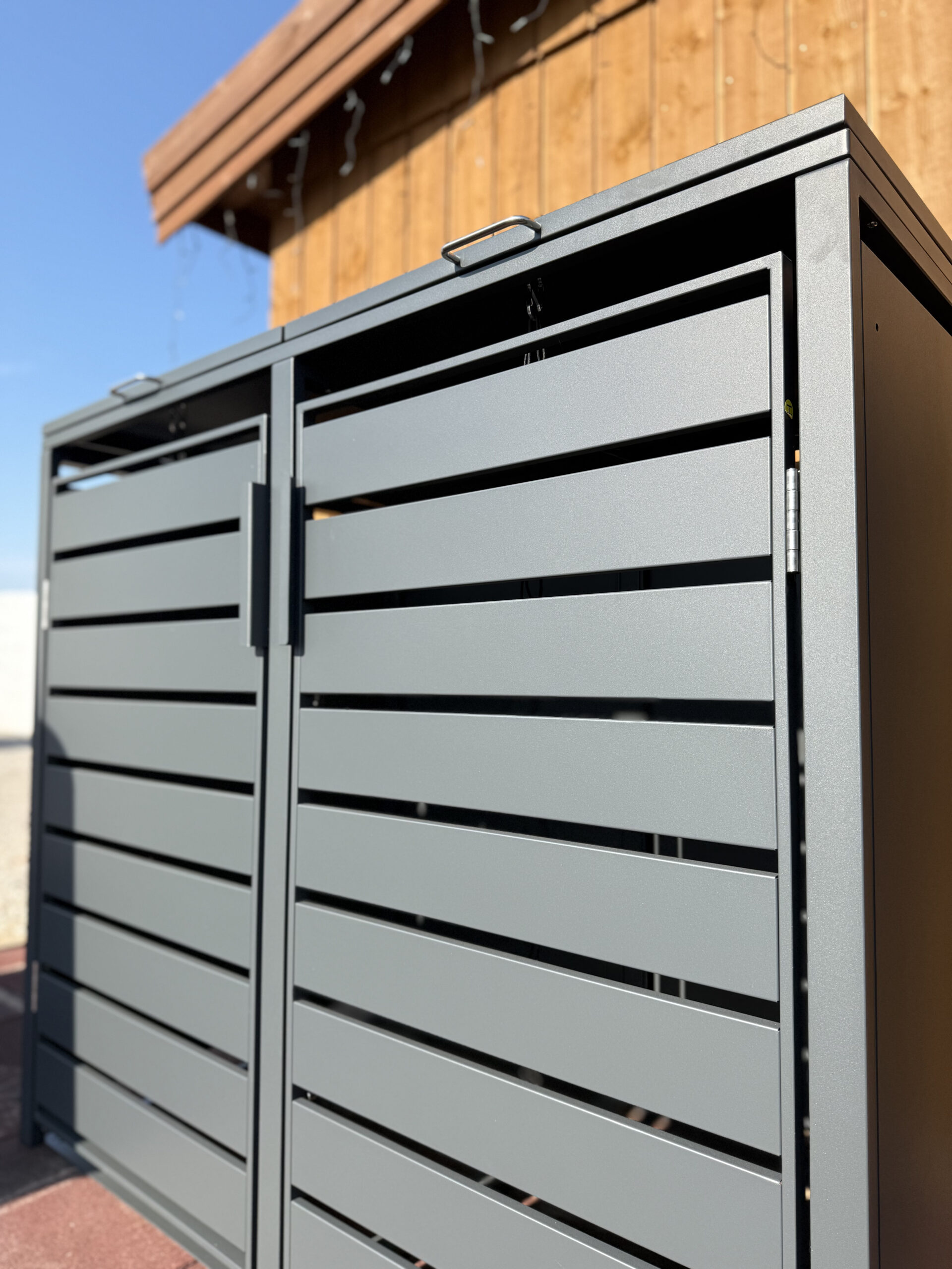 Ši dviguba konteinerio stoginė – tai ilgaamžis ir estetiškas sprendimas dviem buitiniams konteineriams paslėpti. Pagaminta iš cinkuotos skardos ir nerūdijančio plieno, ši stoginė užtikrina tvirtumą, ilgaamžiškumą ir puikiai dera prie bet kokios aplinkos. Idealus pasirinkimas ieškantiems tvarkos, patvarumo ir estetikos lauko erdvėje. Dvigubos talpos stoginėje tilpa du konteineriai – 60L, 120L arba 240L talpos.